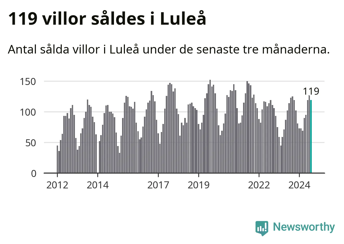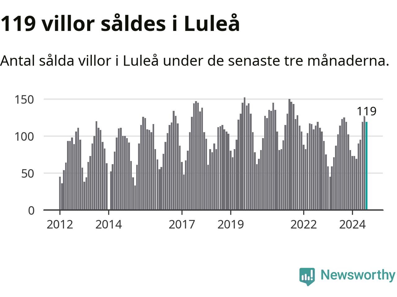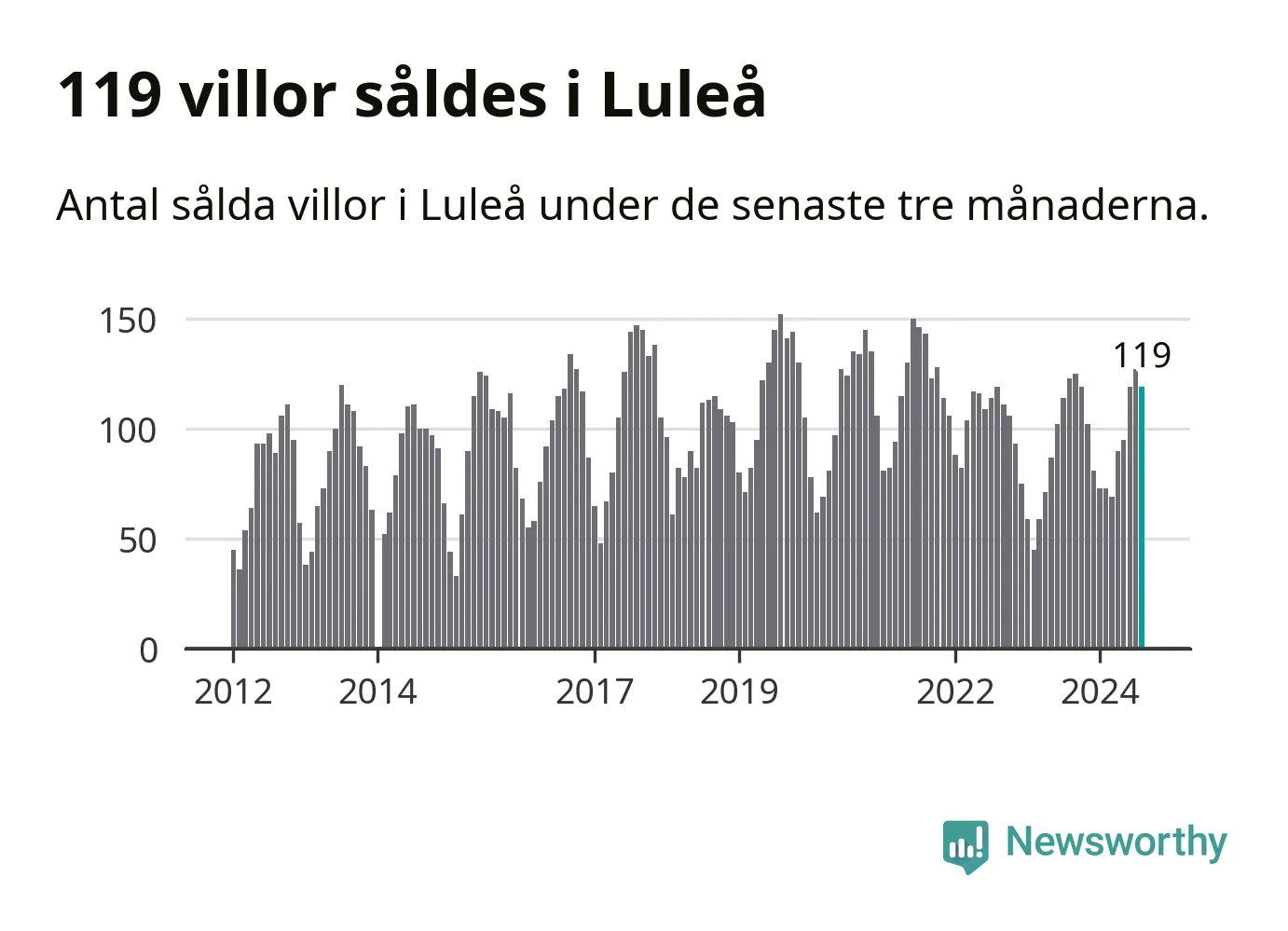 Sammanlagt såldes 119 villor i Luleå kommun mellan juni och augusti till ett genomsnittligt pris på 3,1 miljoner kronor. I fjol gjordes 123 affärer vid den här tiden på året.