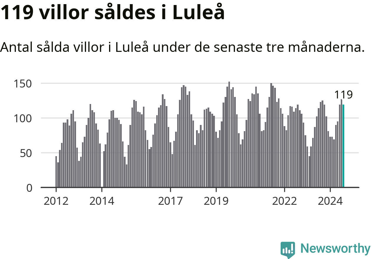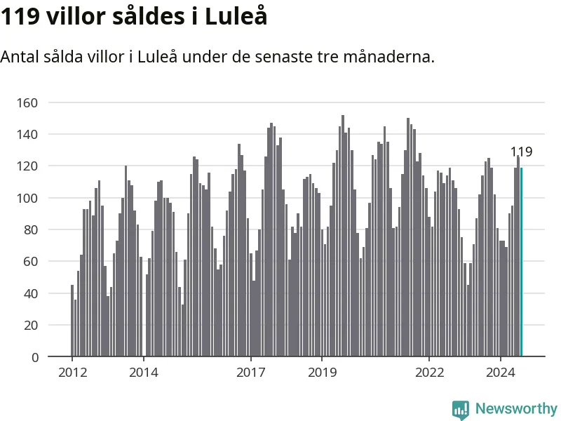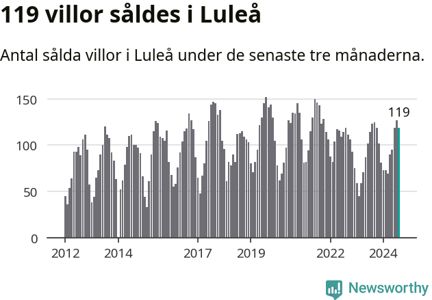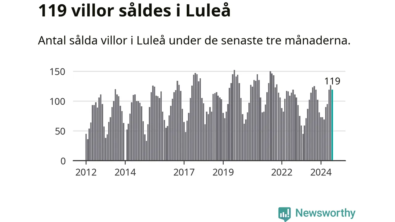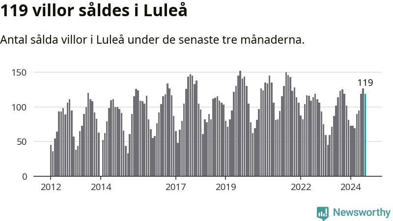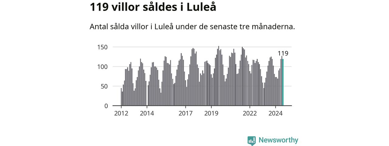 Sammanlagt såldes 119 villor i Luleå kommun mellan juni och augusti till ett genomsnittligt pris på 3,1 miljoner kronor. I fjol gjordes 123 affärer vid den här tiden på året.