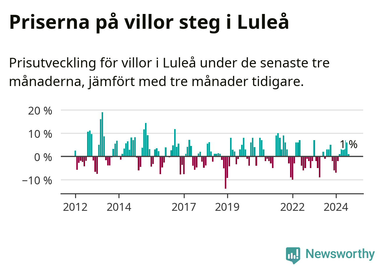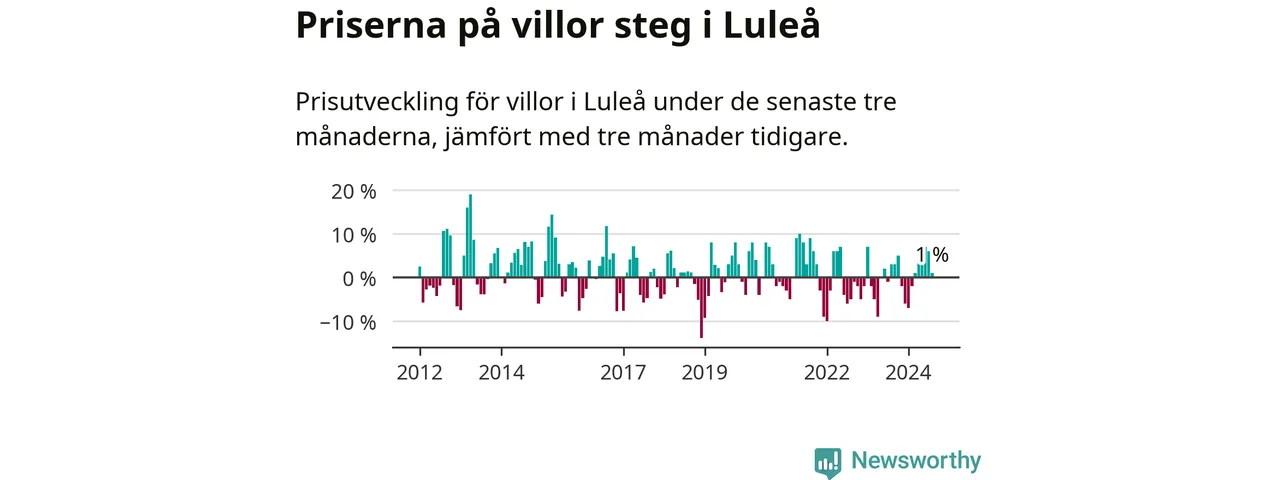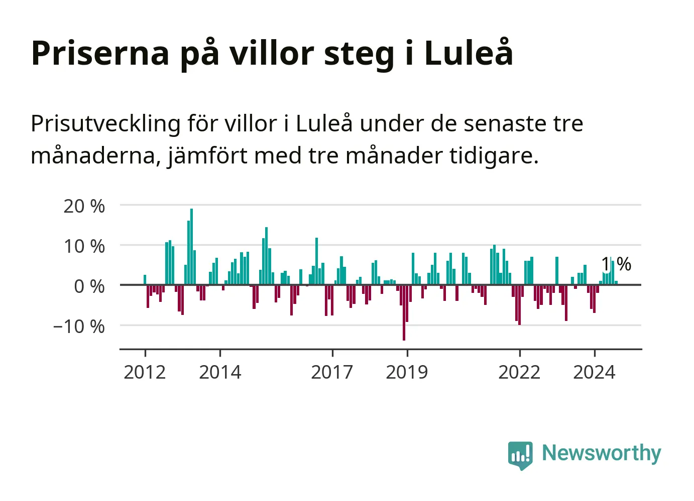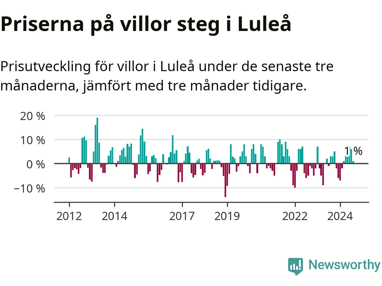 Villapriserna har gått upp i Luleå kommun. Medelpriset på försäljningarna under de senaste tre månaderna visar på en uppgång med 1 procent.