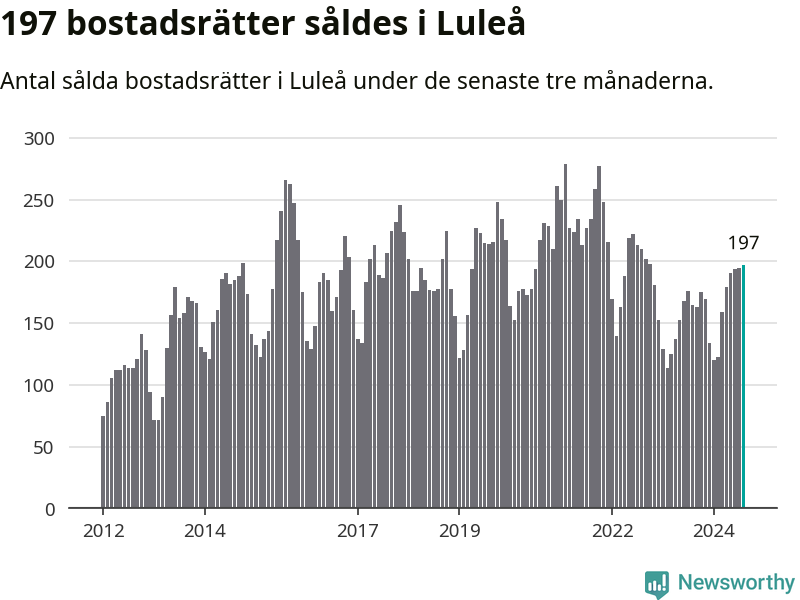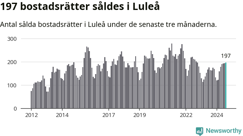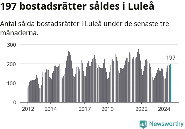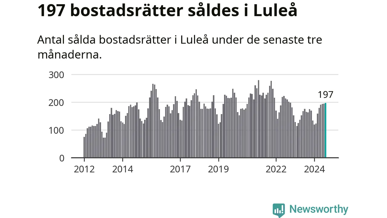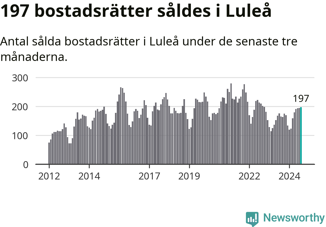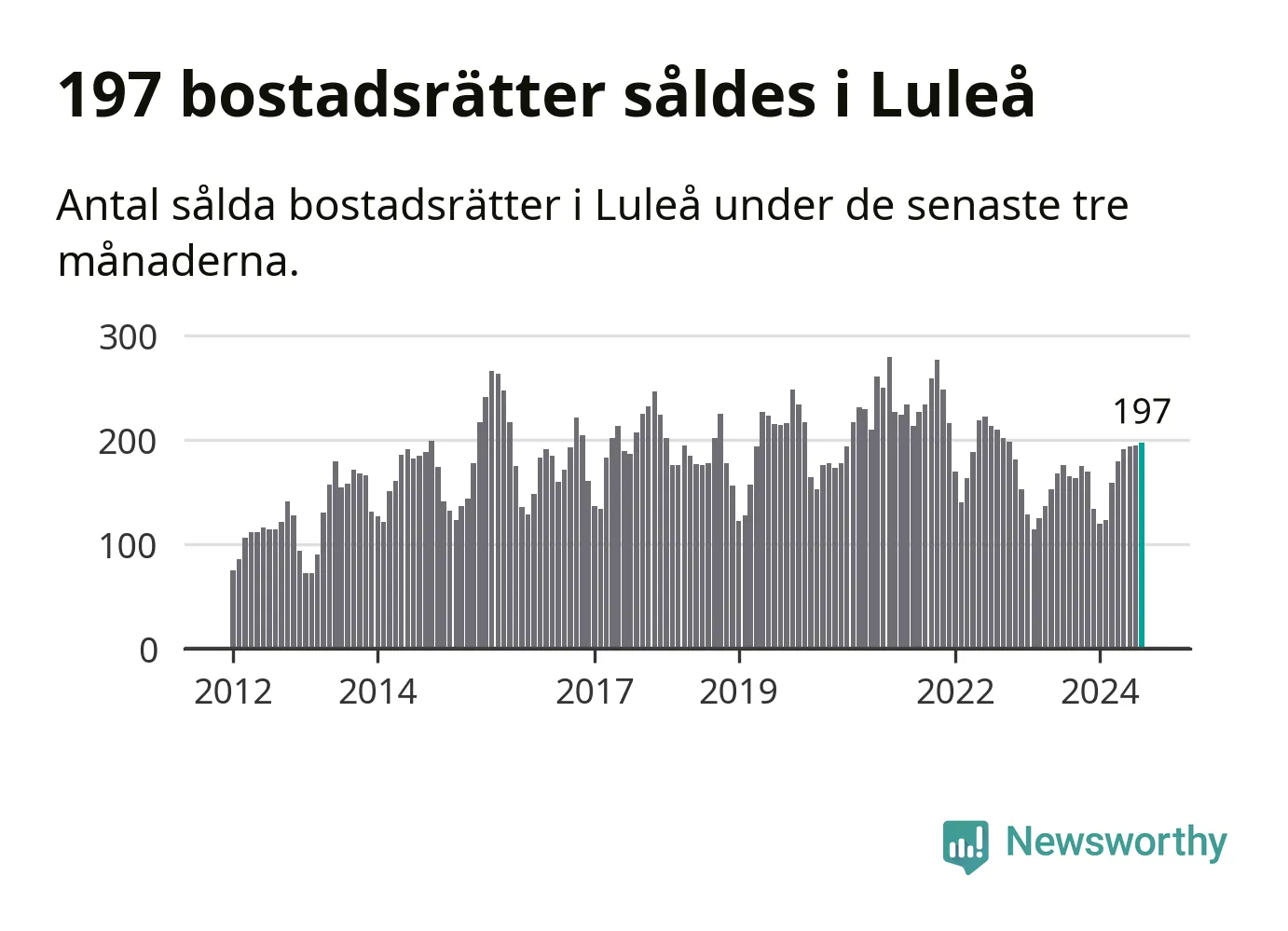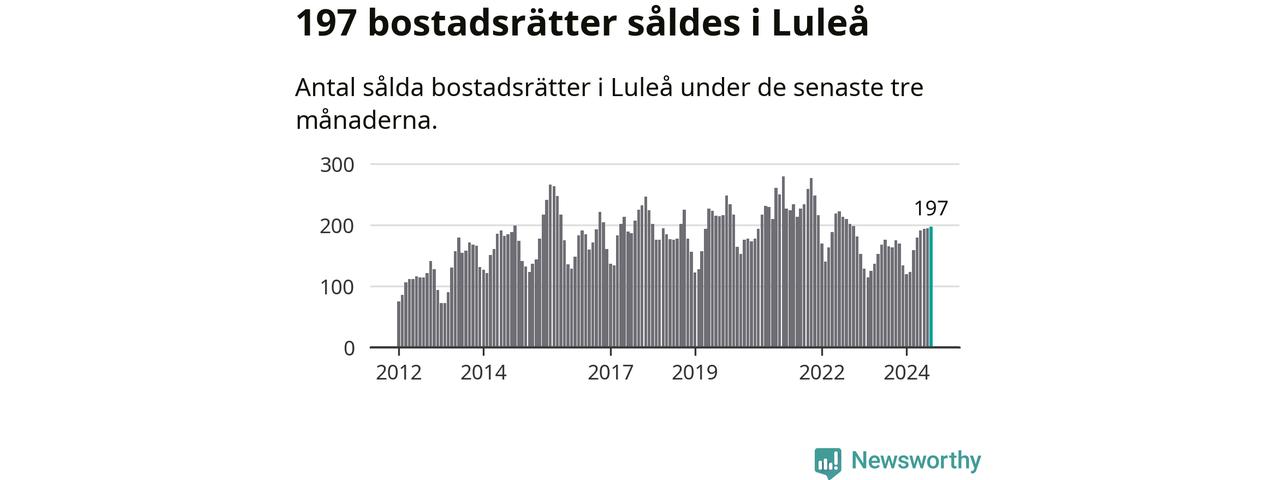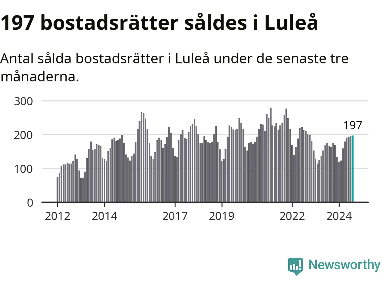 Sammanlagt såldes 197 bostadsrätter i Luleå kommun mellan juni och augusti till ett genomsnittligt pris på 1,8 miljoner kronor. I fjol gjordes 165 affärer vid den här tiden på året.