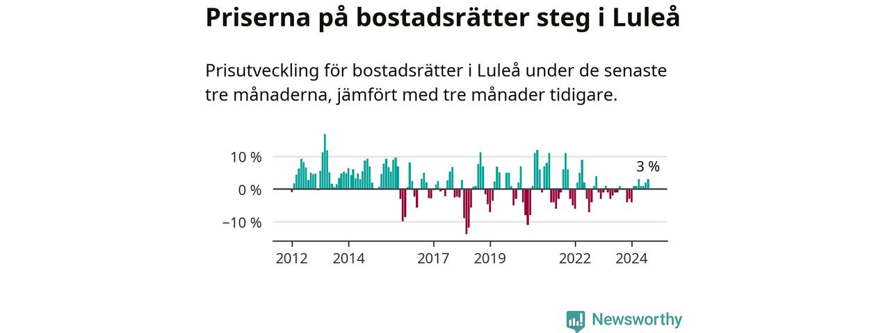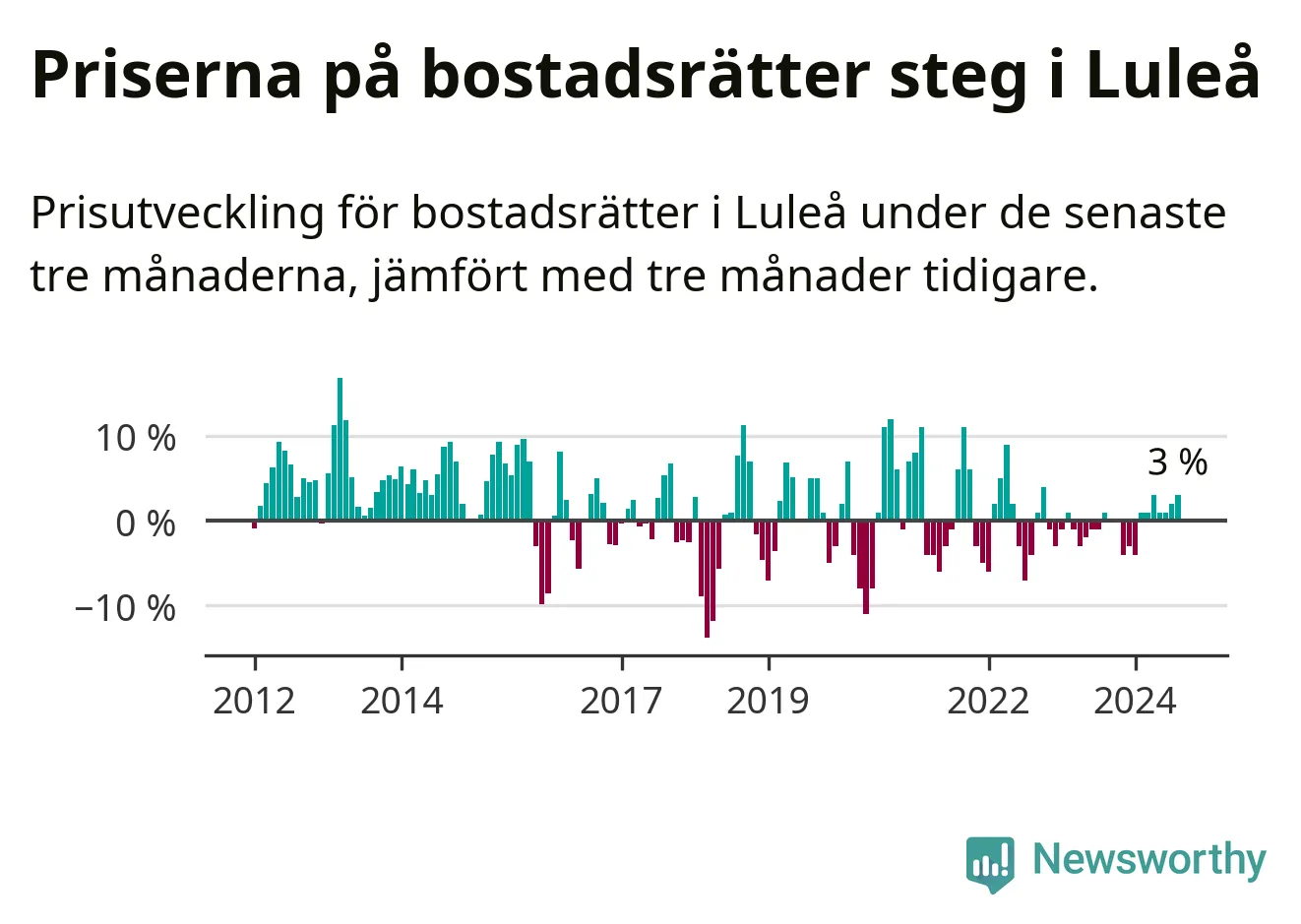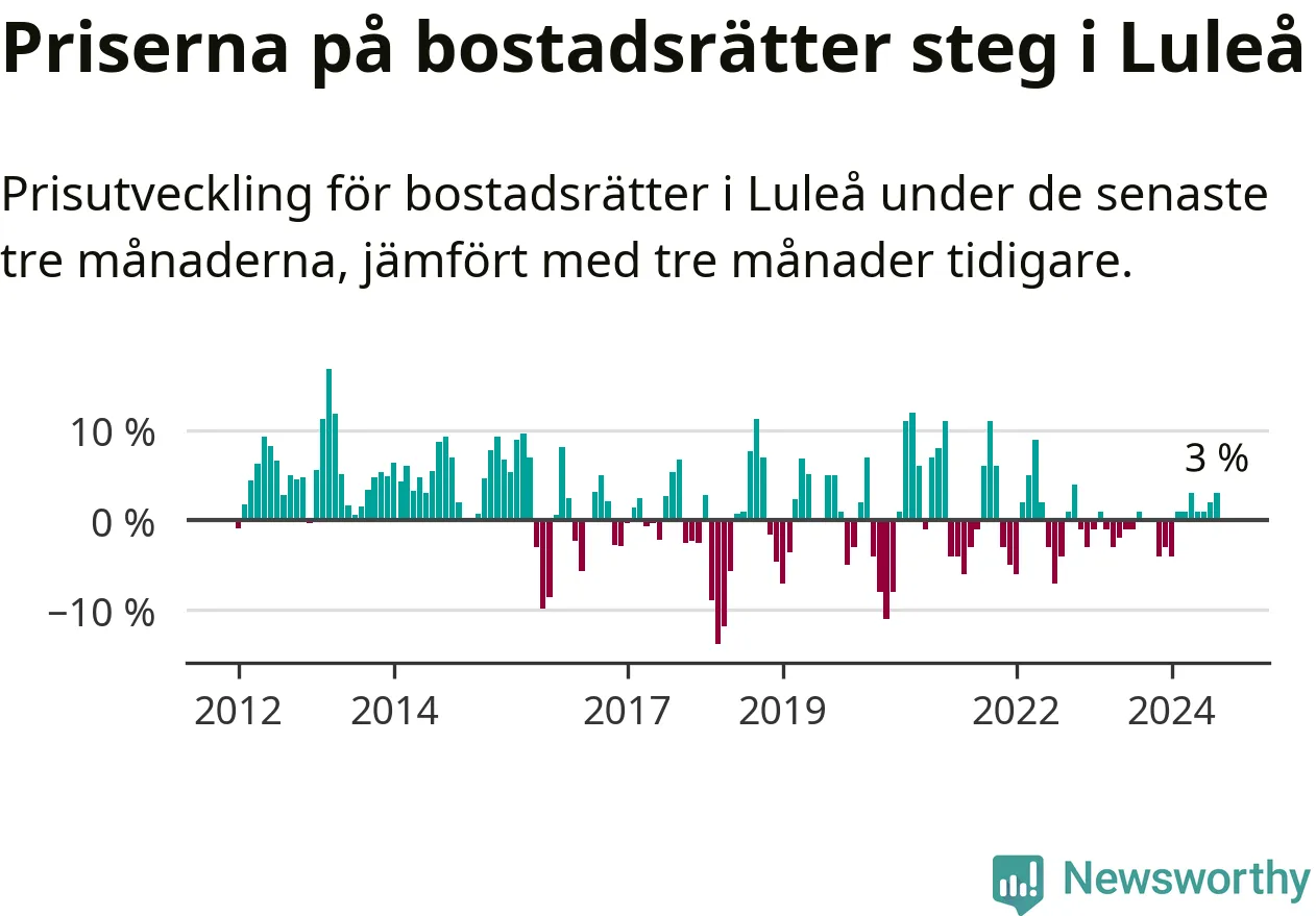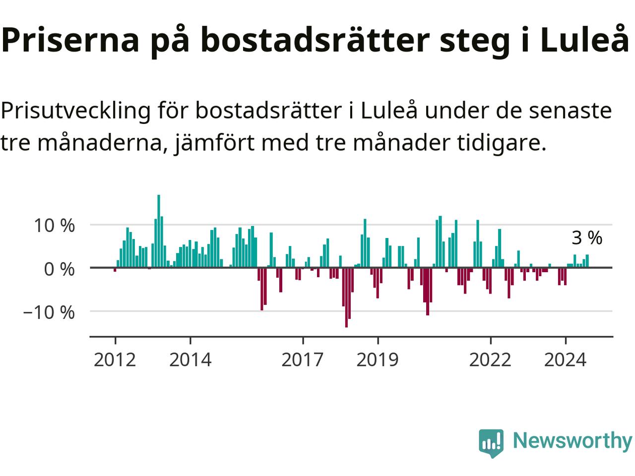 Priserna på bostadsrätter har gått upp i Luleå kommun. Medelpriset på försäljningarna under de senaste tre månaderna visar på en uppgång med 3 procent.