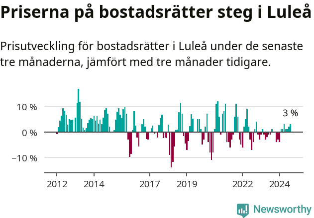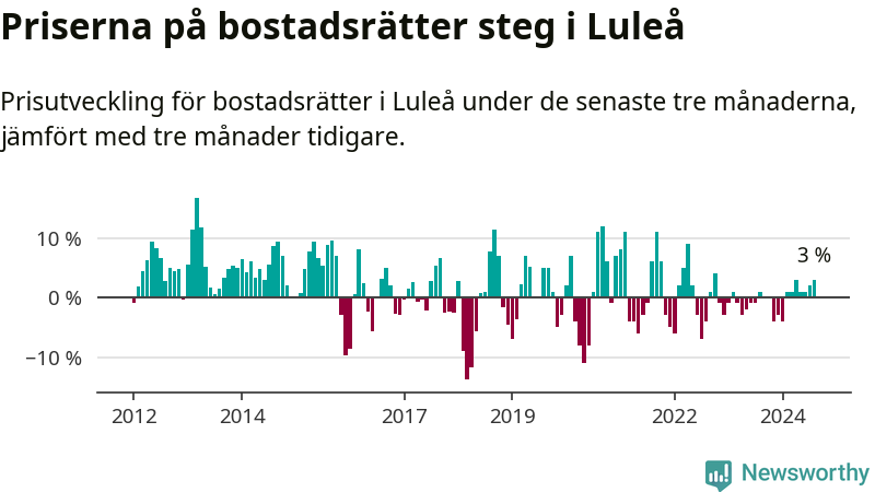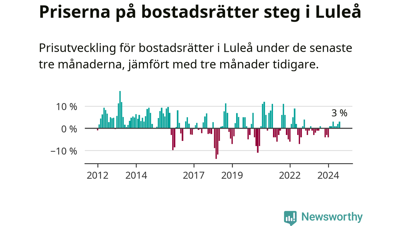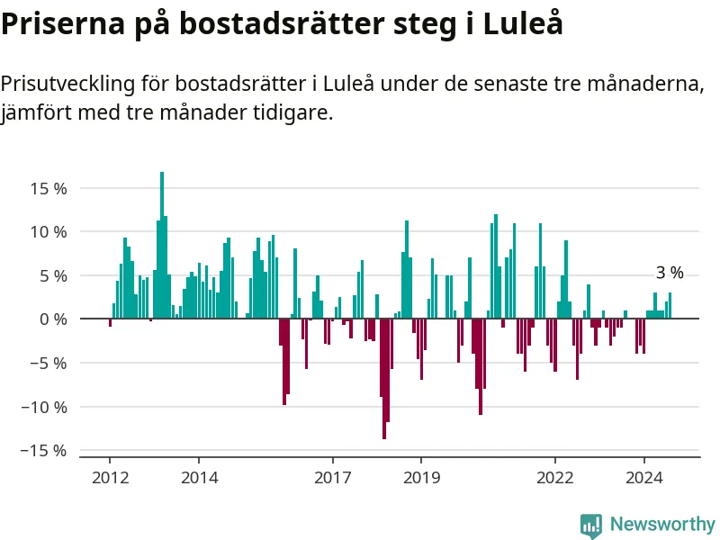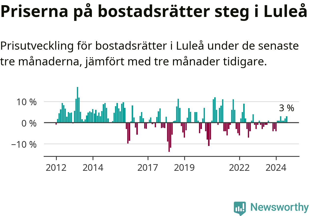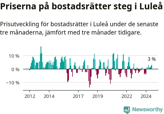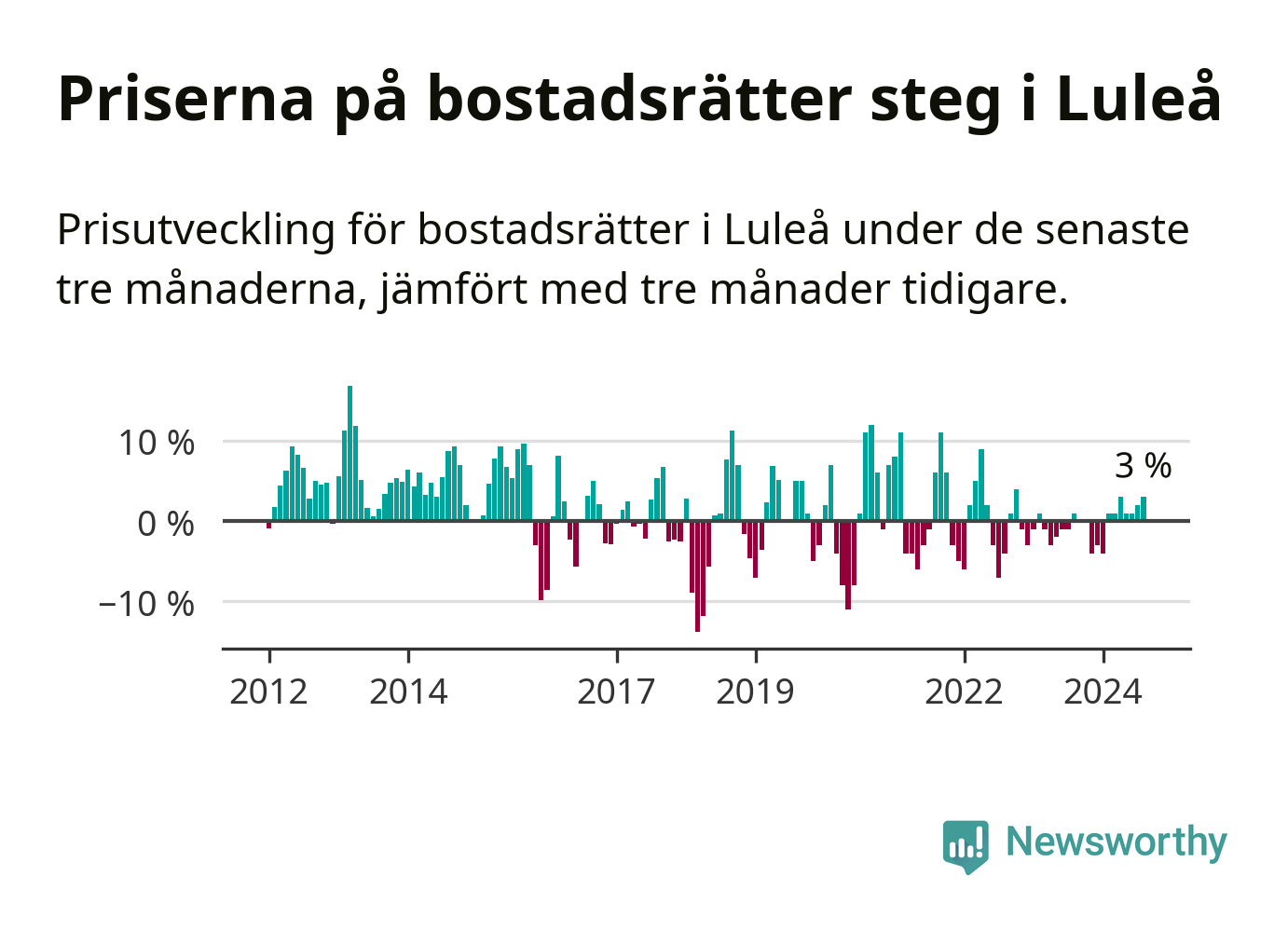 Priserna på bostadsrätter har gått upp i Luleå kommun. Medelpriset på försäljningarna under de senaste tre månaderna visar på en uppgång med 3 procent.