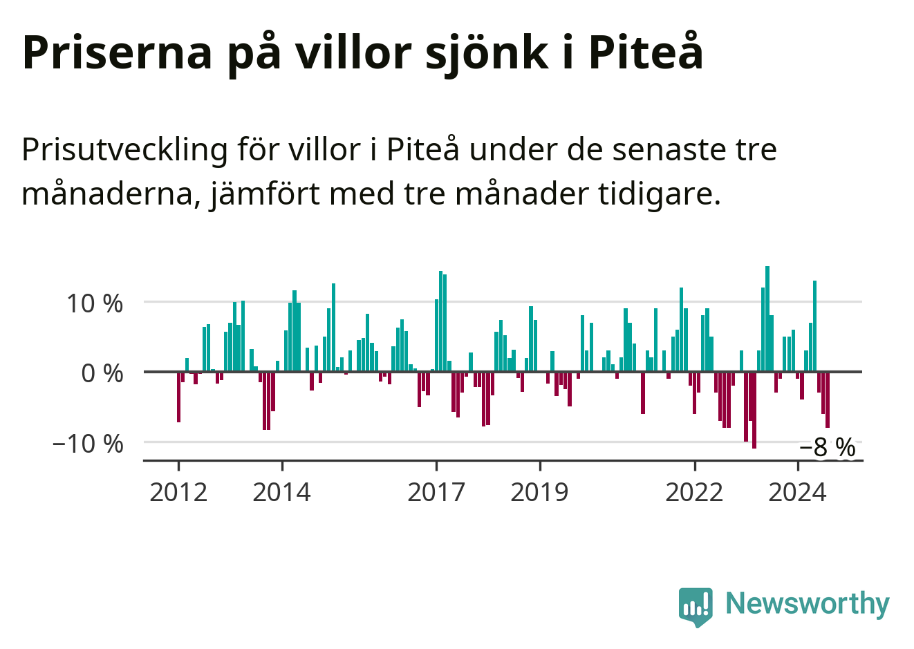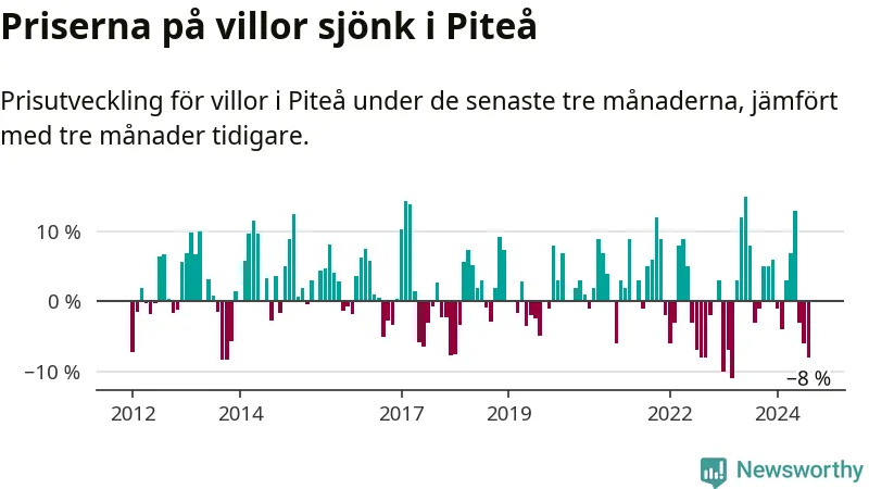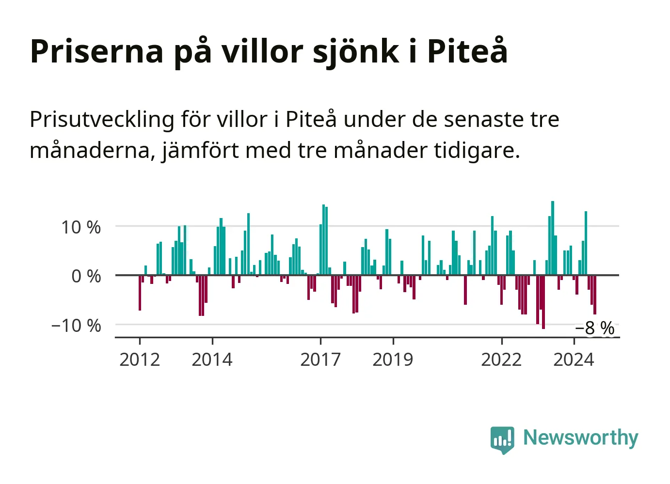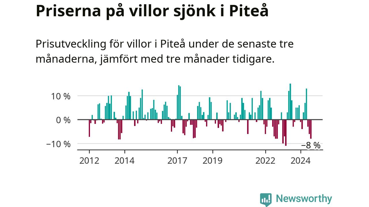 Villapriserna sjönk mellan juni och augusti med 8 procent i Piteå kommun. Det är en betydande nedgång jämfört med det gångna året då priserna i snitt ökat med 1 procent.