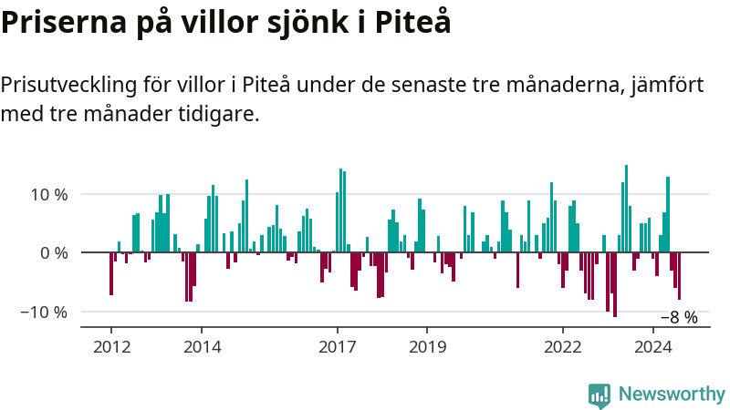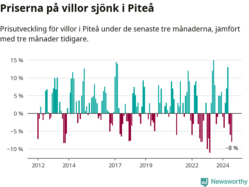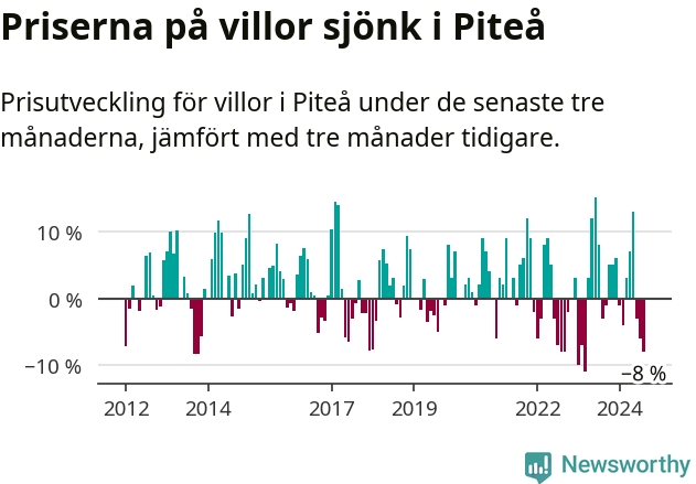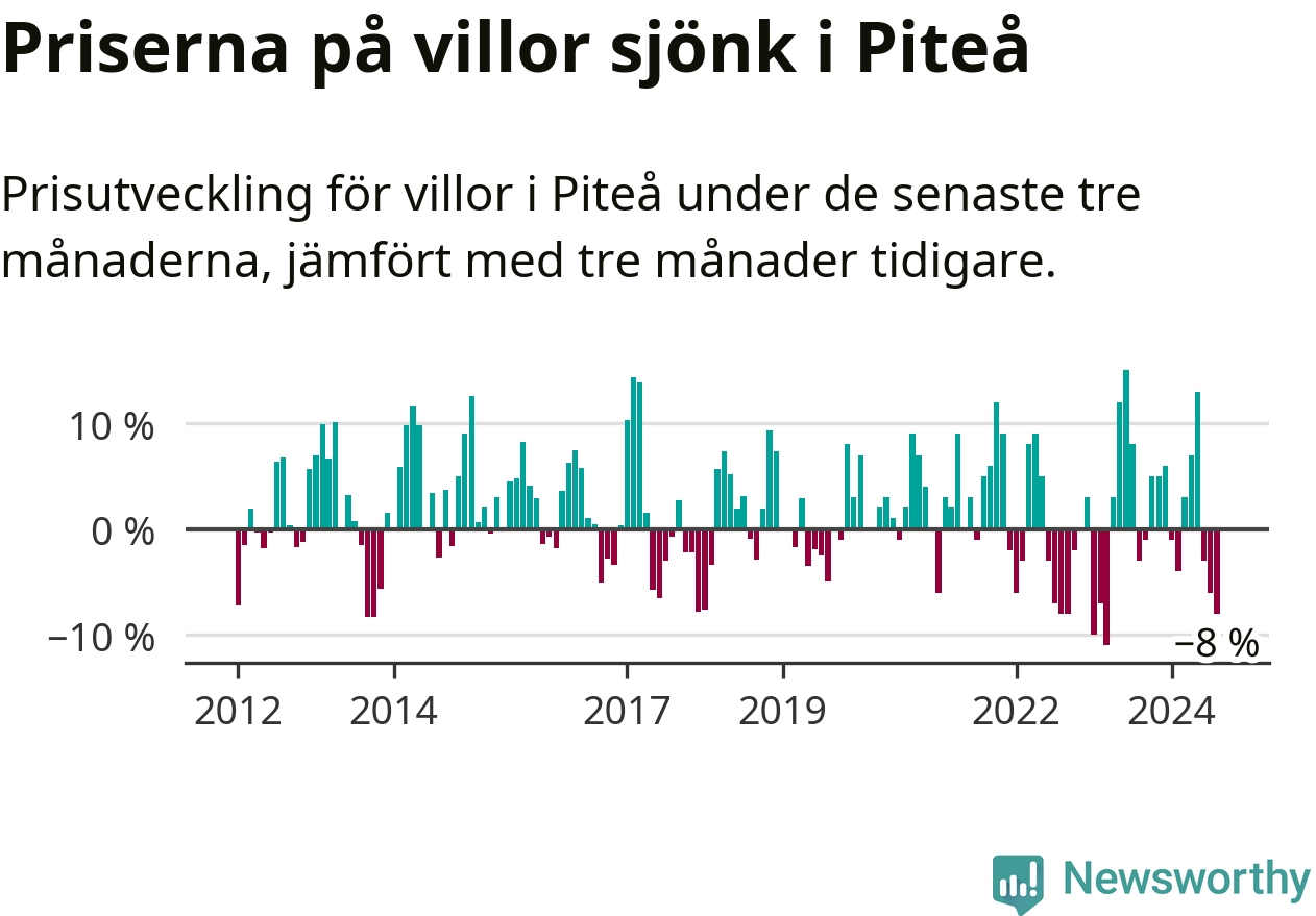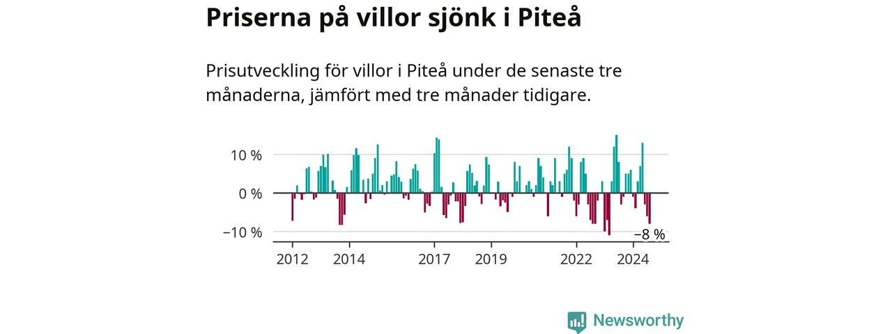 Villapriserna sjönk mellan juni och augusti med 8 procent i Piteå kommun. Det är en betydande nedgång jämfört med det gångna året då priserna i snitt ökat med 1 procent.