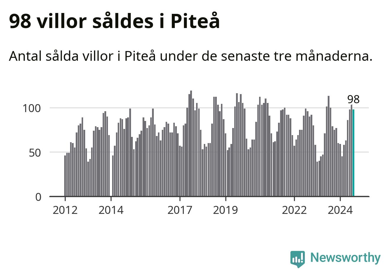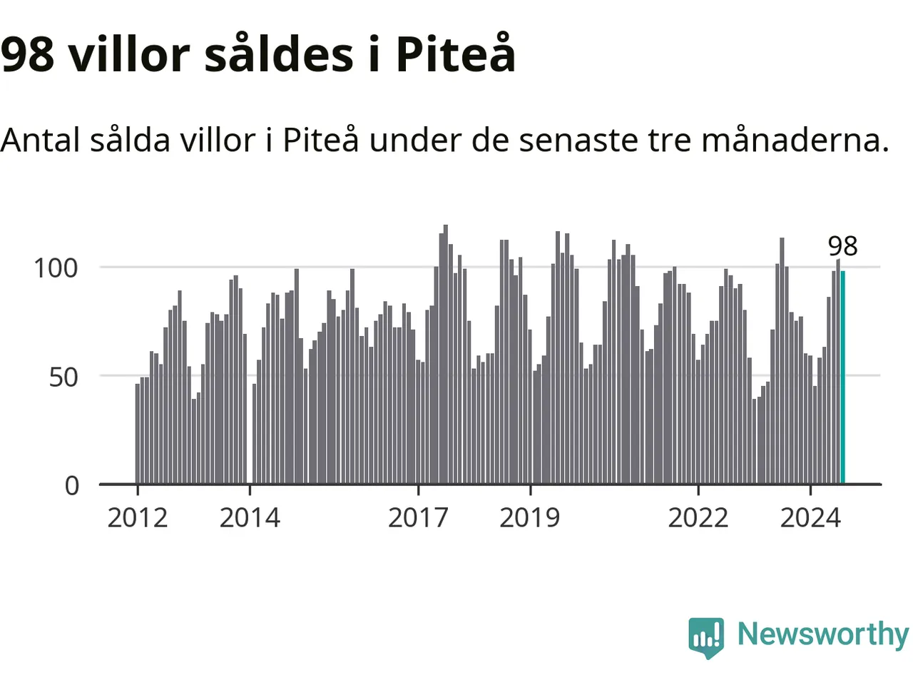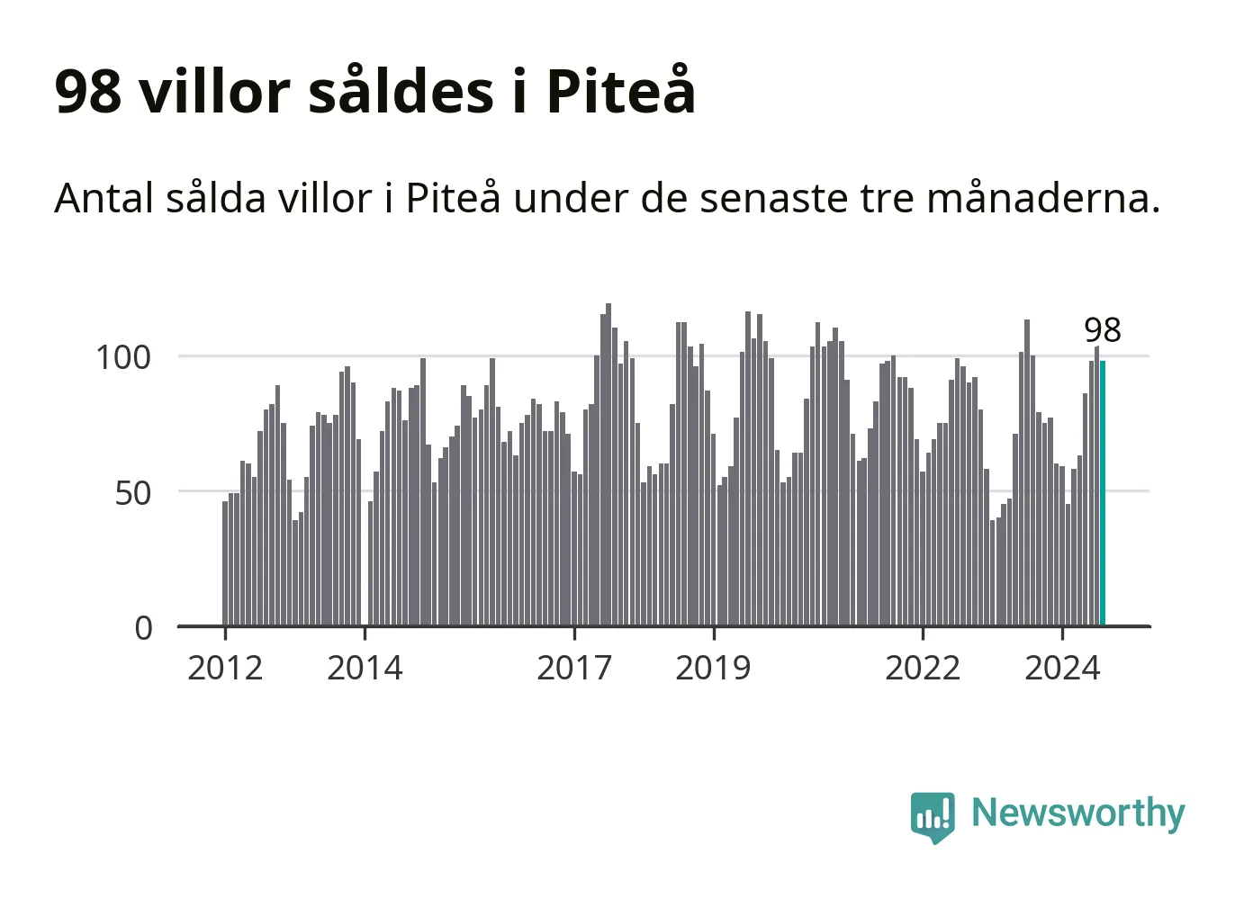 Sammanlagt såldes 98 villor i Piteå kommun mellan juni och augusti till ett genomsnittligt pris på 2,2 miljoner kronor. I fjol gjordes 100 affärer vid den här tiden på året.