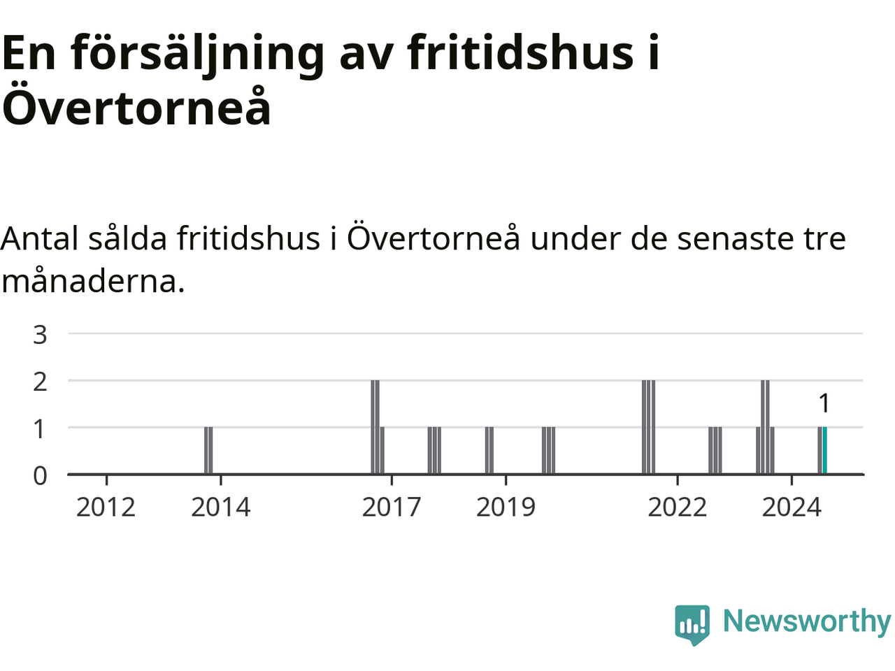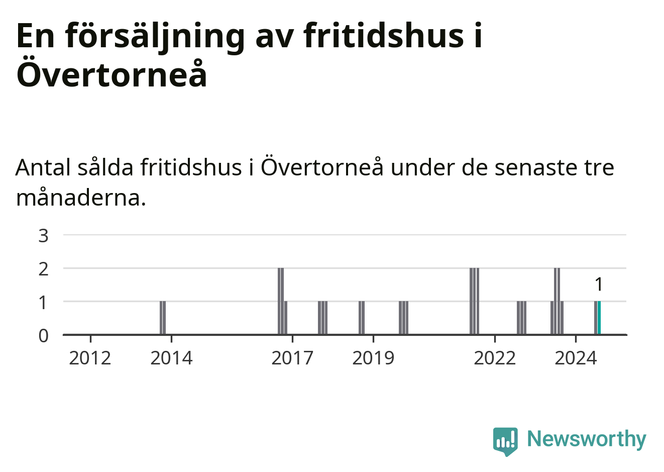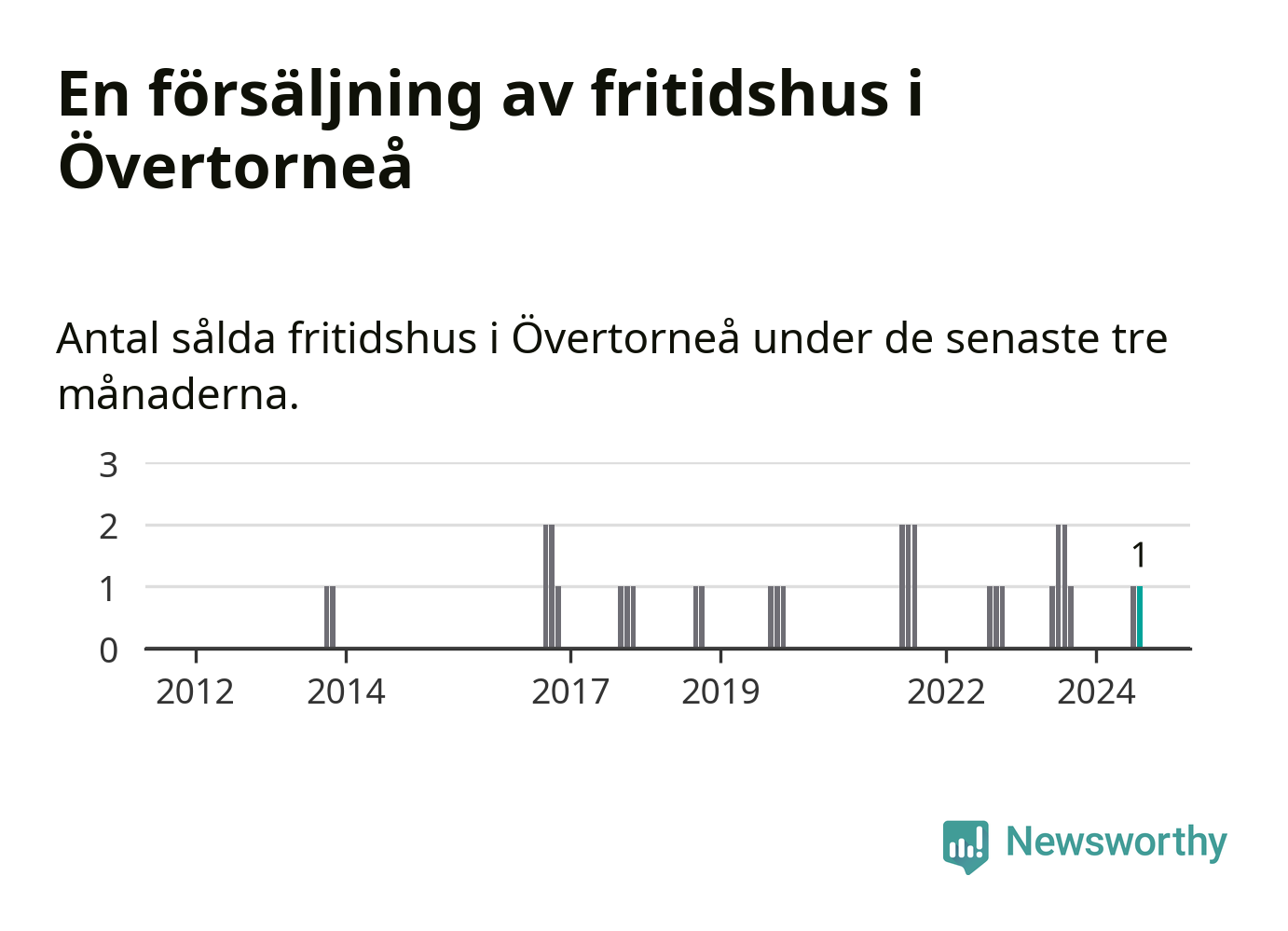 Mellan juni och augusti gjordes sammanlagt en affär med fritidshus i Övertorneå kommun. Det kan jämföras med två vid motsvarande tid i fjol.