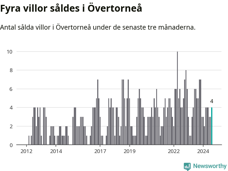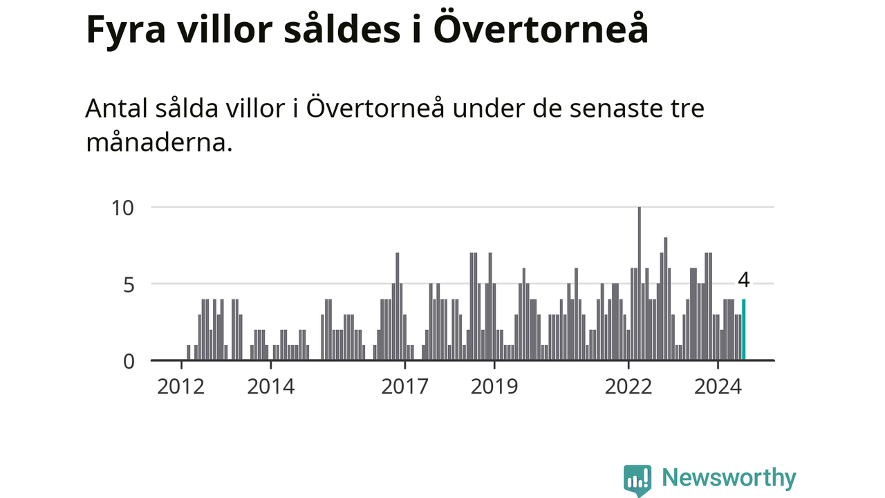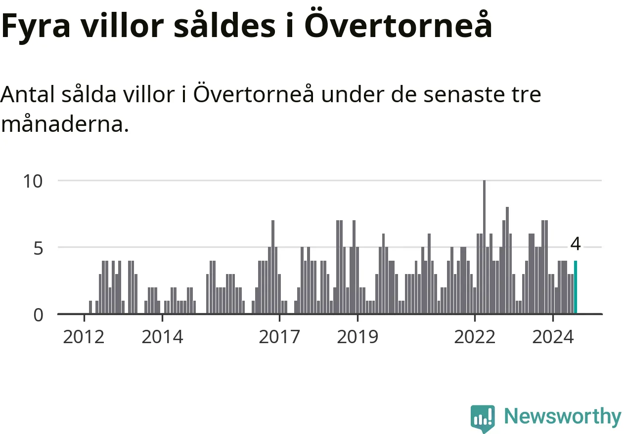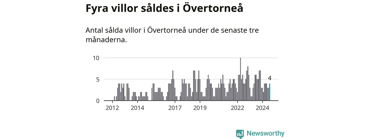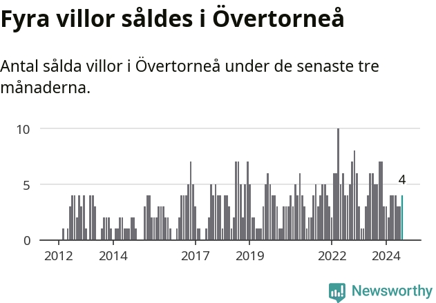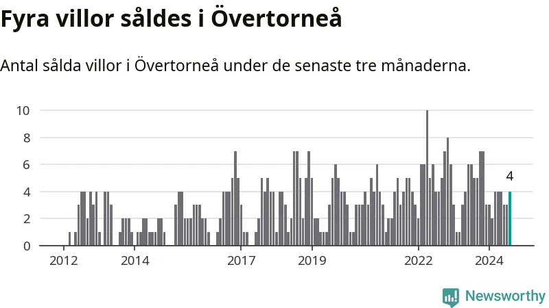 Mellan juni och augusti gjordes sammanlagt fyra affärer med villor i Övertorneå kommun. Det kan jämföras med fem vid motsvarande tid i fjol.