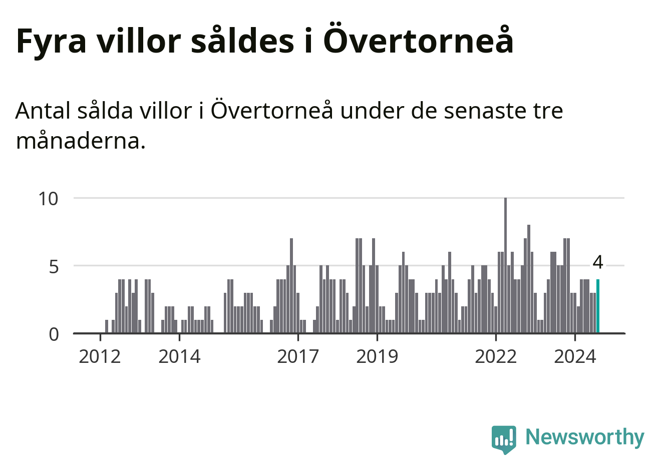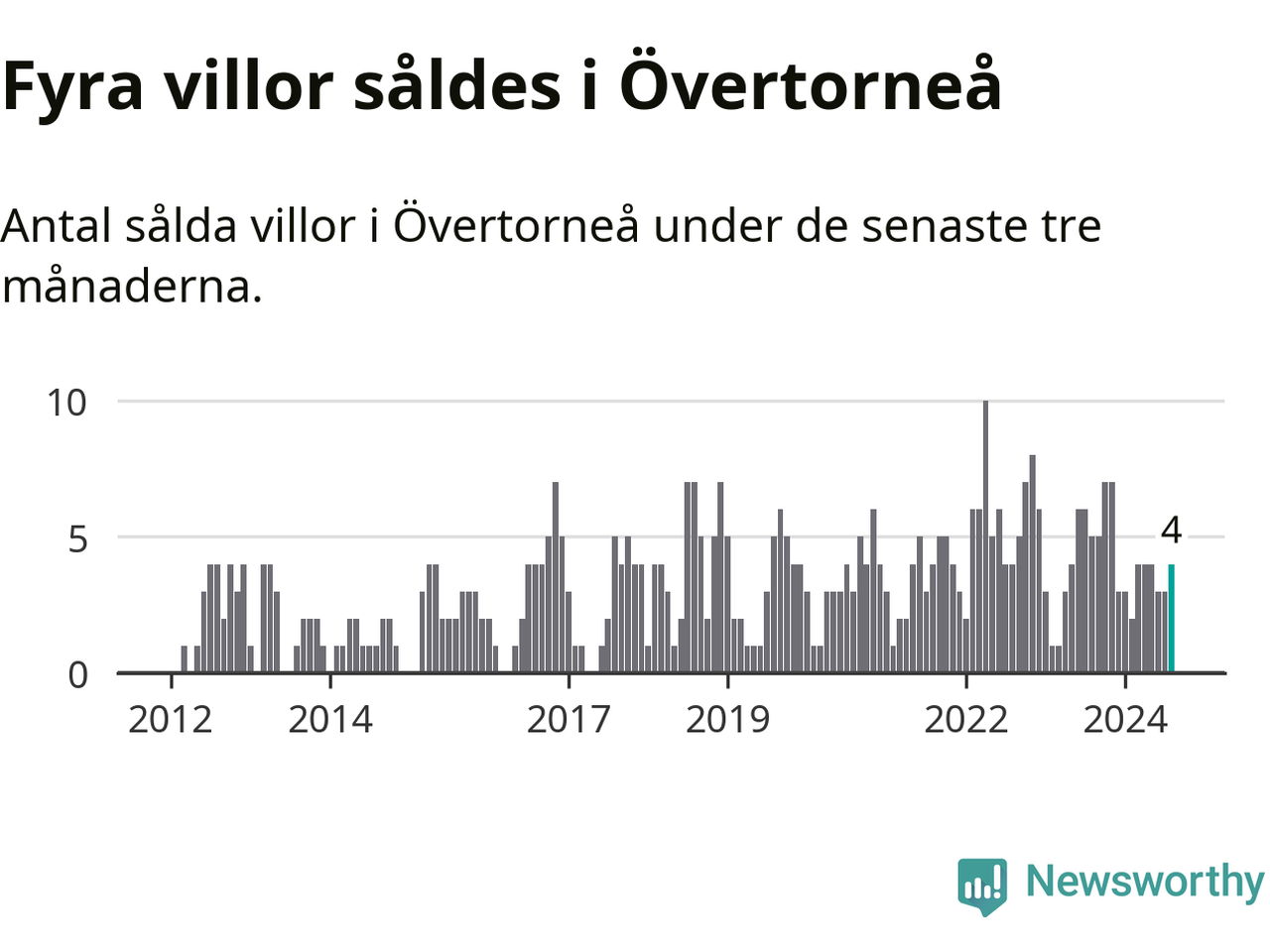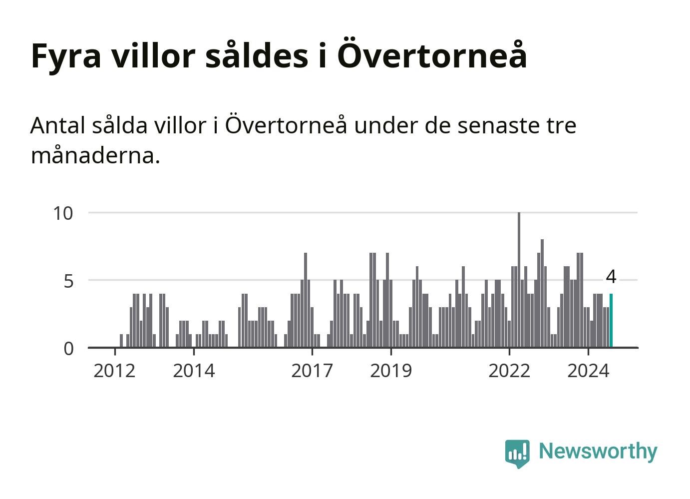 Mellan juni och augusti gjordes sammanlagt fyra affärer med villor i Övertorneå kommun. Det kan jämföras med fem vid motsvarande tid i fjol.