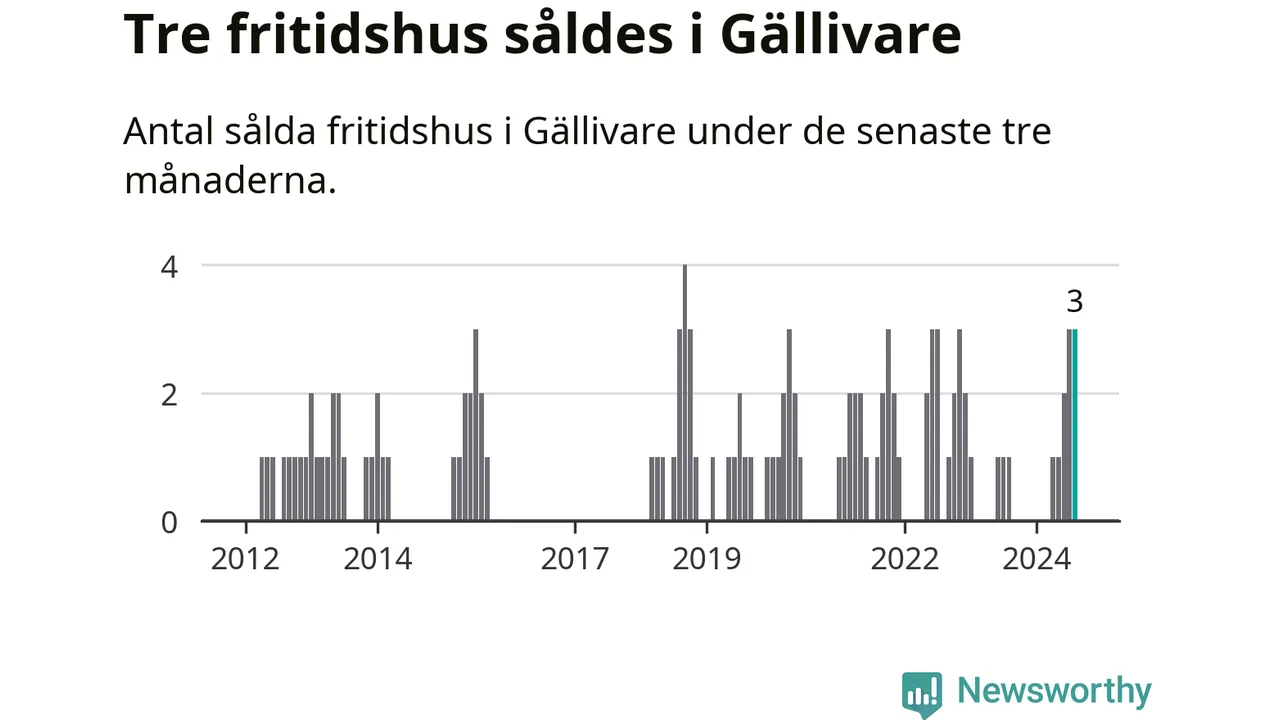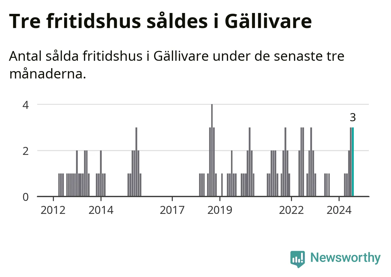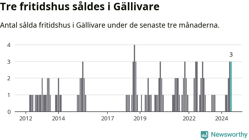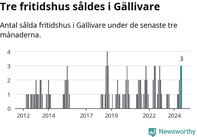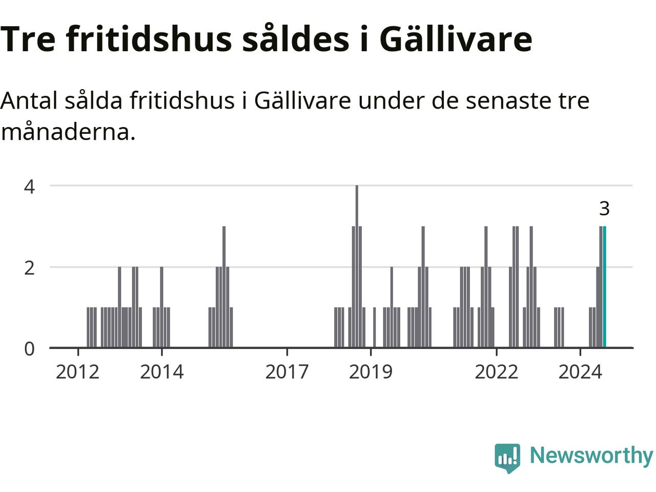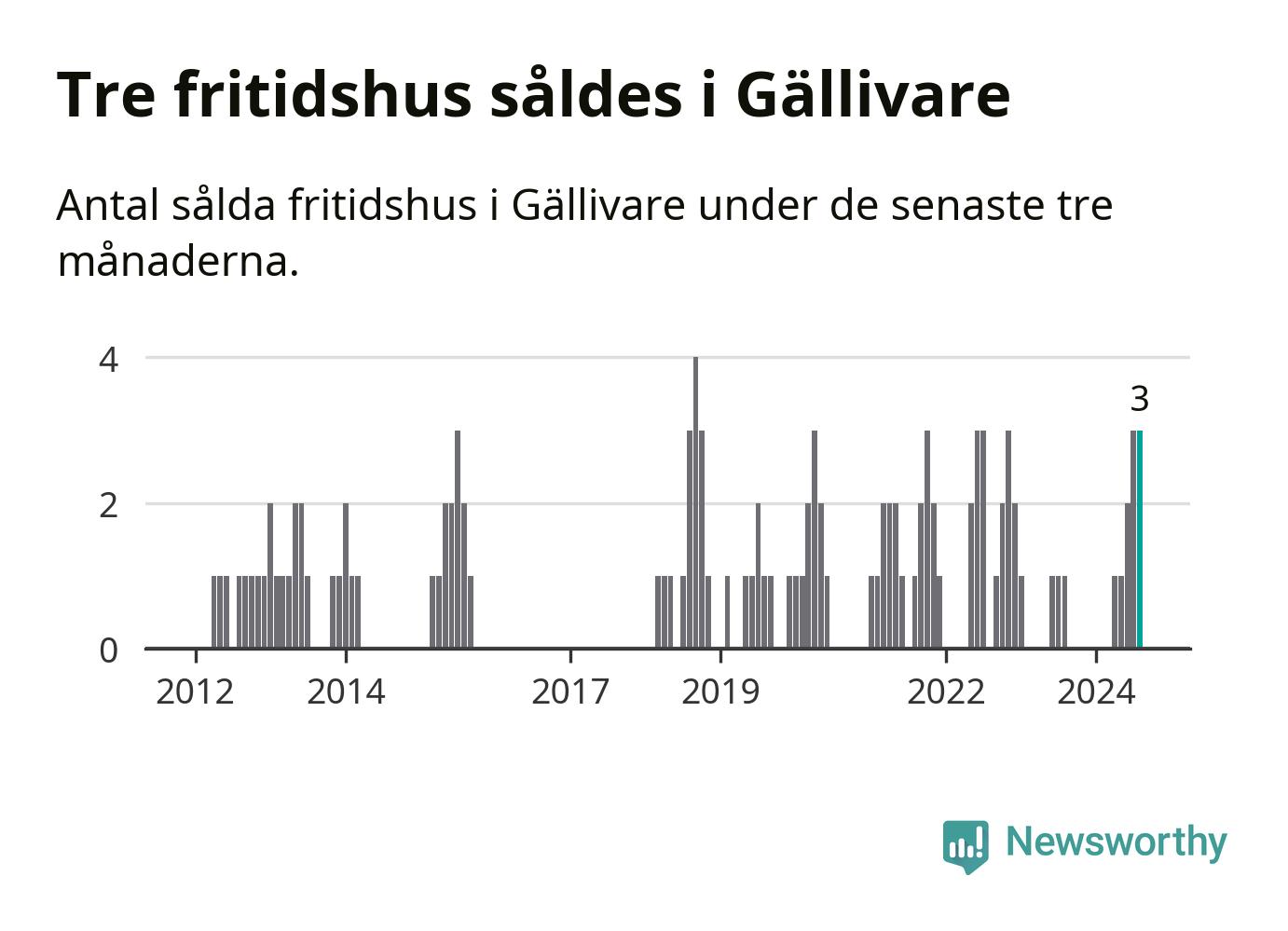 Mellan juni och augusti gjordes sammanlagt tre affärer med fritidshus i Gällivare kommun. Det kan jämföras med ett vid motsvarande tid i fjol.