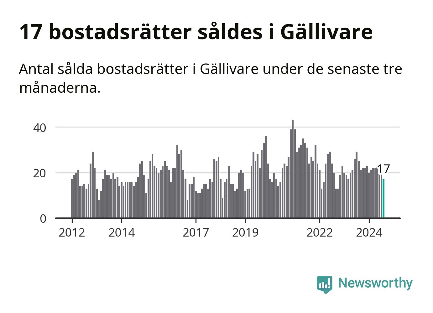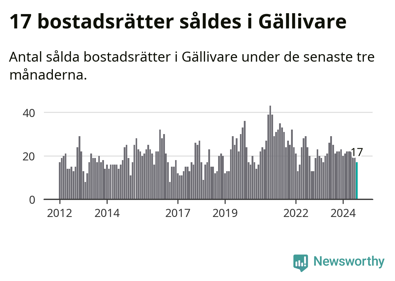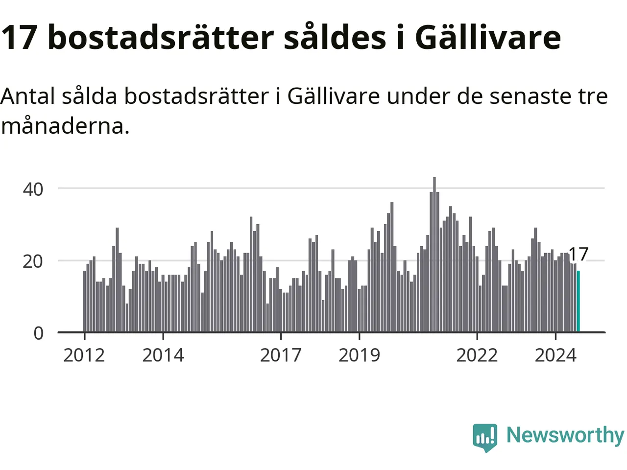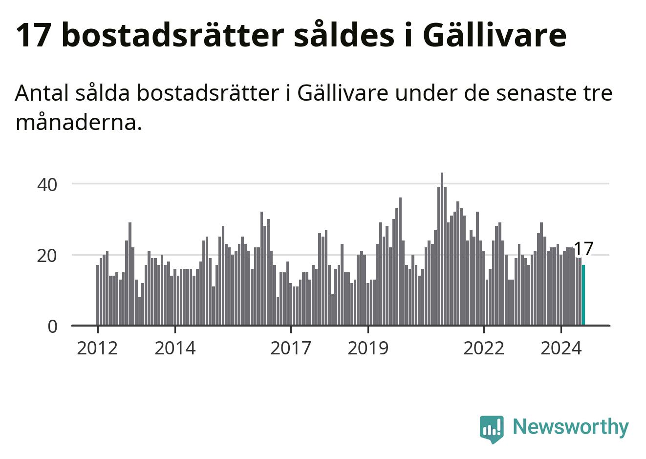 Mellan juni och augusti gjordes sammanlagt 17 affärer med bostadsrätter i Gällivare kommun. Det kan jämföras med 25 vid motsvarande tid i fjol.