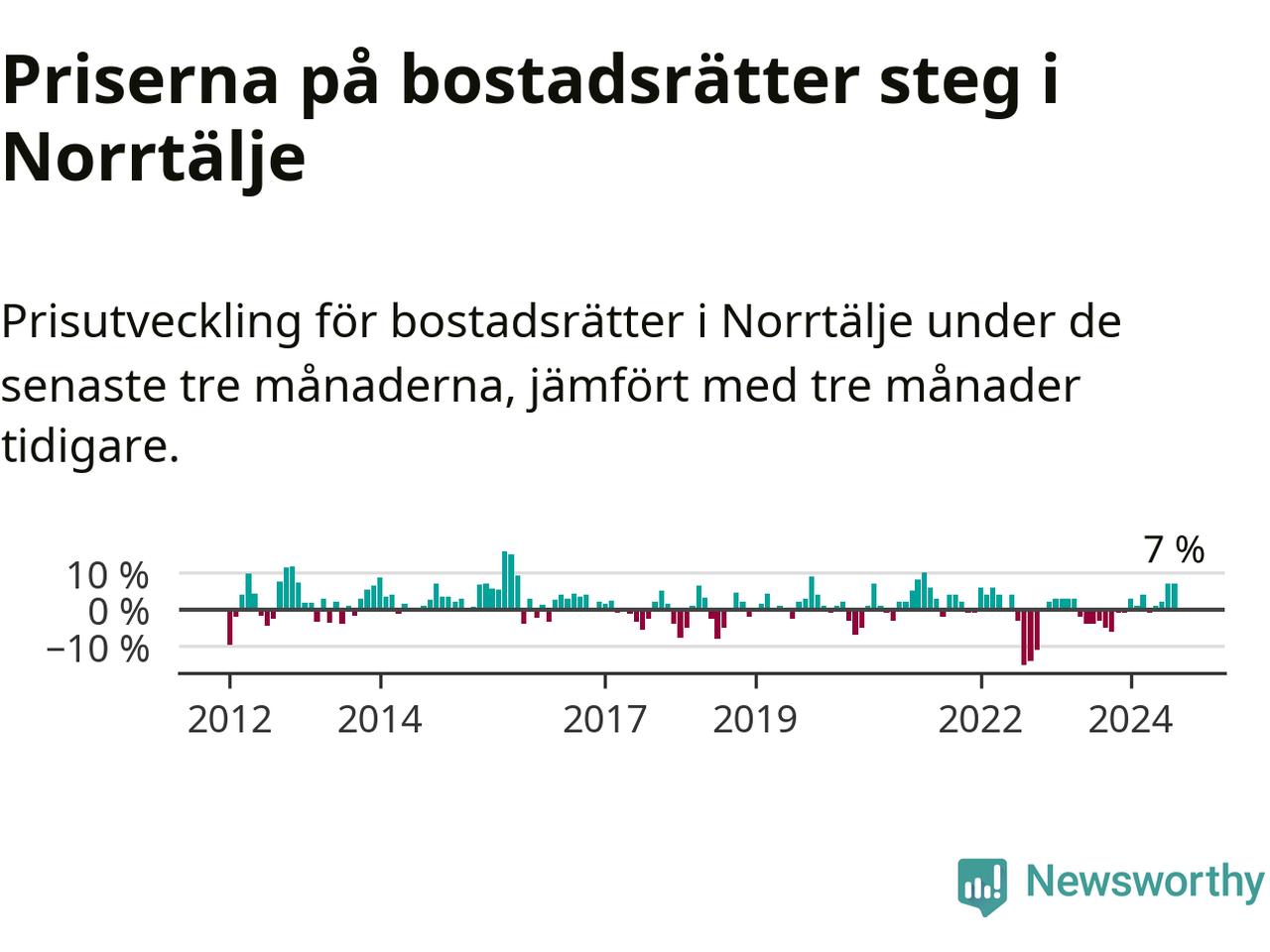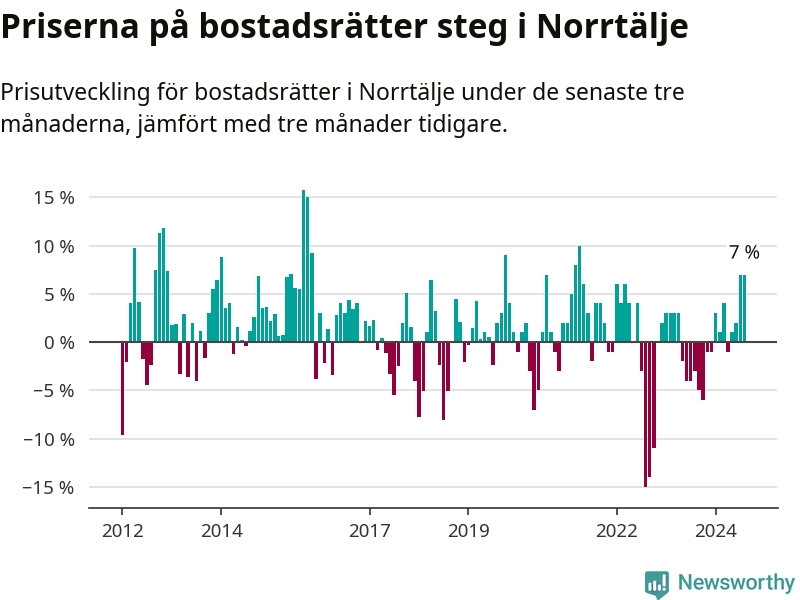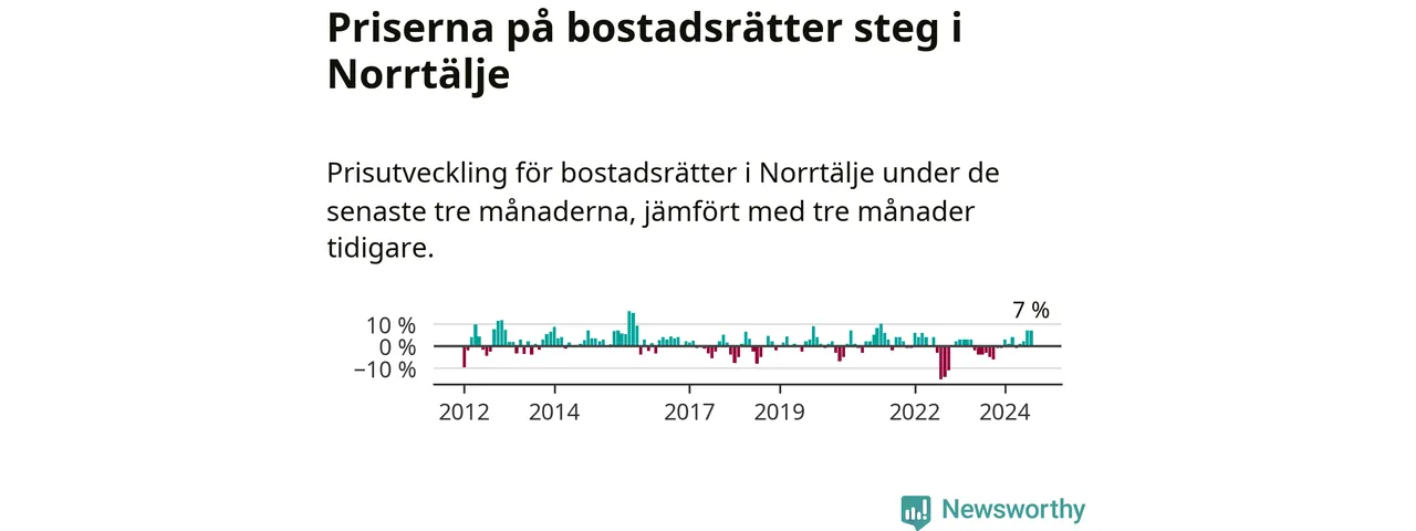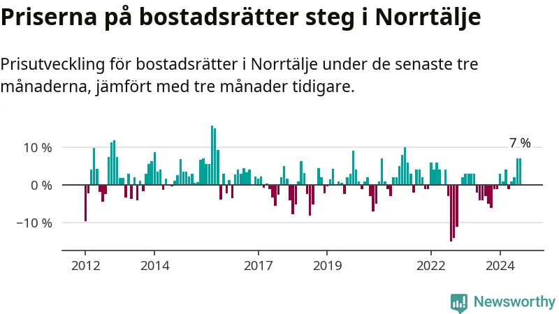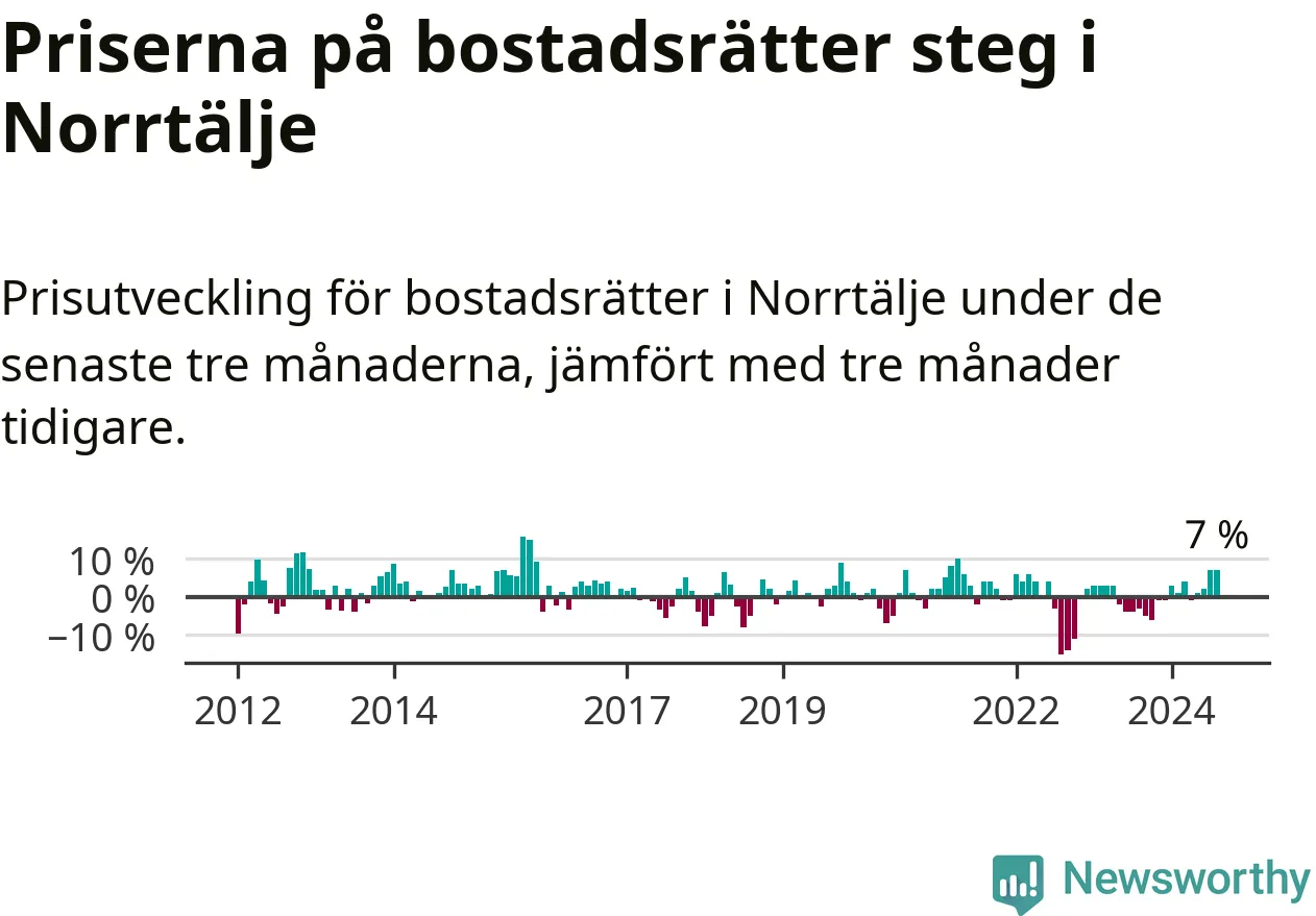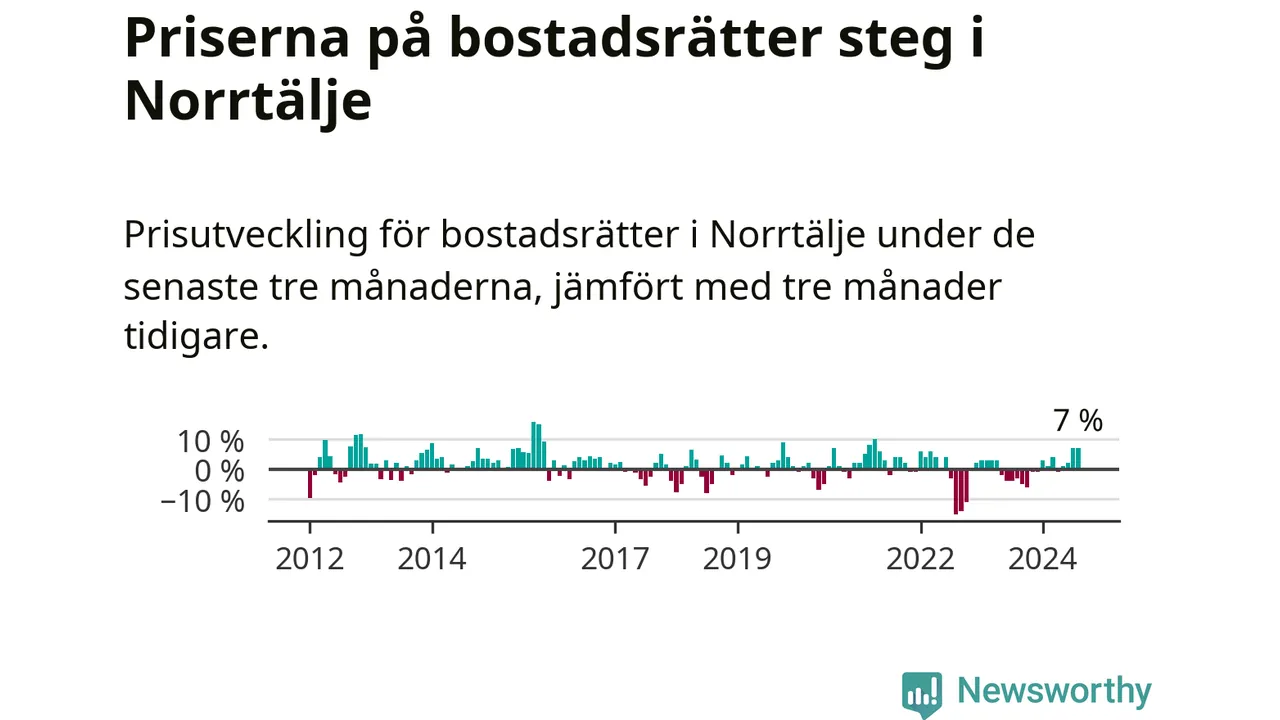 Priserna på bostadsrätter har gått upp i Norrtälje kommun. Medelpriset på försäljningarna under de senaste tre månaderna visar på en uppgång med 7 procent.