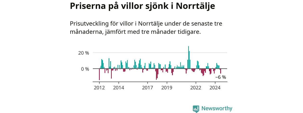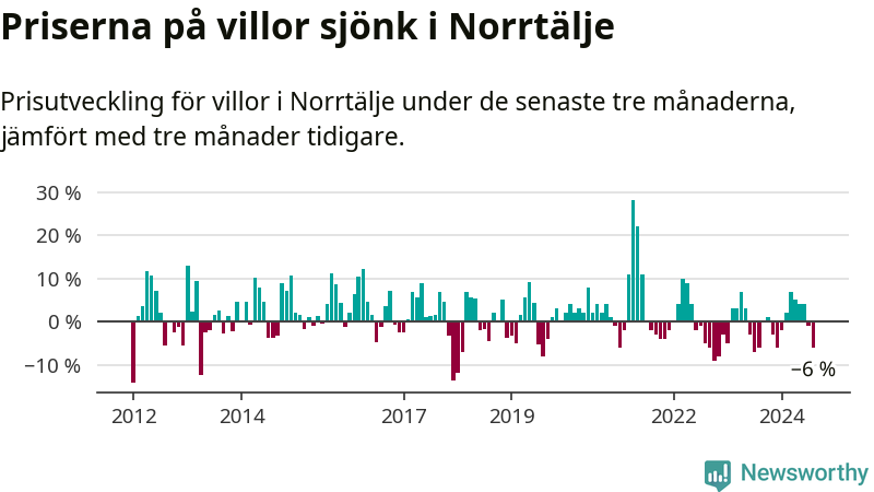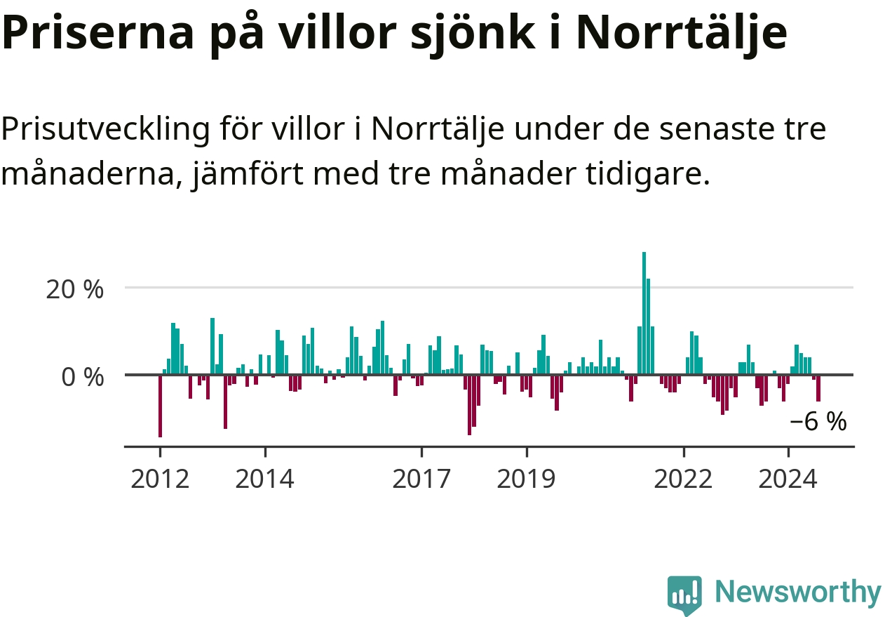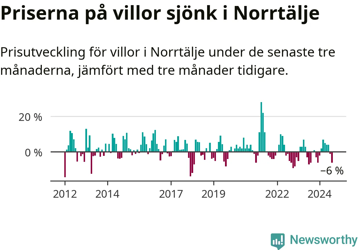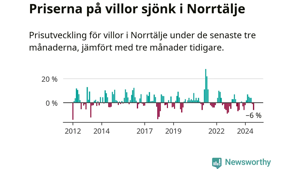 Villapriserna har gått ner i Norrtälje kommun. Medelpriset på försäljningarna under de senaste tre månaderna visar på en nedgång med 6 procent.