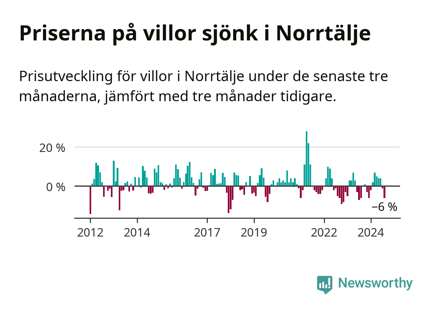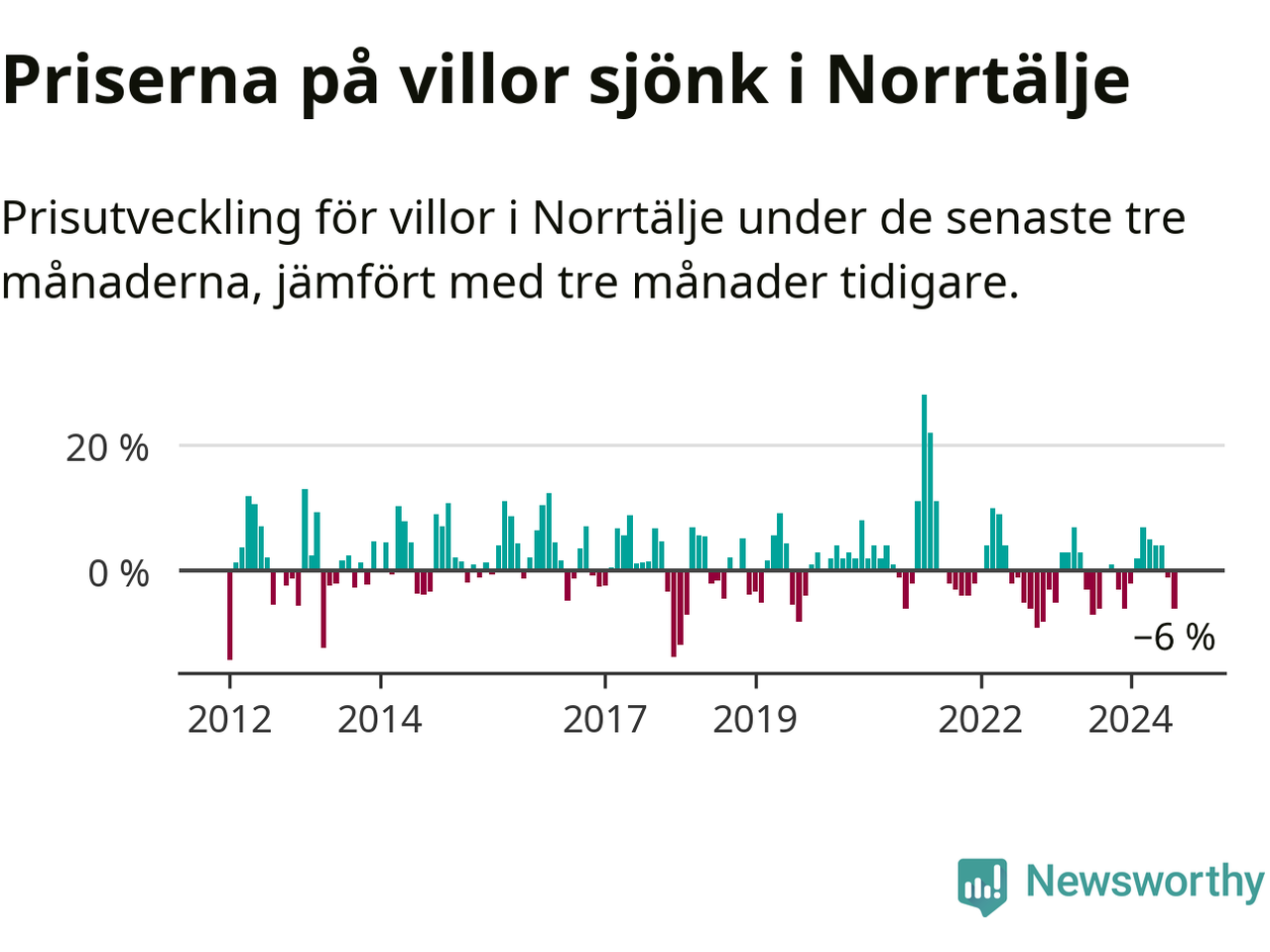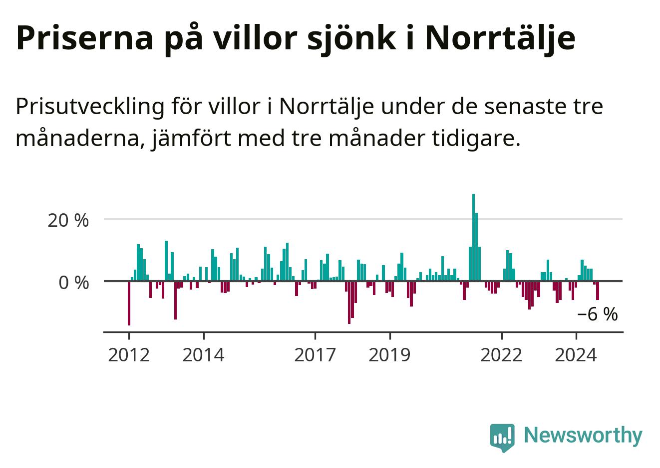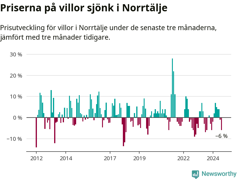 Villapriserna har gått ner i Norrtälje kommun. Medelpriset på försäljningarna under de senaste tre månaderna visar på en nedgång med 6 procent.