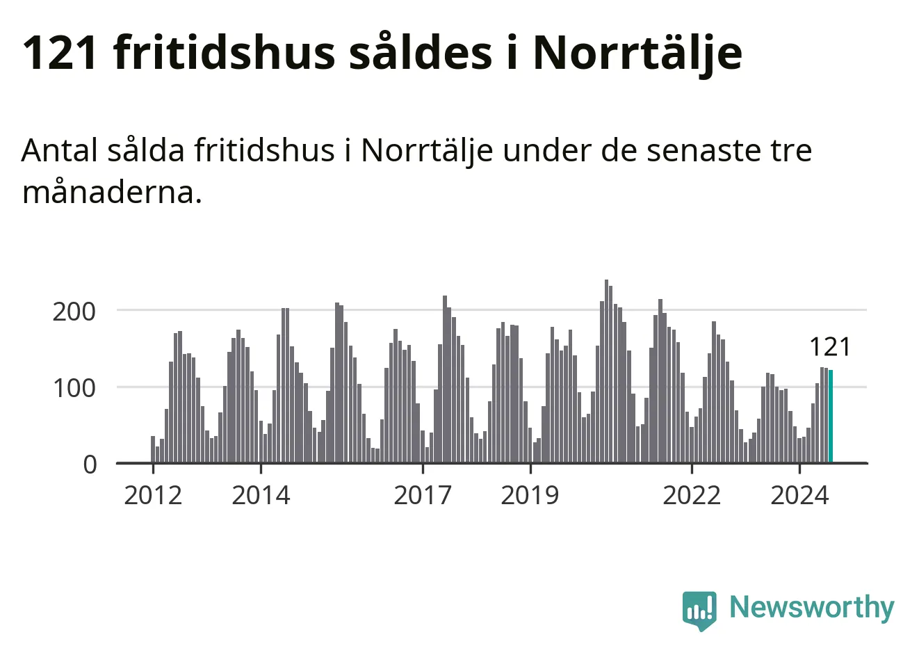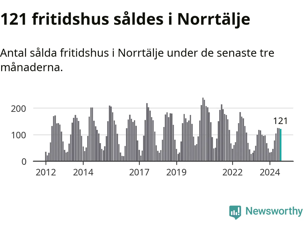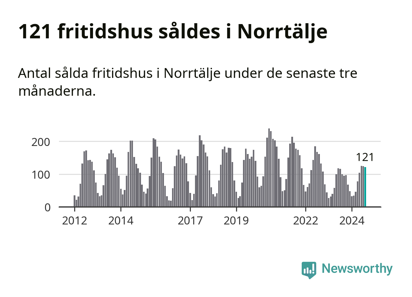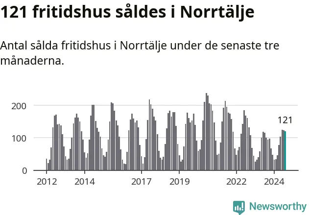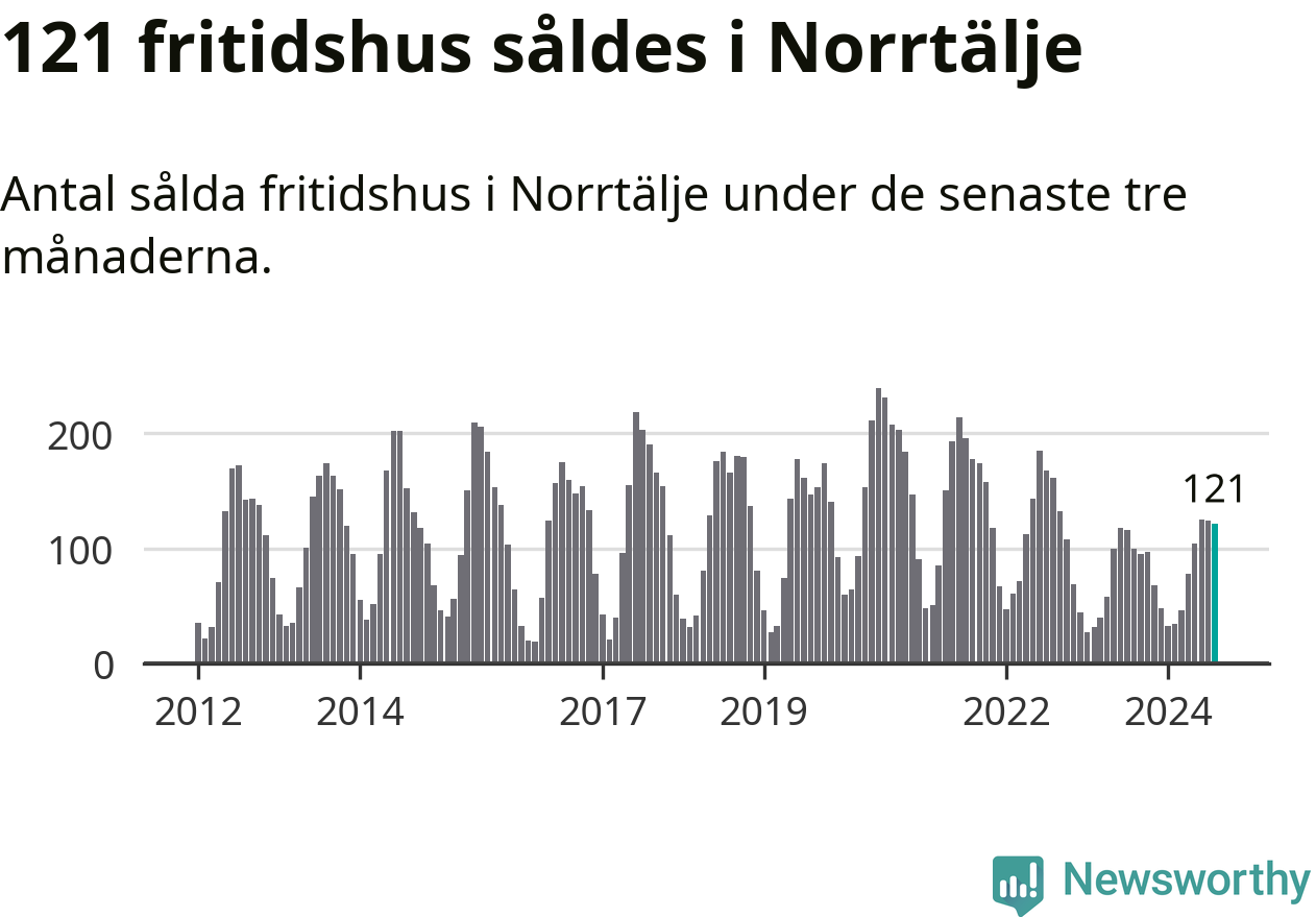 Sammanlagt såldes 121 fritidshus i Norrtälje kommun mellan juni och augusti till ett genomsnittligt pris på 2,5 miljoner kronor. I fjol gjordes 100 affärer vid den här tiden på året.