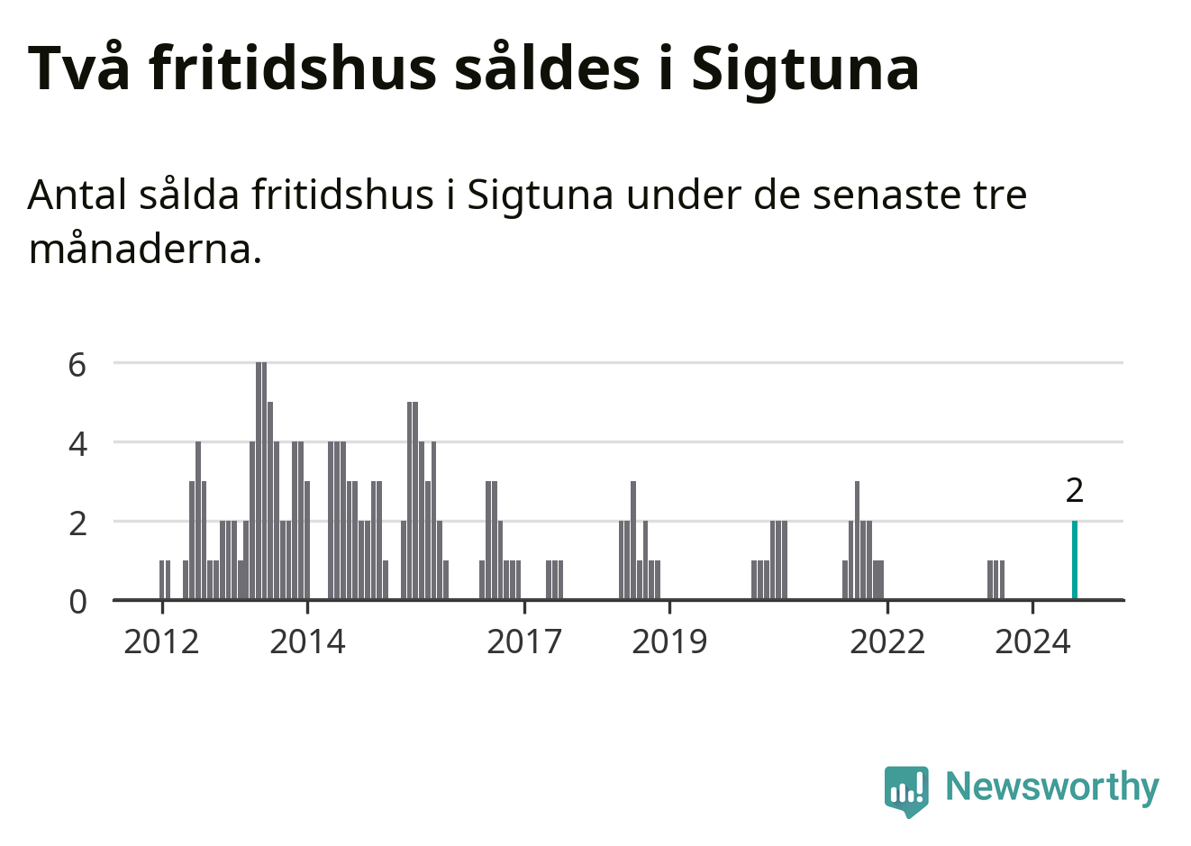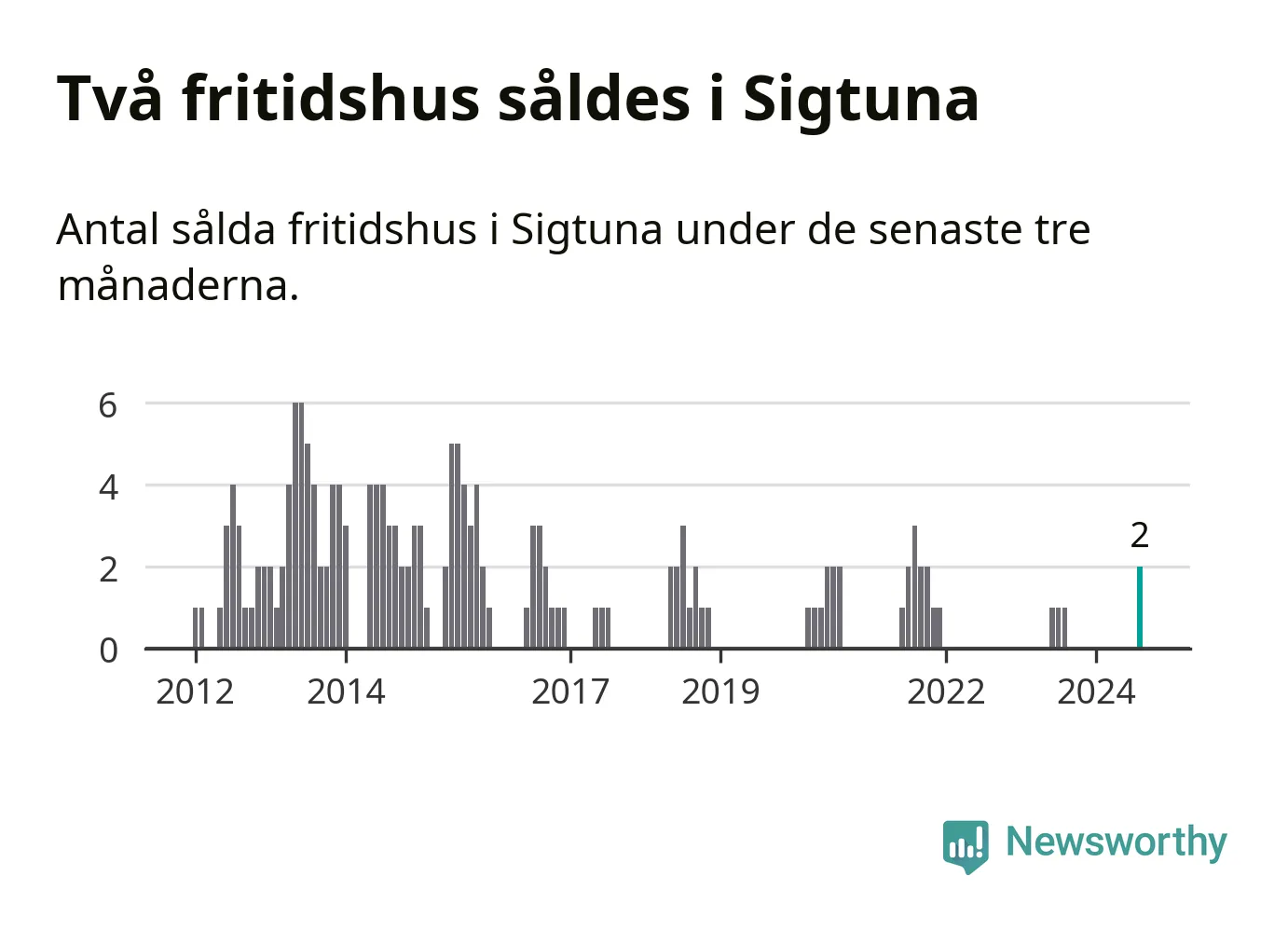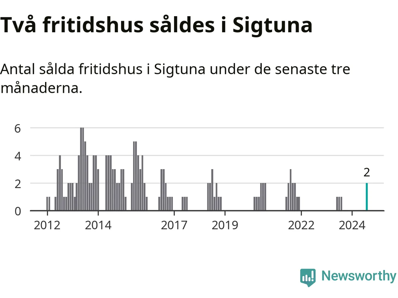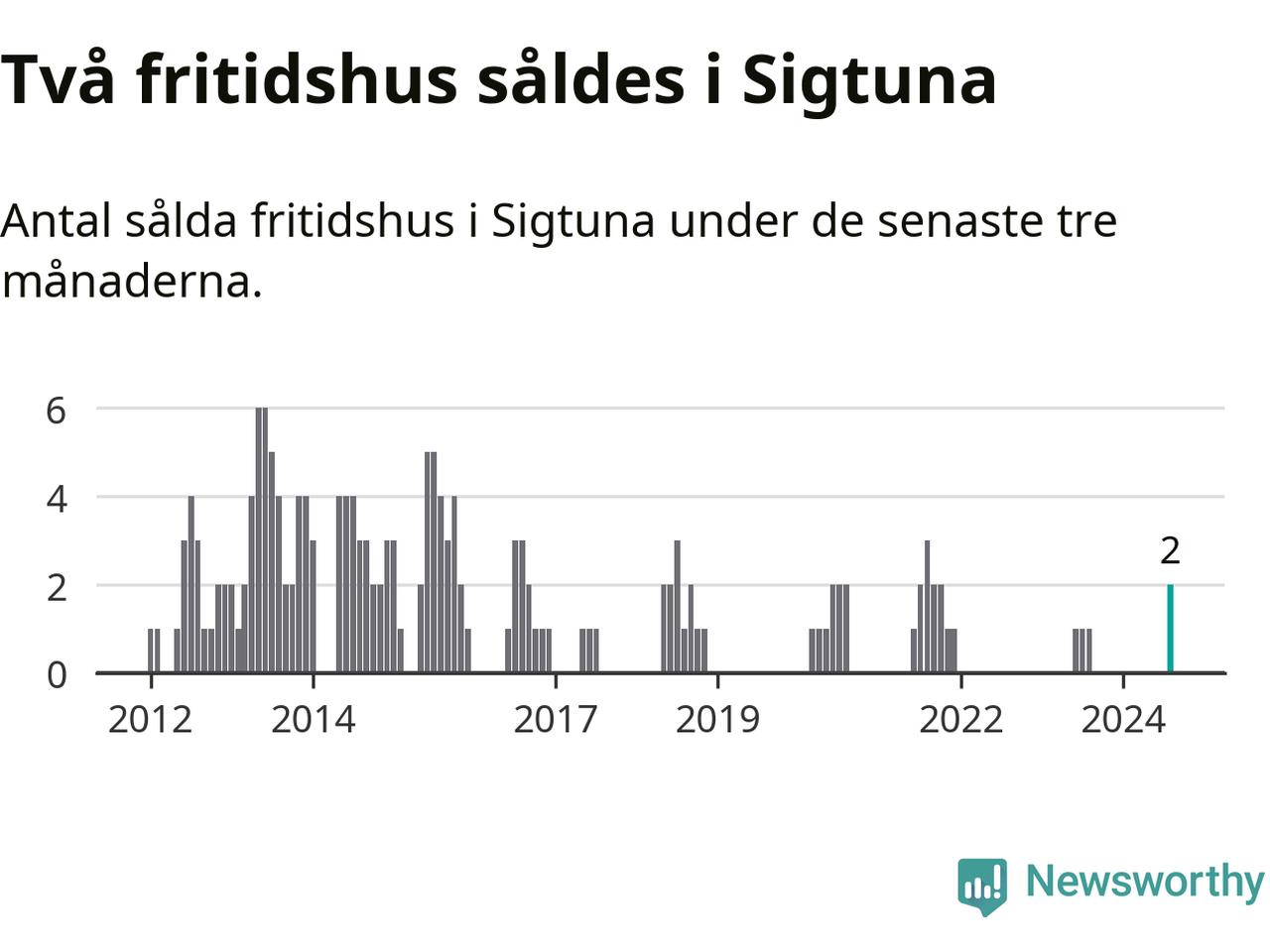 Mellan juni och augusti gjordes sammanlagt två affärer med fritidshus i Sigtuna kommun. Det kan jämföras med ett vid motsvarande tid i fjol.