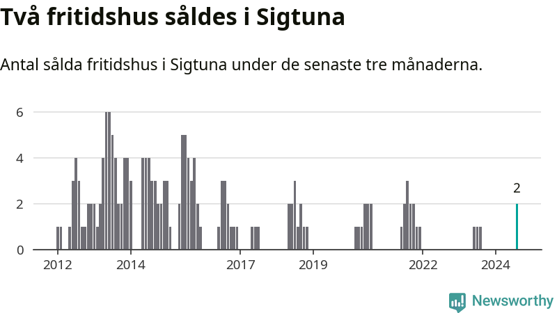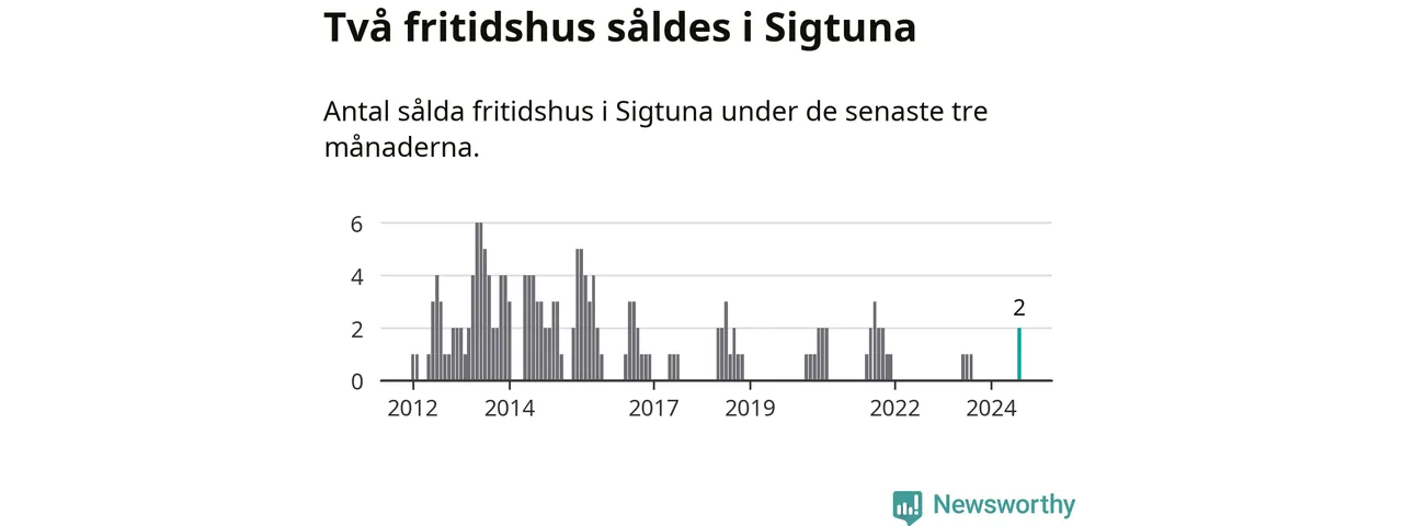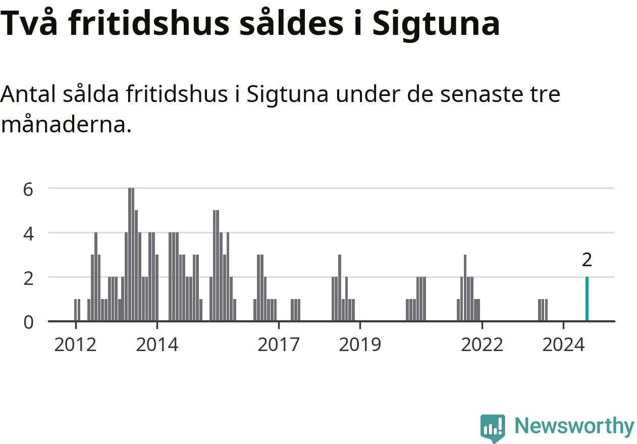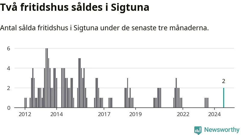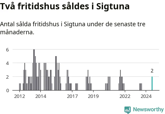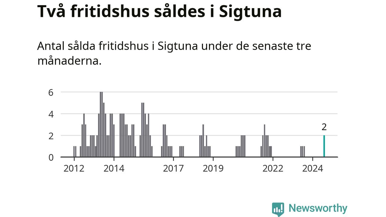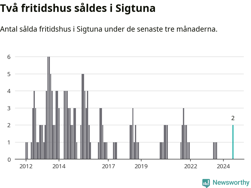 Mellan juni och augusti gjordes sammanlagt två affärer med fritidshus i Sigtuna kommun. Det kan jämföras med ett vid motsvarande tid i fjol.