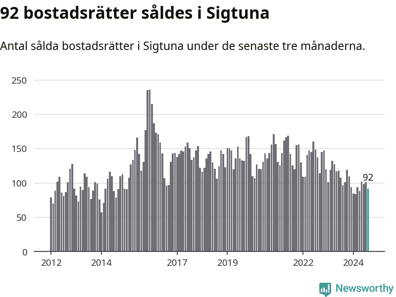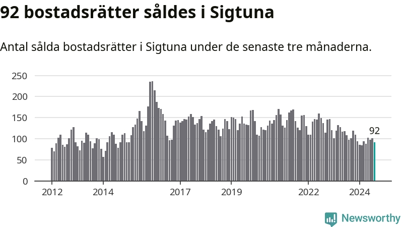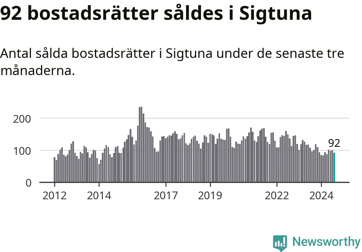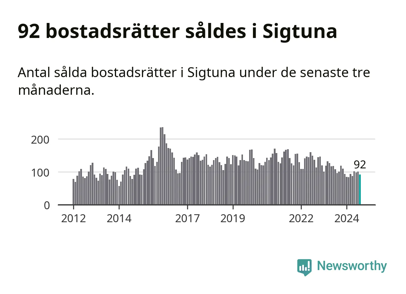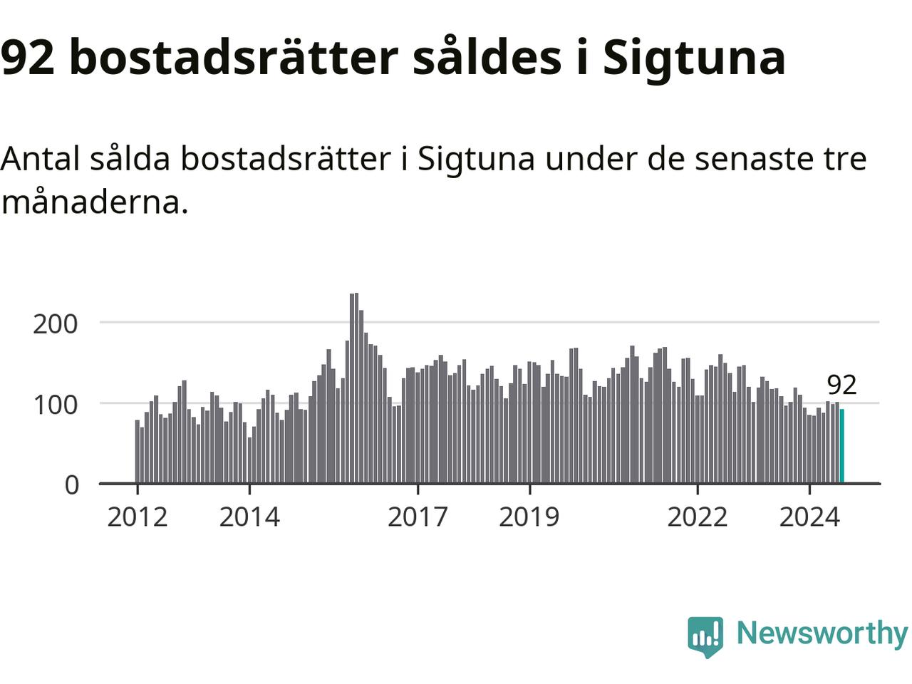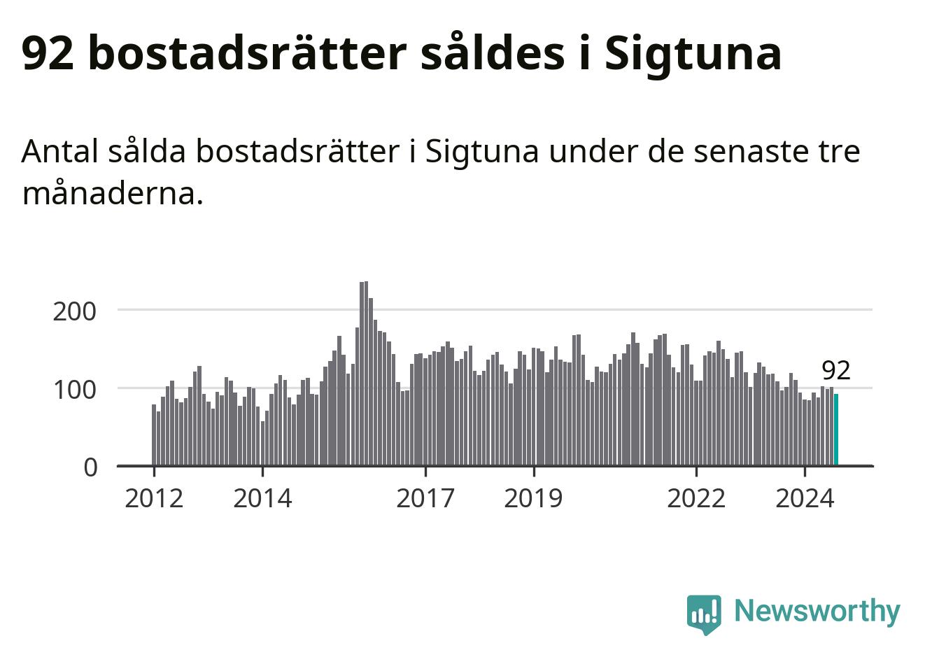 Sammanlagt såldes 92 bostadsrätter i Sigtuna kommun mellan juni och augusti till ett genomsnittligt pris på 2,1 miljoner kronor. I fjol gjordes 97 affärer vid den här tiden på året.
