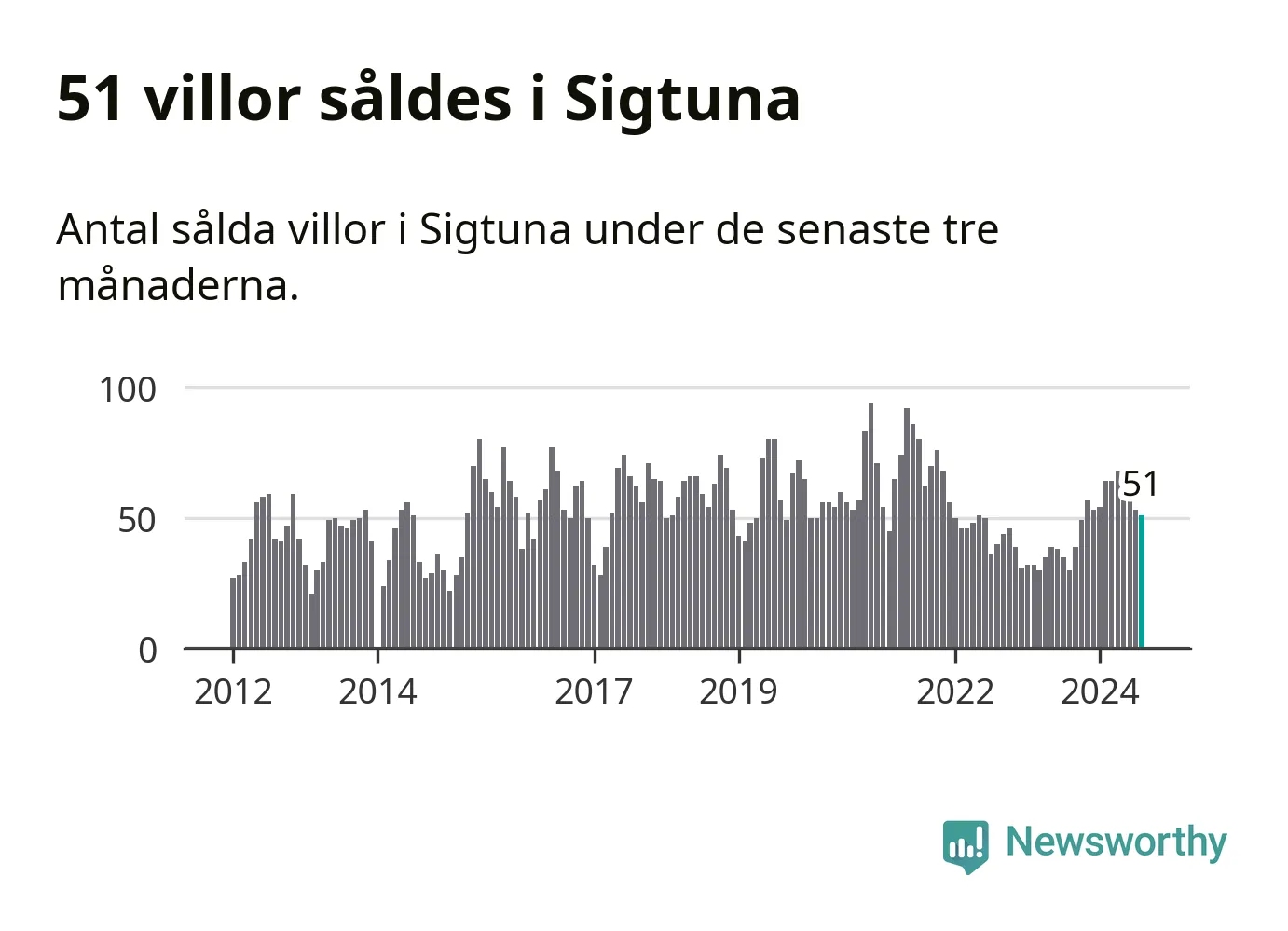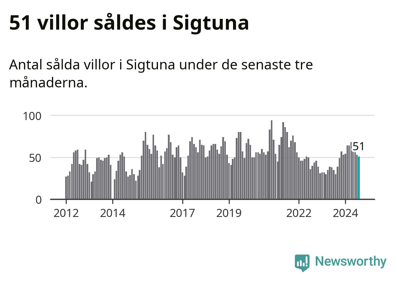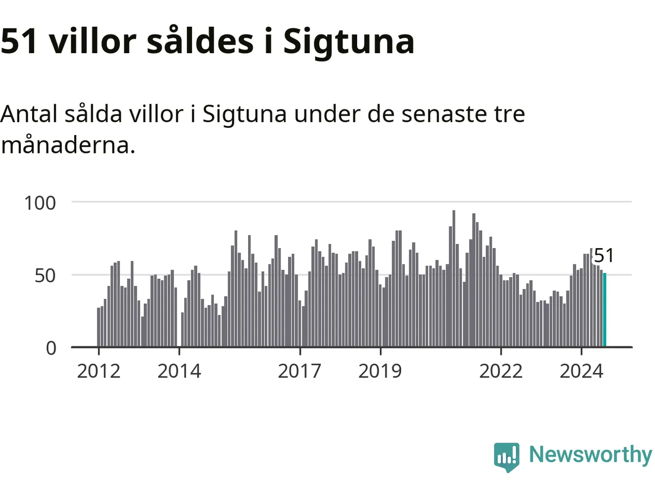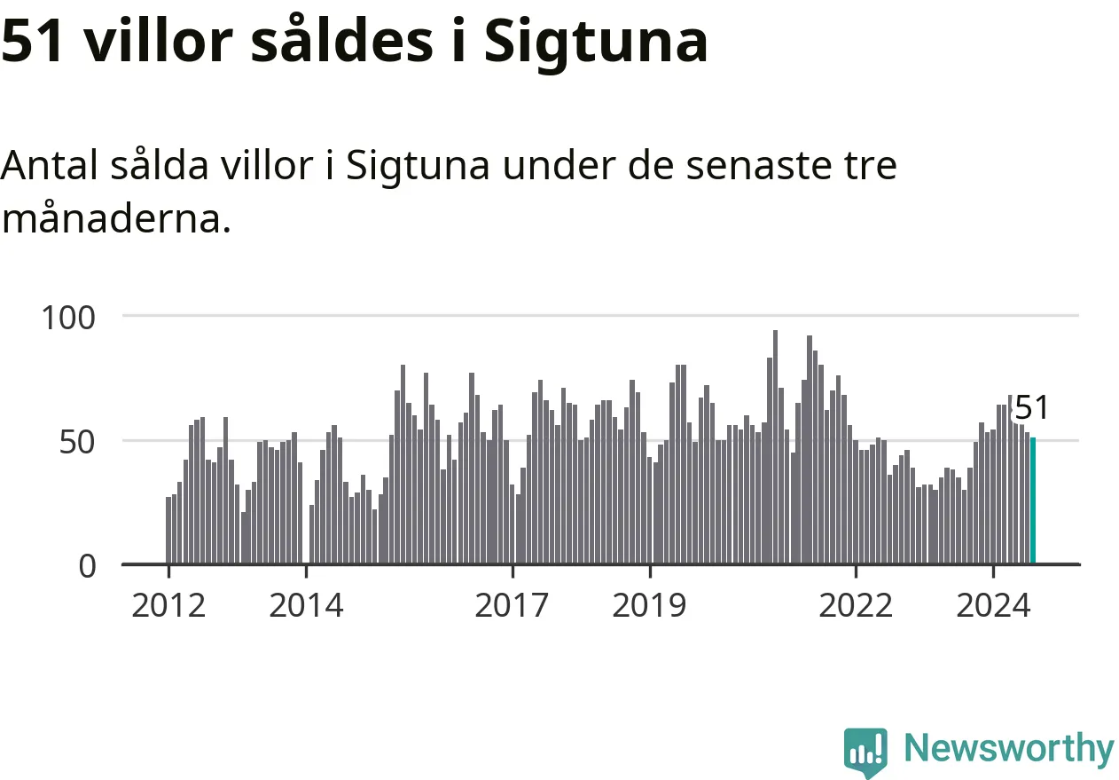 Sammanlagt såldes 51 villor i Sigtuna kommun mellan juni och augusti till ett genomsnittligt pris på 5,1 miljoner kronor. I fjol gjordes 30 affärer vid den här tiden på året.