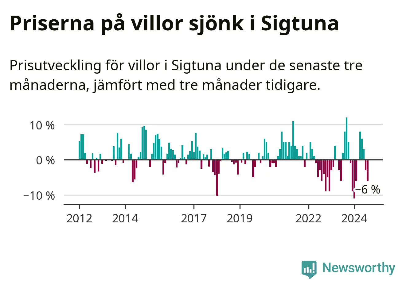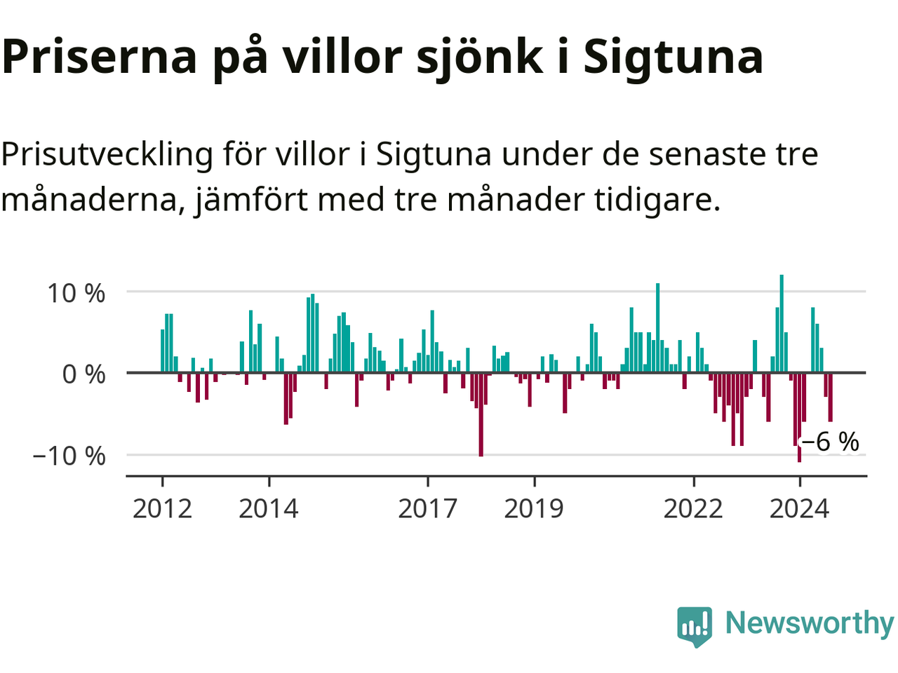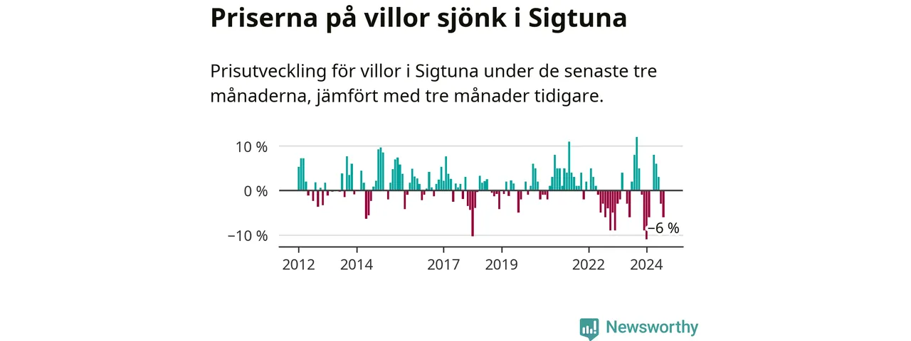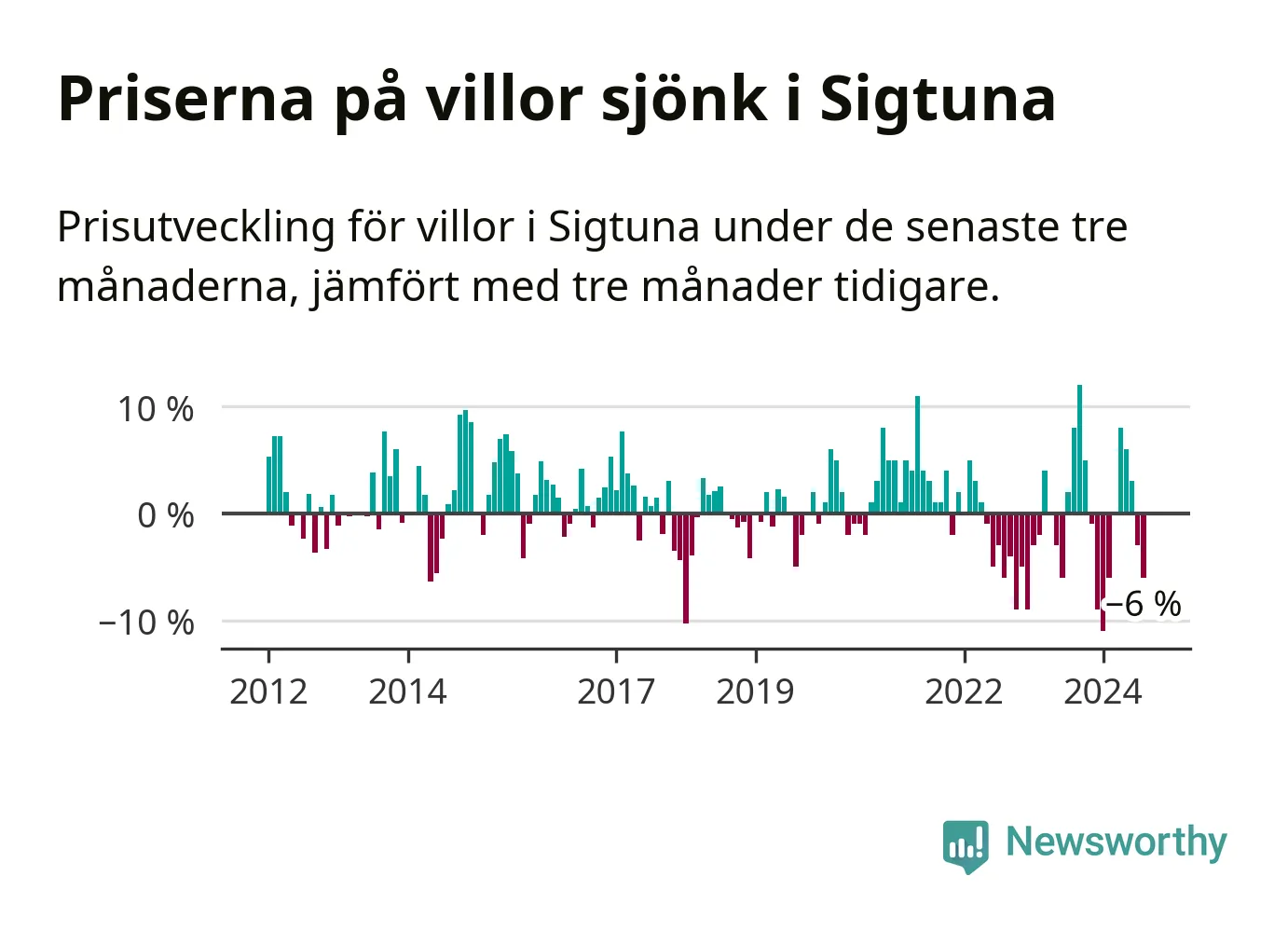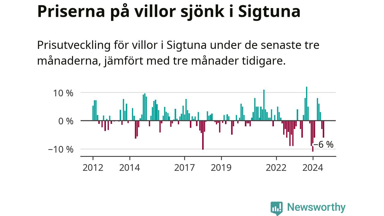 Villapriserna har gått ner i Sigtuna kommun. Medelpriset på försäljningarna under de senaste tre månaderna visar på en nedgång med 6 procent.