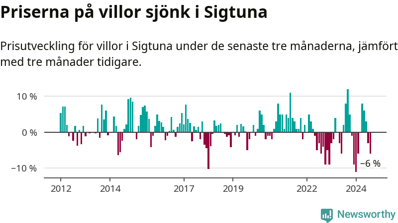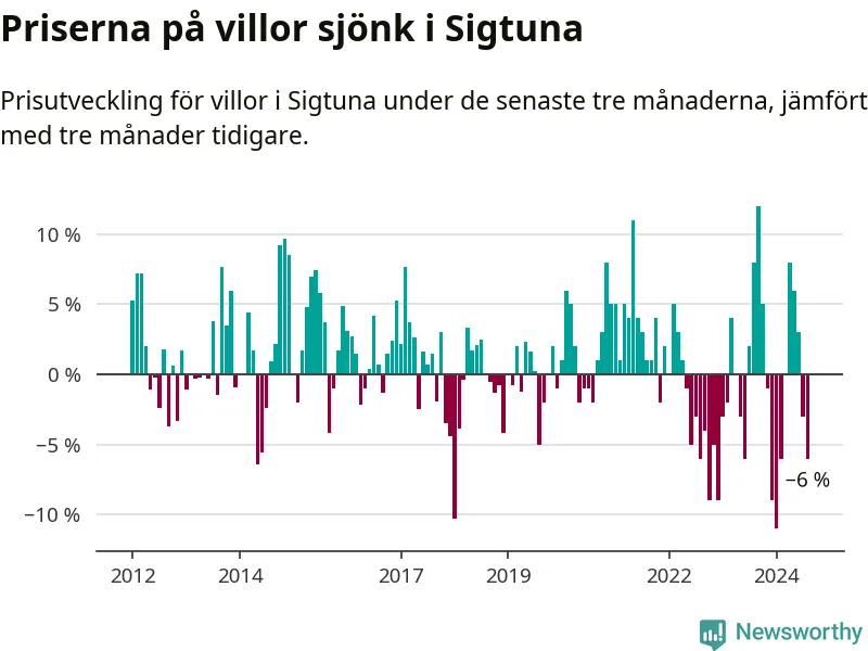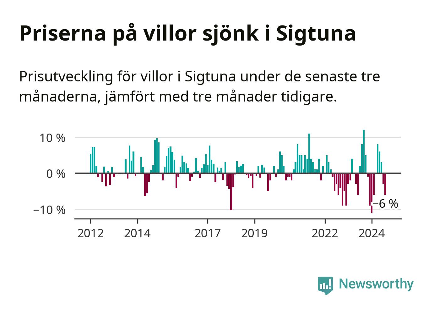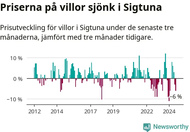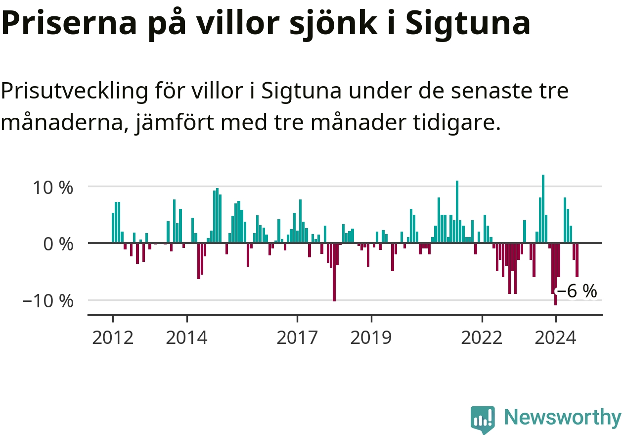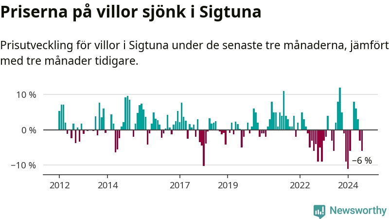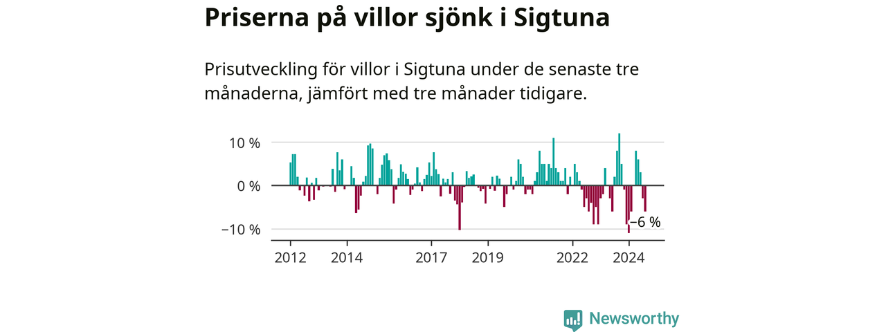 Villapriserna har gått ner i Sigtuna kommun. Medelpriset på försäljningarna under de senaste tre månaderna visar på en nedgång med 6 procent.