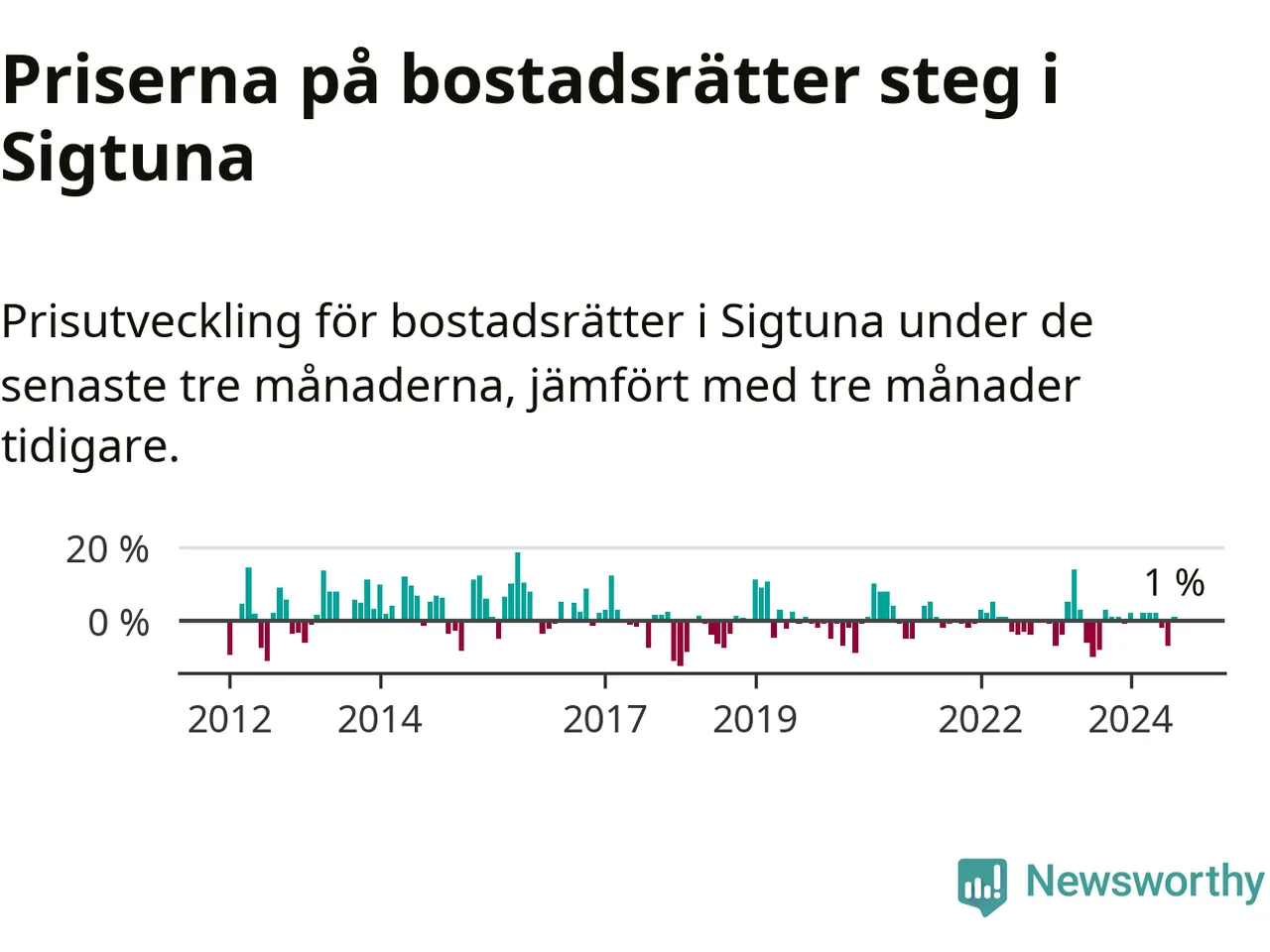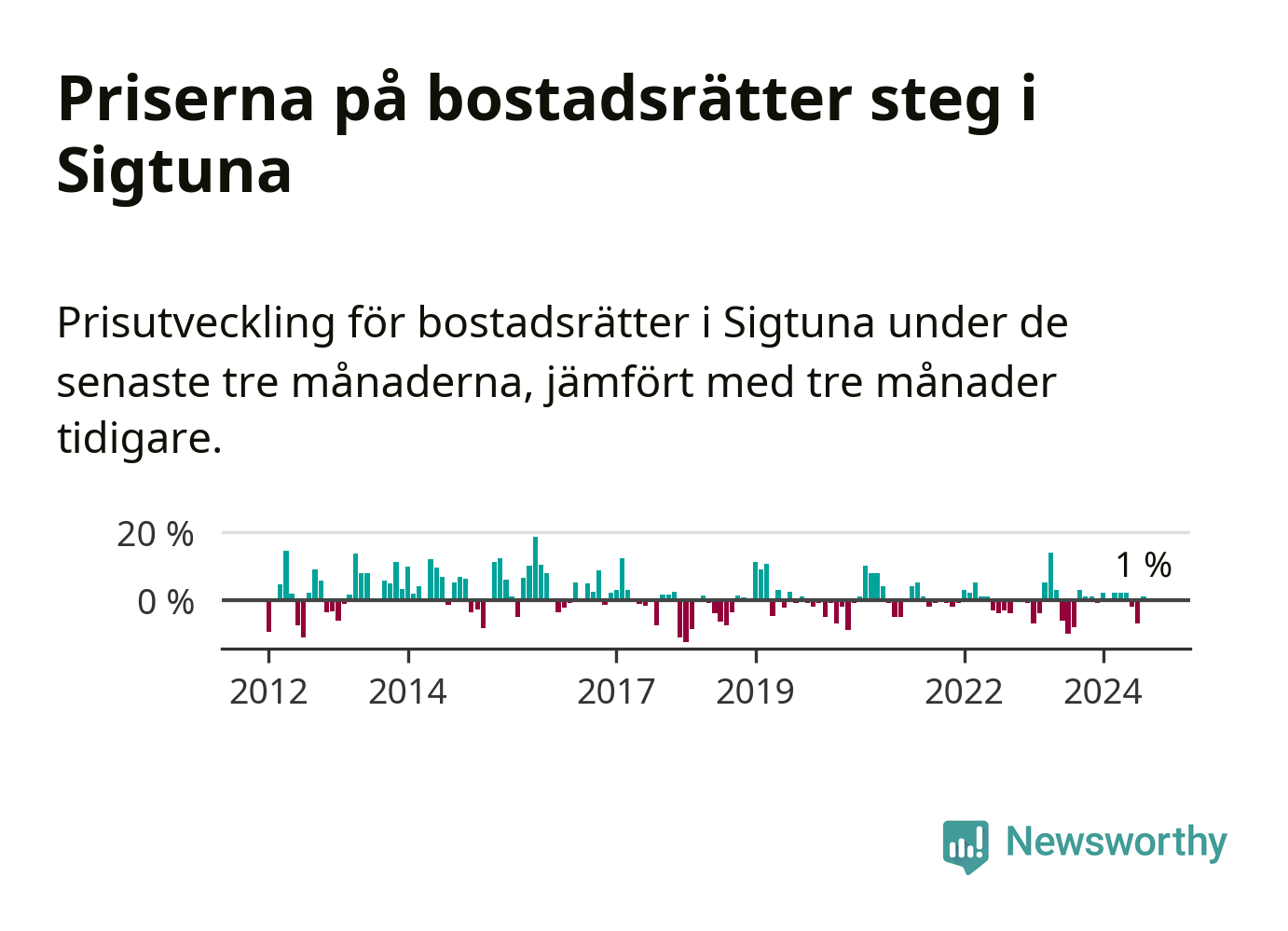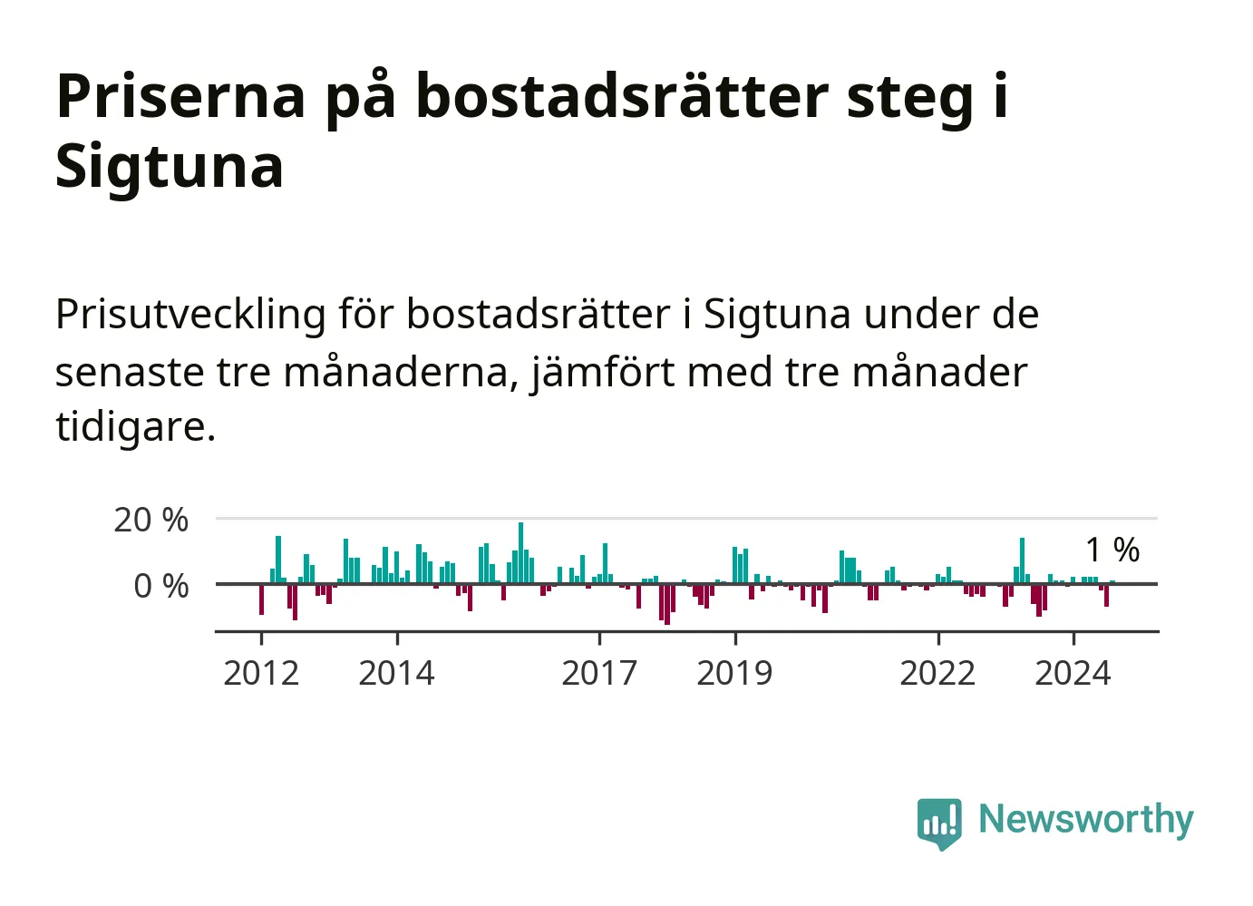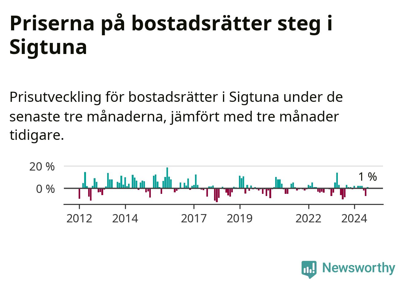 Priserna på bostadsrätter har gått upp i Sigtuna kommun. Medelpriset på försäljningarna under de senaste tre månaderna visar på en uppgång med 1 procent.
