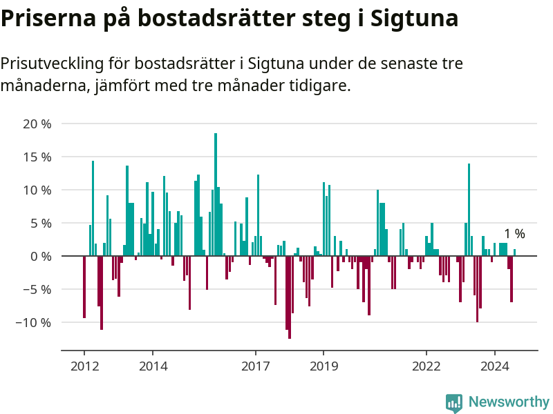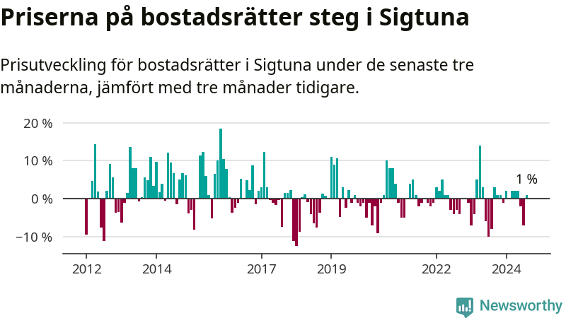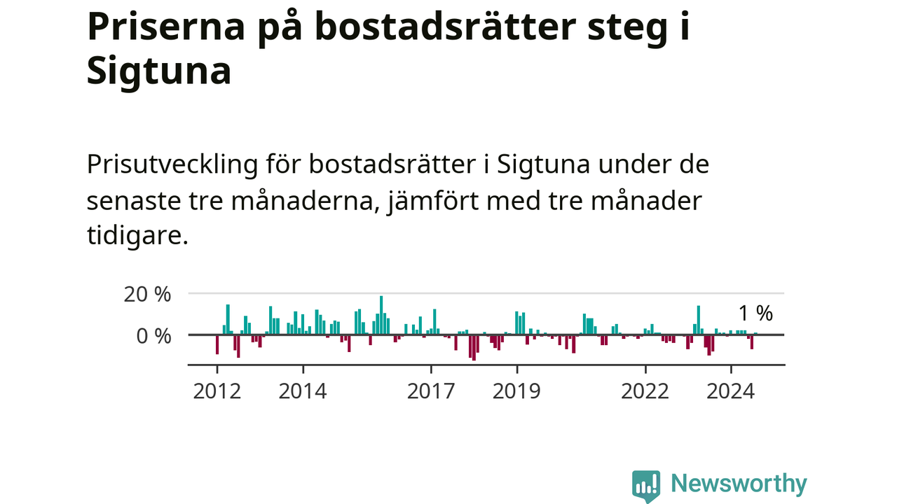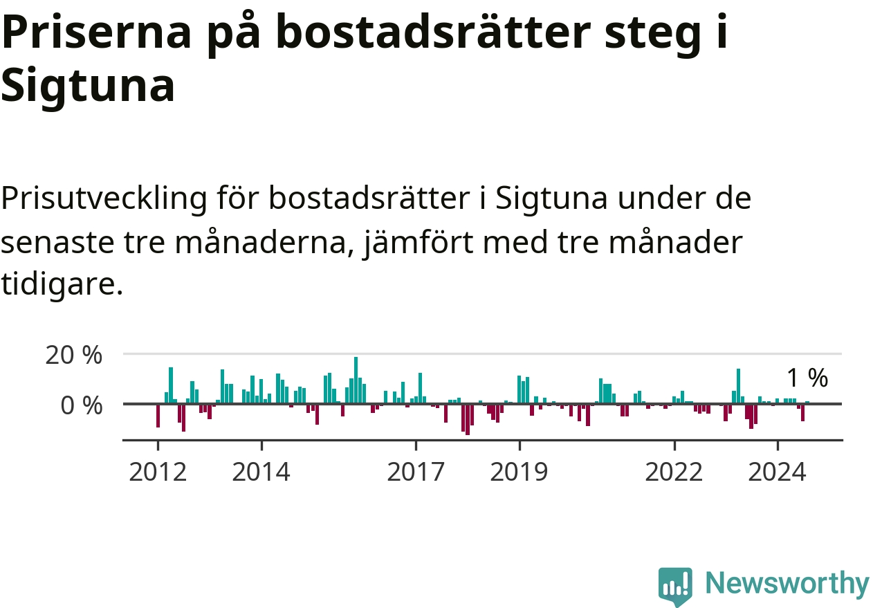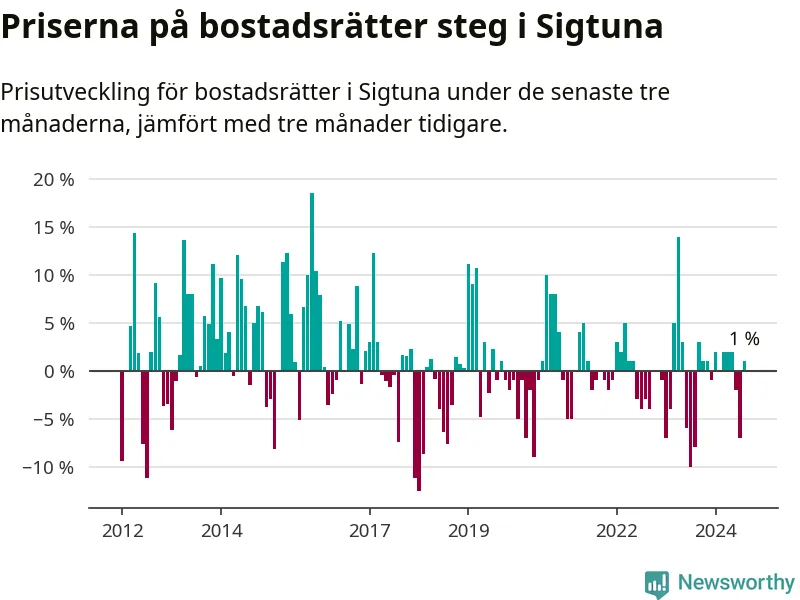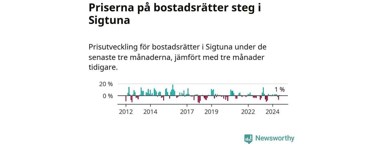Priserna på bostadsrätter har gått upp i Sigtuna kommun. Medelpriset på försäljningarna under de senaste tre månaderna visar på en uppgång med 1 procent.