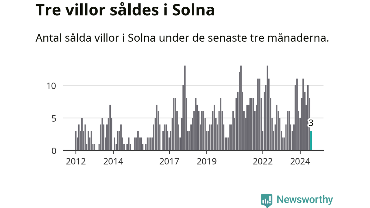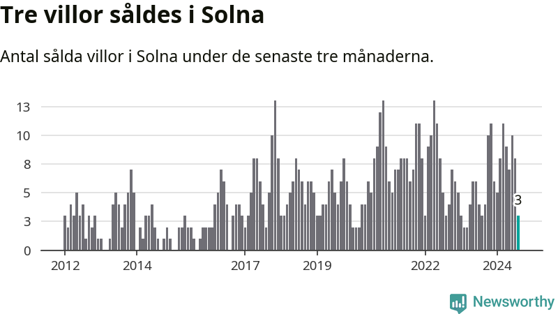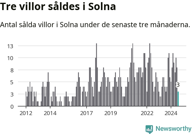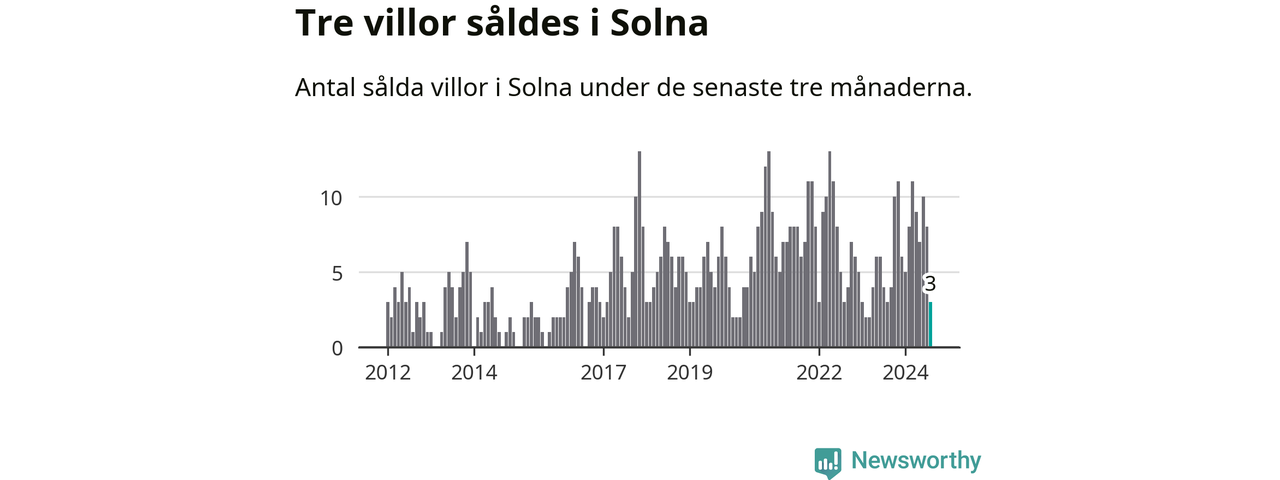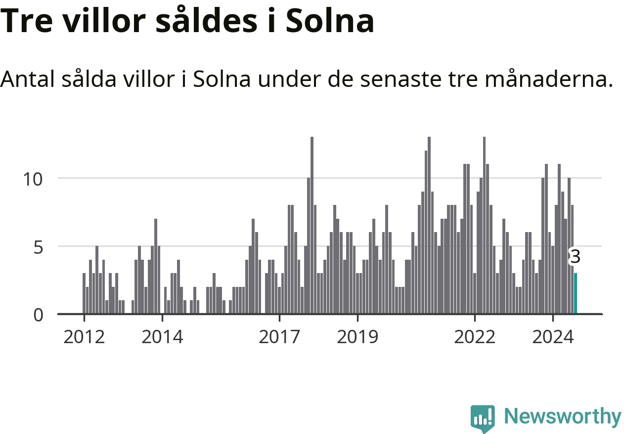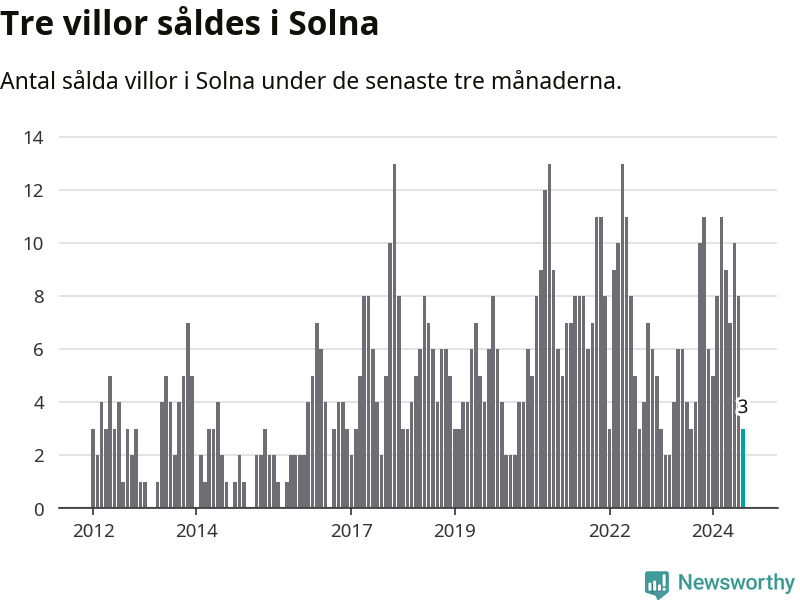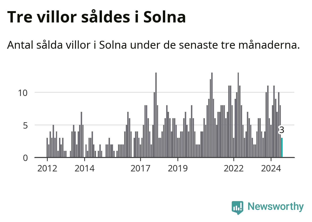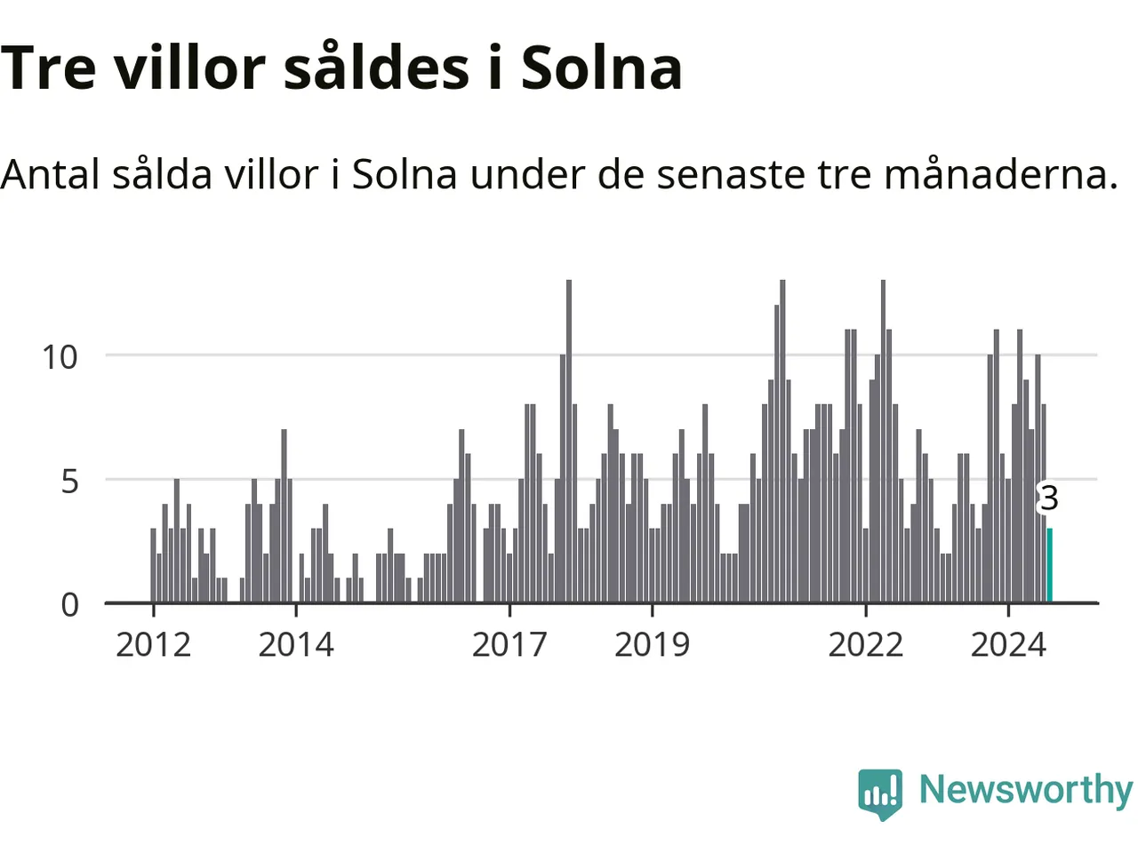 Mellan juni och augusti gjordes sammanlagt tre affärer med villor i Solna kommun. Det är lika många affärer som vid motsvarande tid i fjol.