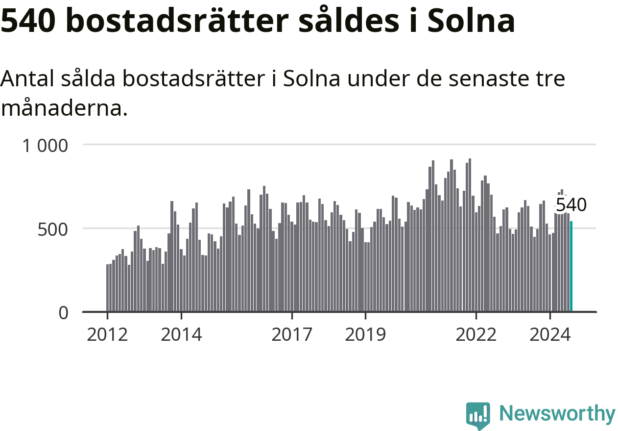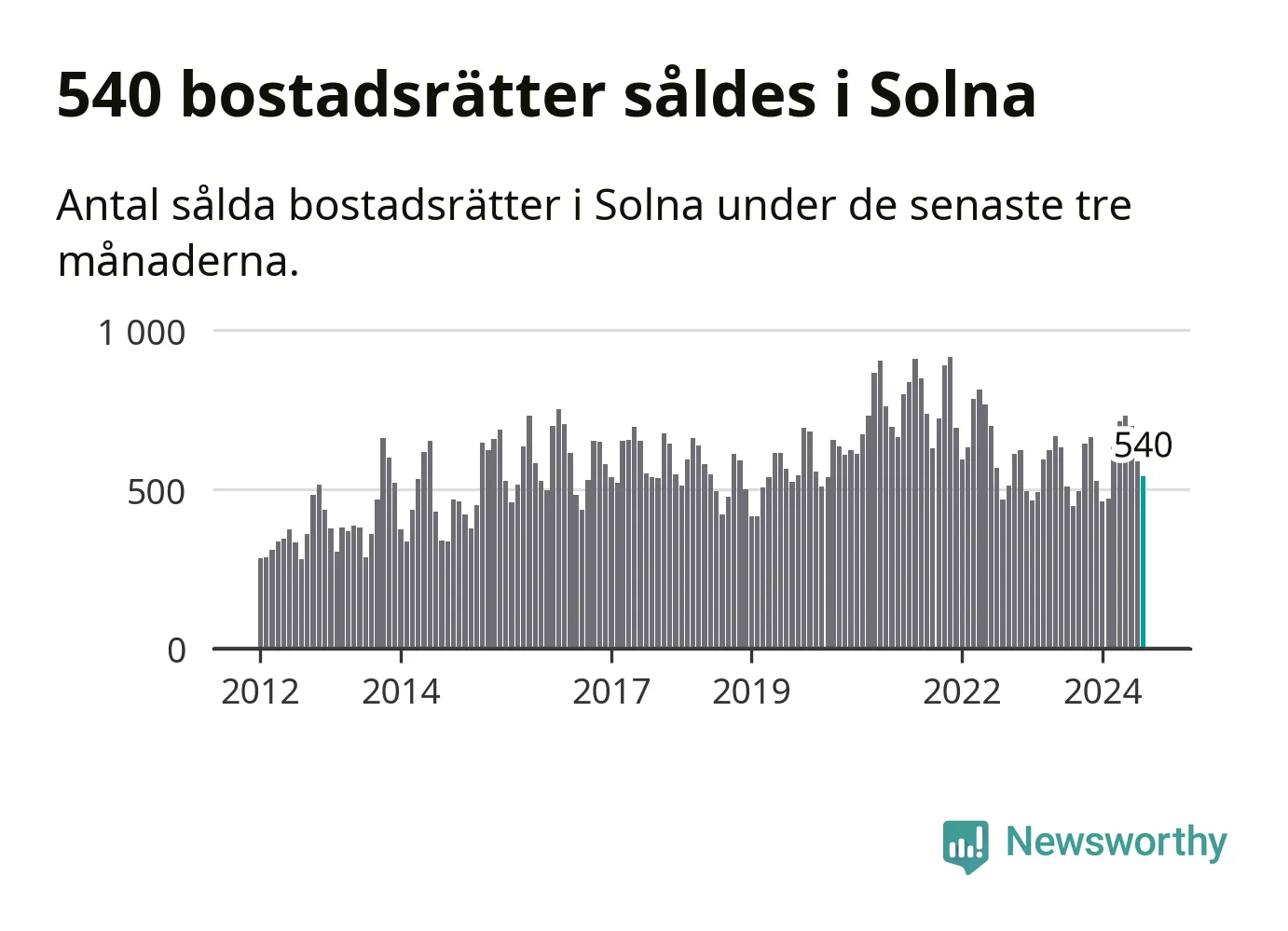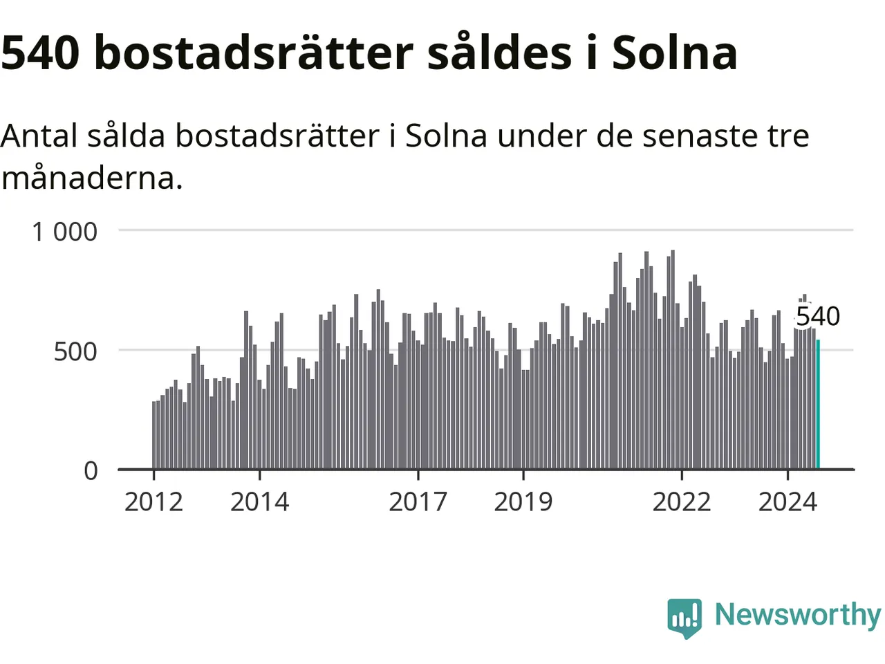 Sammanlagt såldes 540 bostadsrätter i Solna kommun mellan juni och augusti till ett genomsnittligt pris på 3,8 miljoner kronor. I fjol gjordes 448 affärer vid den här tiden på året.