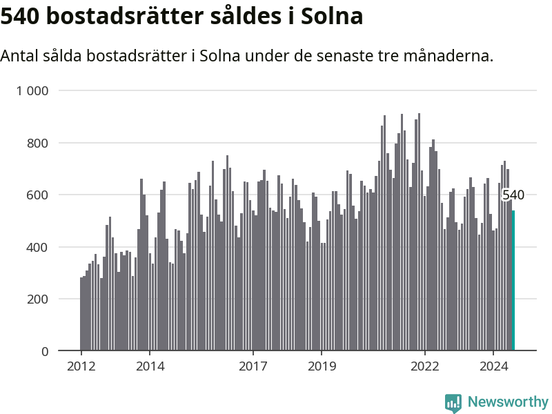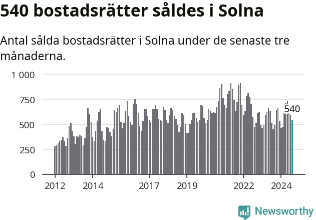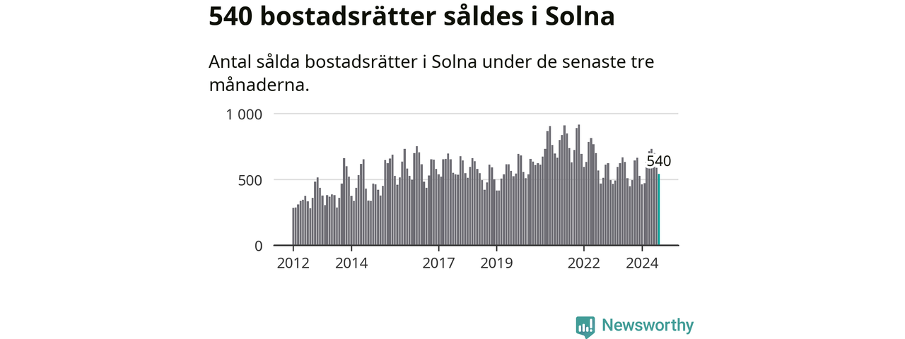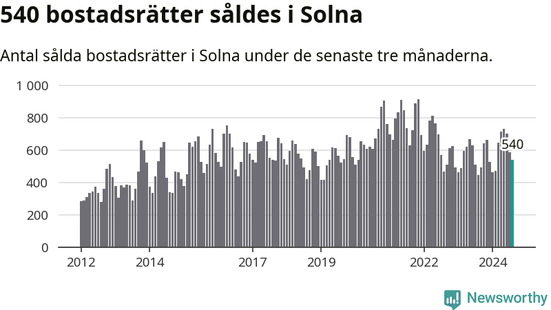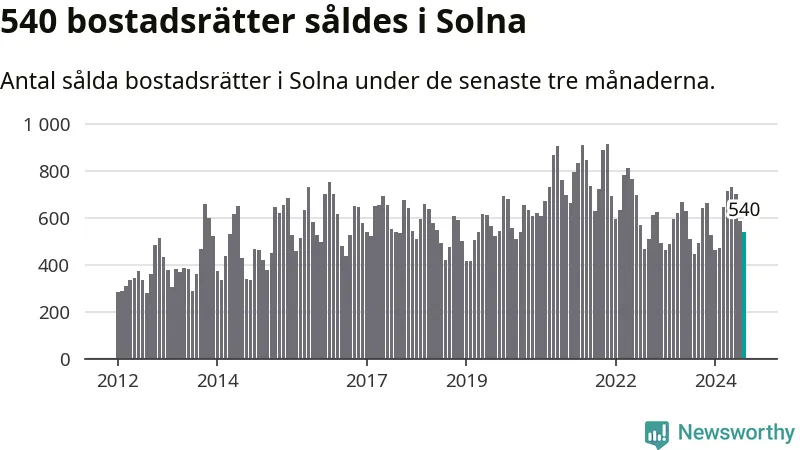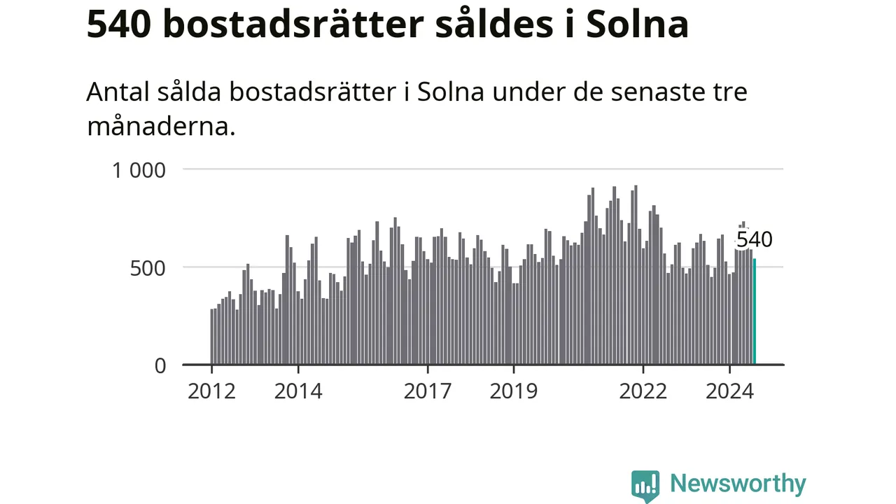 Sammanlagt såldes 540 bostadsrätter i Solna kommun mellan juni och augusti till ett genomsnittligt pris på 3,8 miljoner kronor. I fjol gjordes 448 affärer vid den här tiden på året.