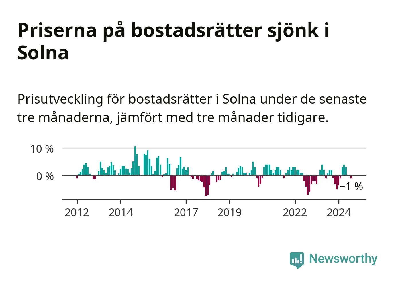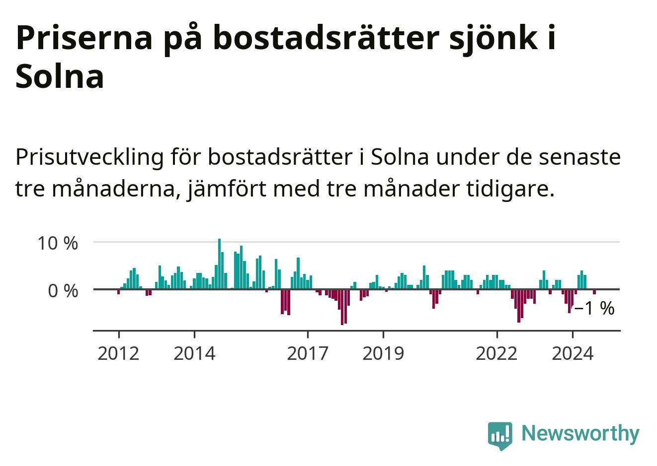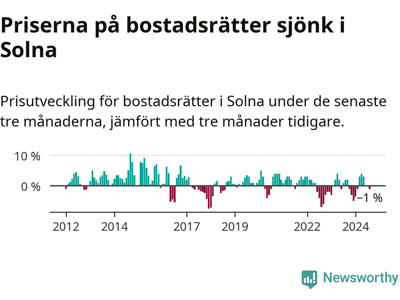 Priserna på bostadsrätter har gått ner i Solna kommun. Medelpriset på försäljningarna under de senaste tre månaderna visar på en nedgång med 1 procent.