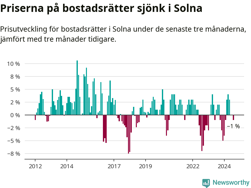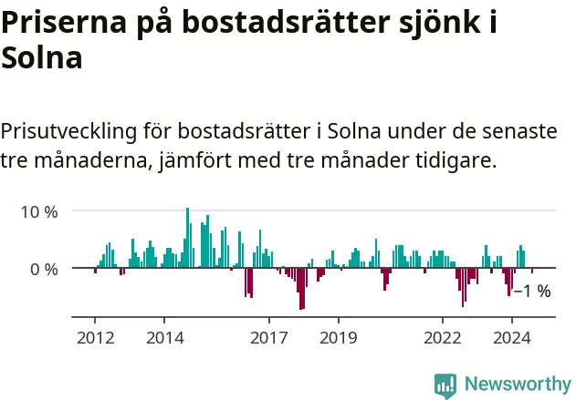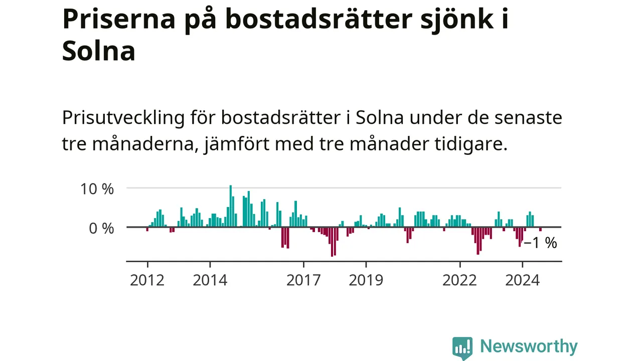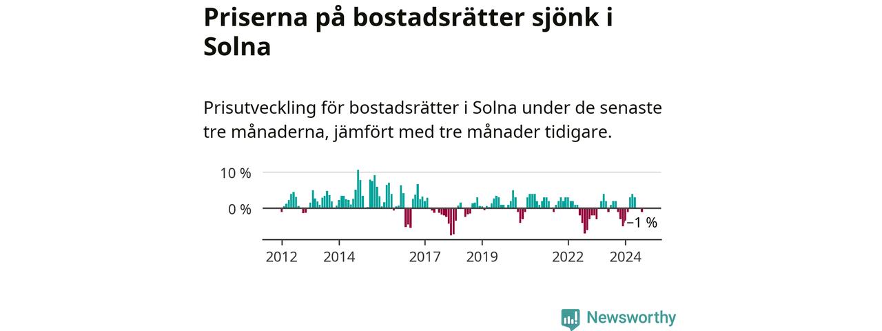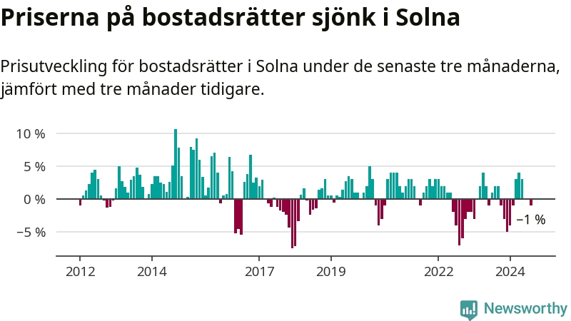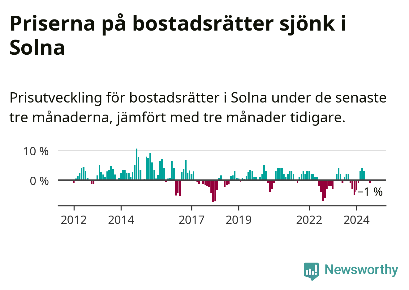 Priserna på bostadsrätter har gått ner i Solna kommun. Medelpriset på försäljningarna under de senaste tre månaderna visar på en nedgång med 1 procent.