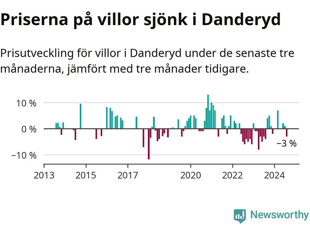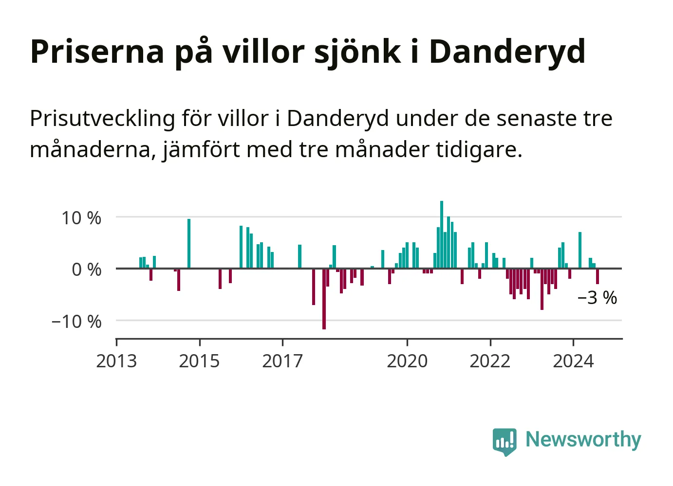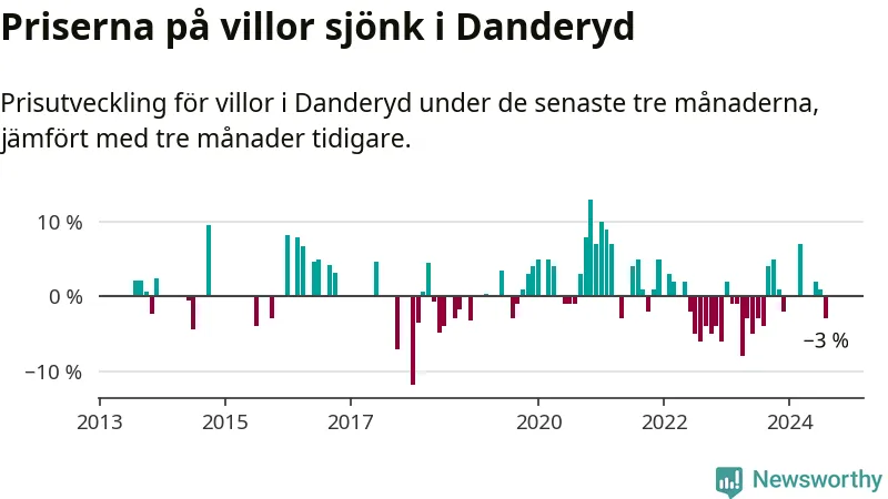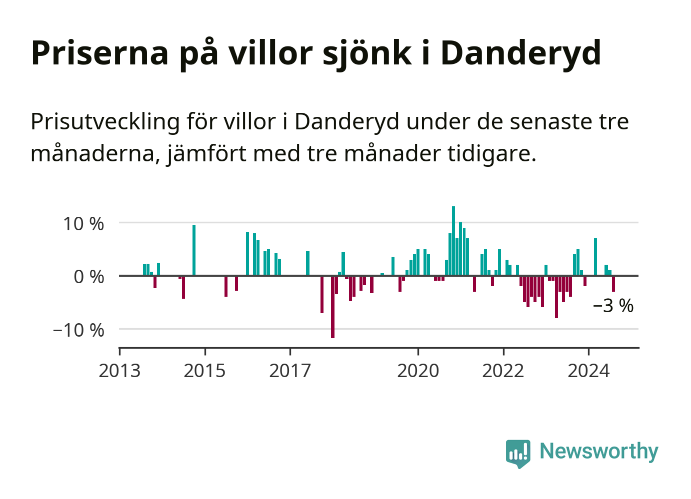 Statistiken visar även på en prisnedgång i Danderyds kommun. Medelpriset på försäljningarna av villor i kommunen var 3 procent lägre än för tre månader sedan. I hela Stockholms län däremot ligger villapriserna stilla.