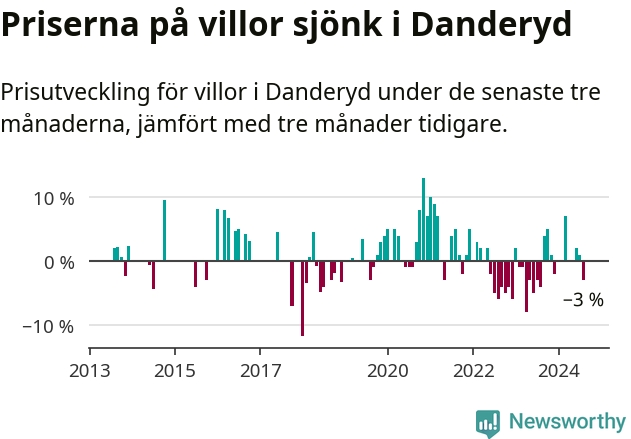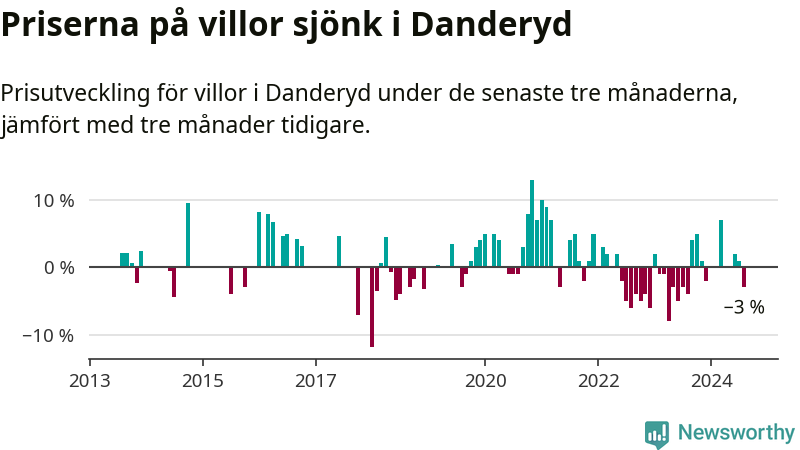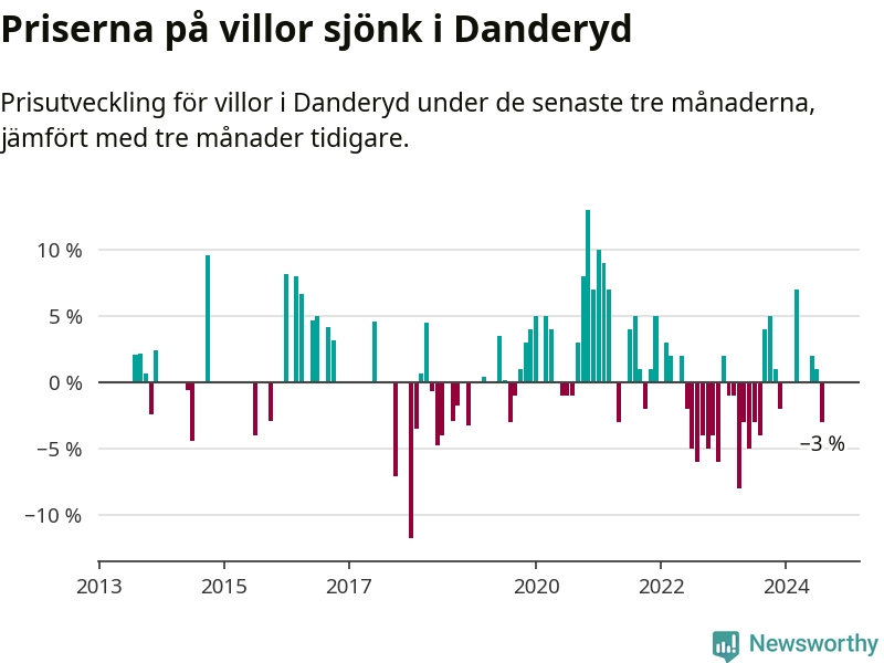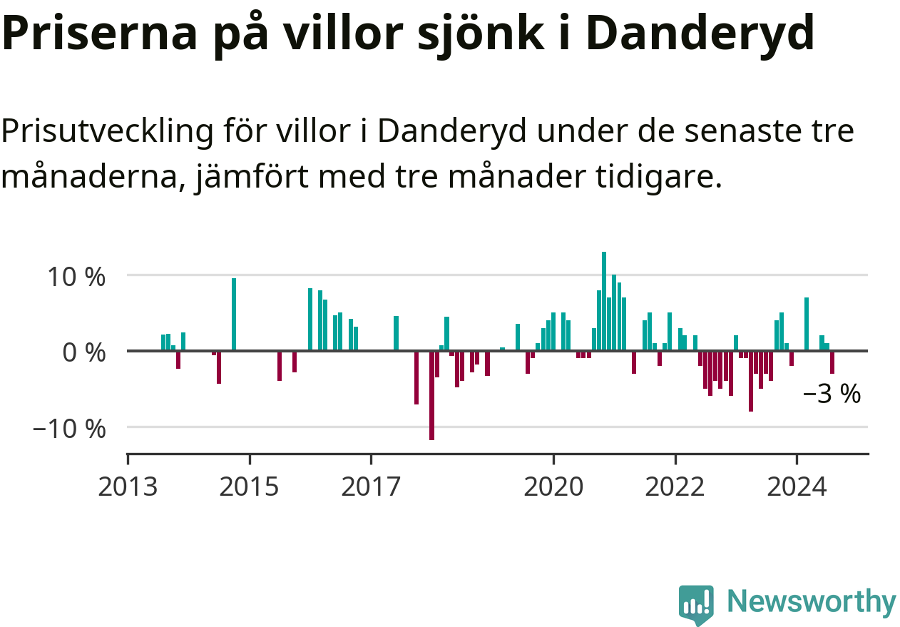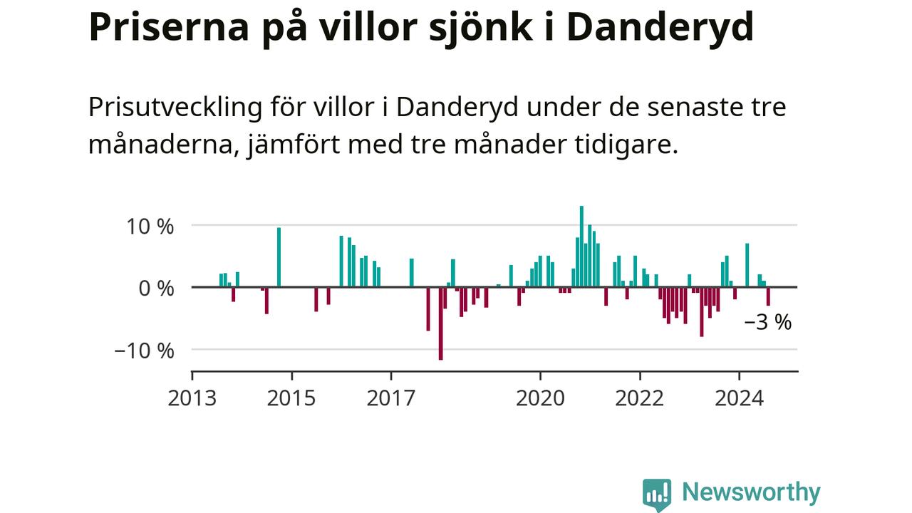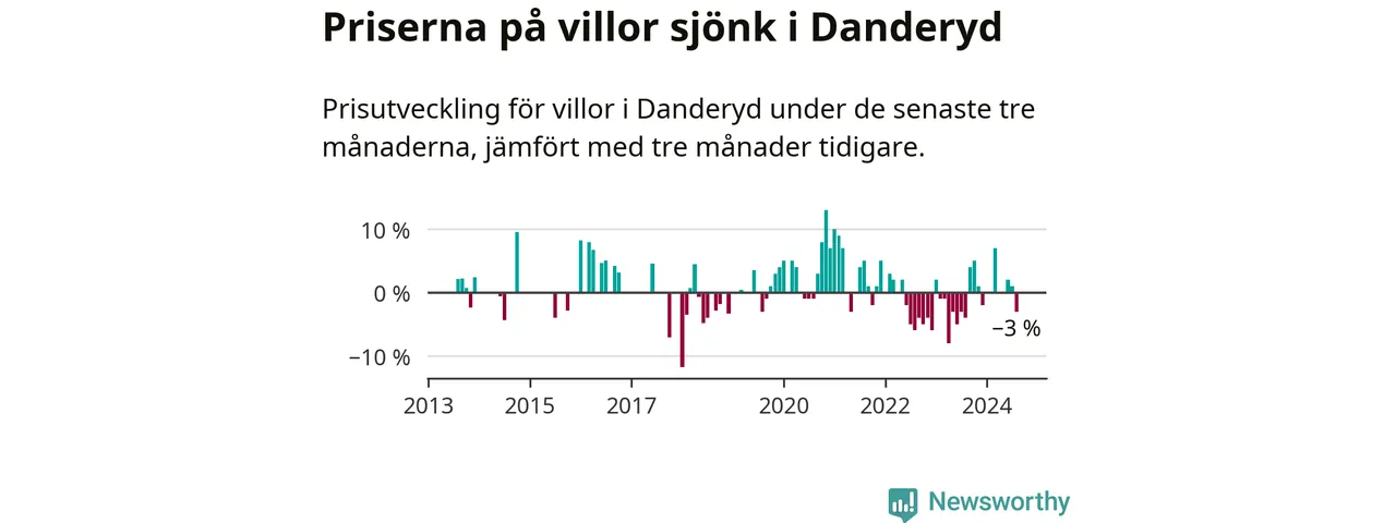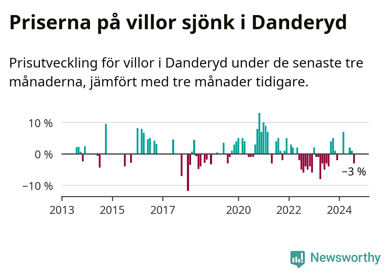 Statistiken visar även på en prisnedgång i Danderyds kommun. Medelpriset på försäljningarna av villor i kommunen var 3 procent lägre än för tre månader sedan. I hela Stockholms län däremot ligger villapriserna stilla.