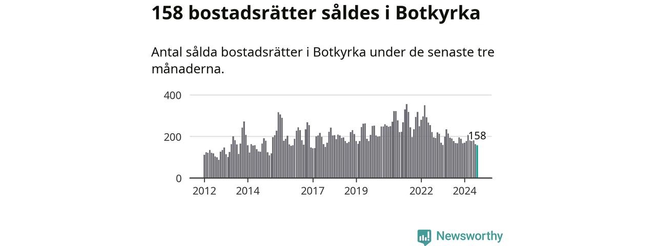 De sålda bostadsrätterna i Botkyrka kommun hade ett genomsnittligt pris på 2,1 miljoner kronor. I fjol gjordes 168 affärer vid den här tiden på året.