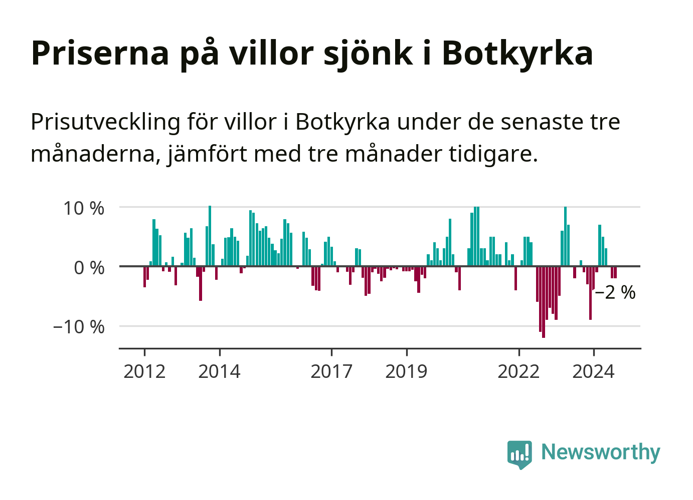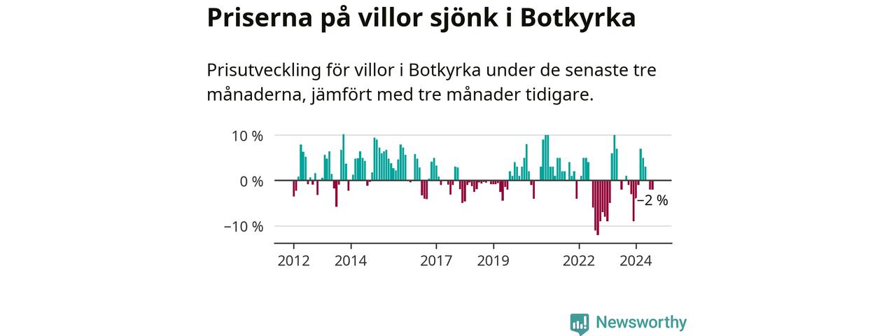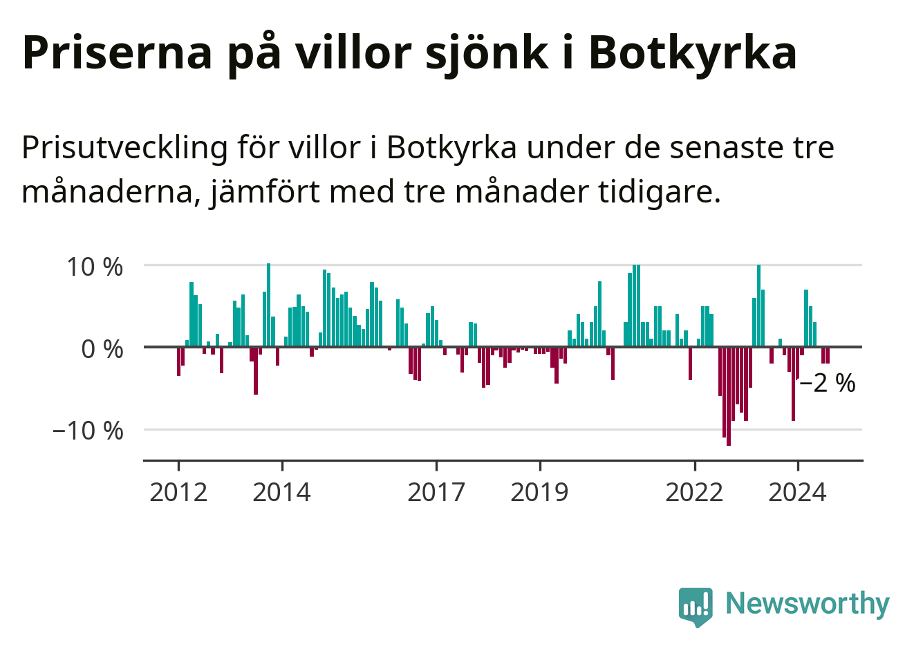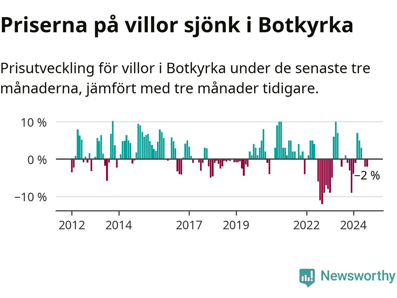 Statistiken visar även på en prisnedgång i Botkyrka kommun. Medelpriset på försäljningarna av villor i kommunen var 2 procent lägre än för tre månader sedan. I hela Stockholms län däremot ligger villapriserna stilla.