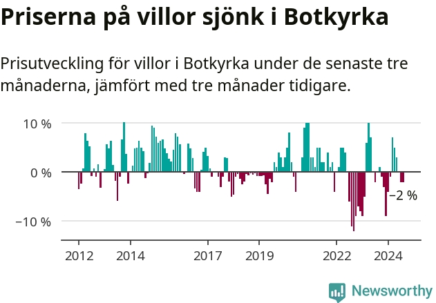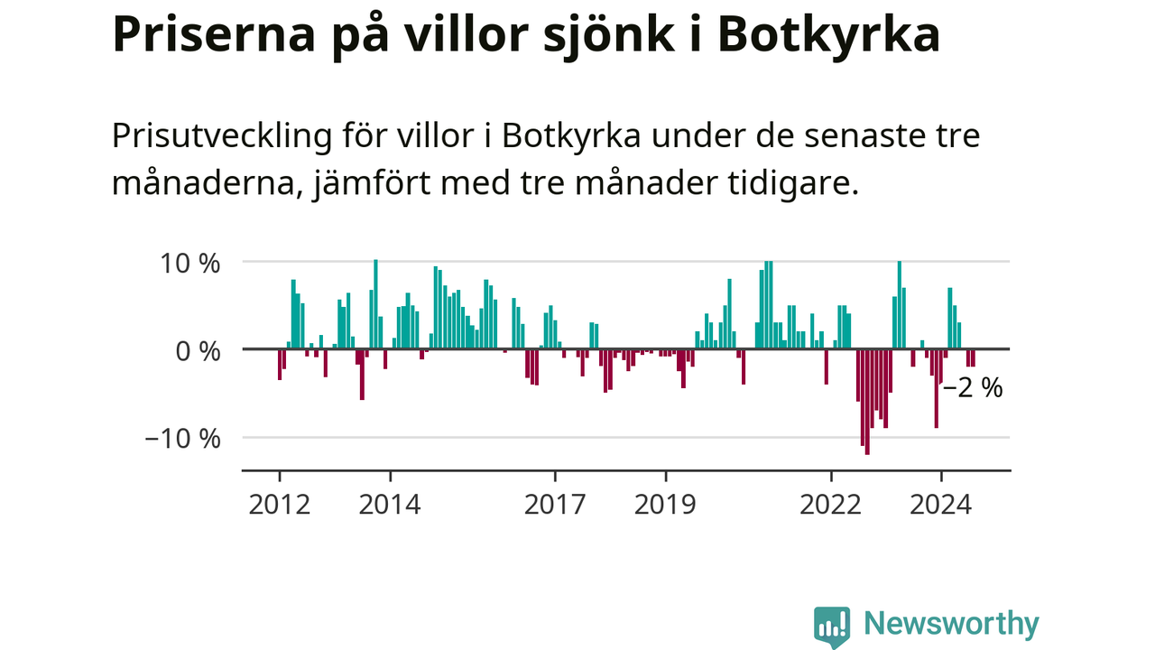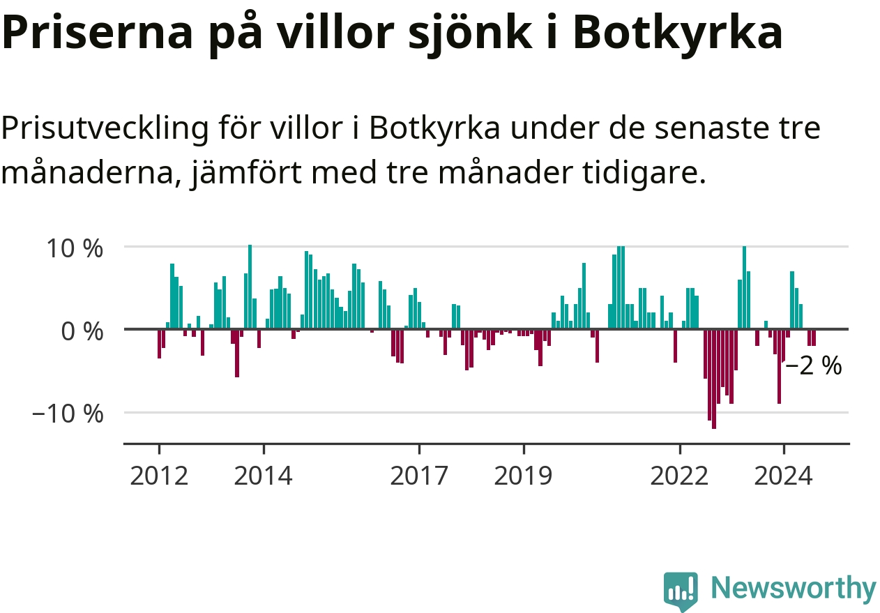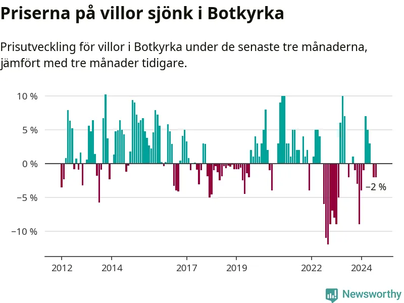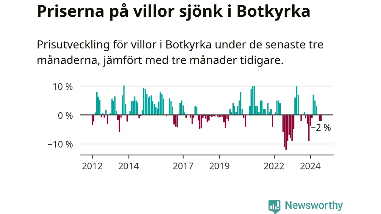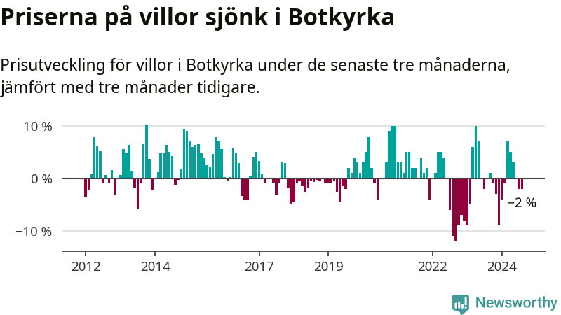 Statistiken visar även på en prisnedgång i Botkyrka kommun. Medelpriset på försäljningarna av villor i kommunen var 2 procent lägre än för tre månader sedan. I hela Stockholms län däremot ligger villapriserna stilla.