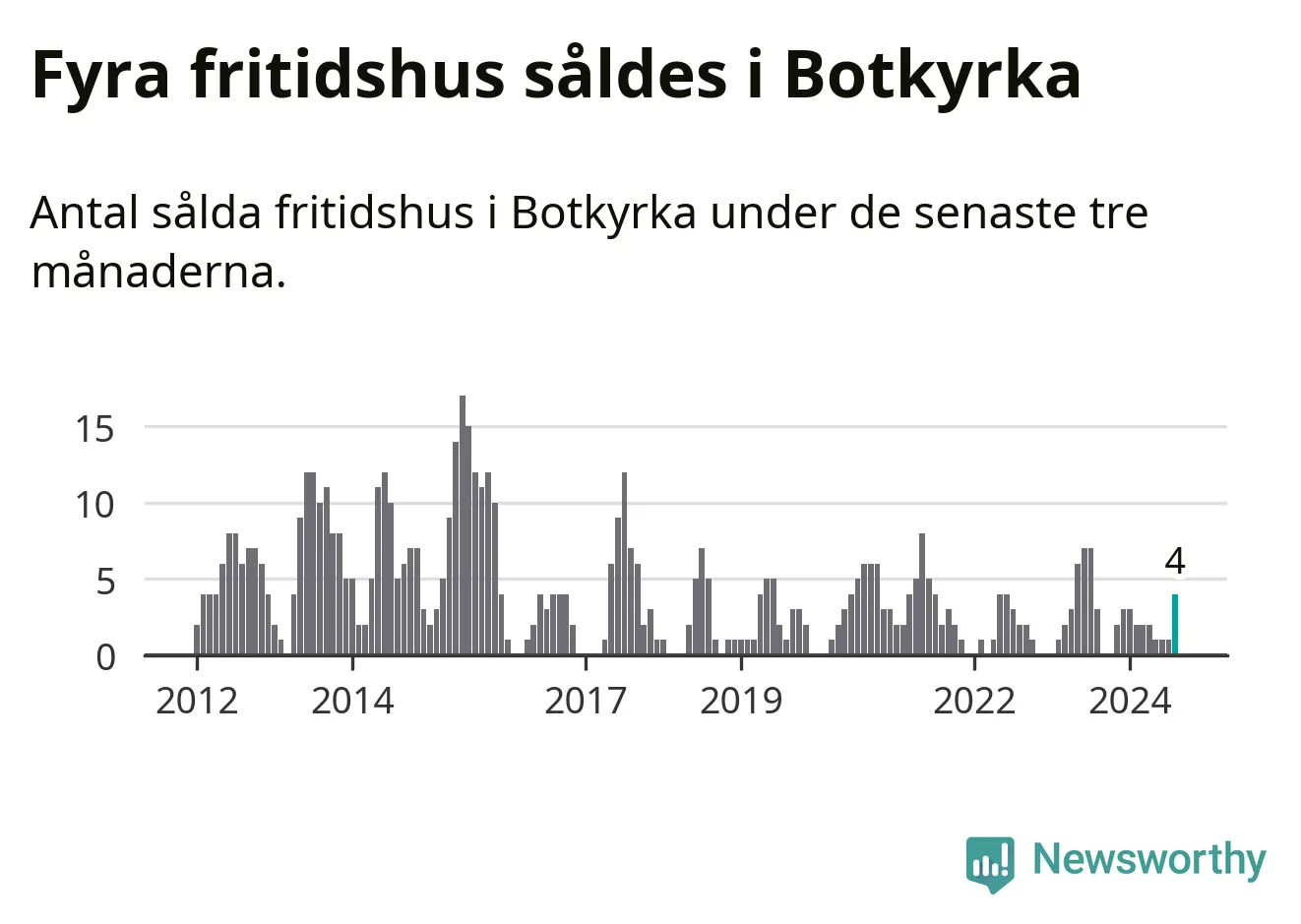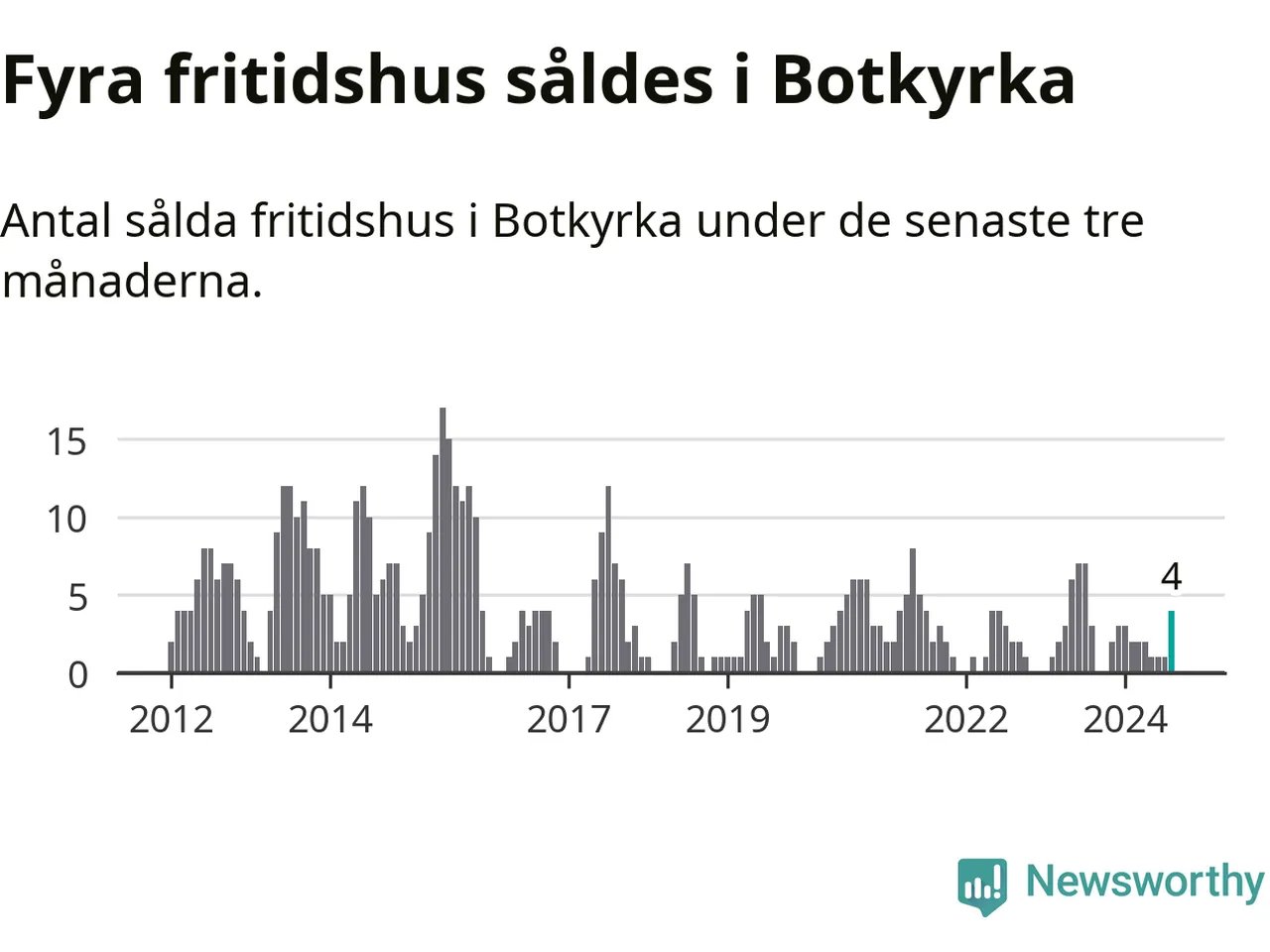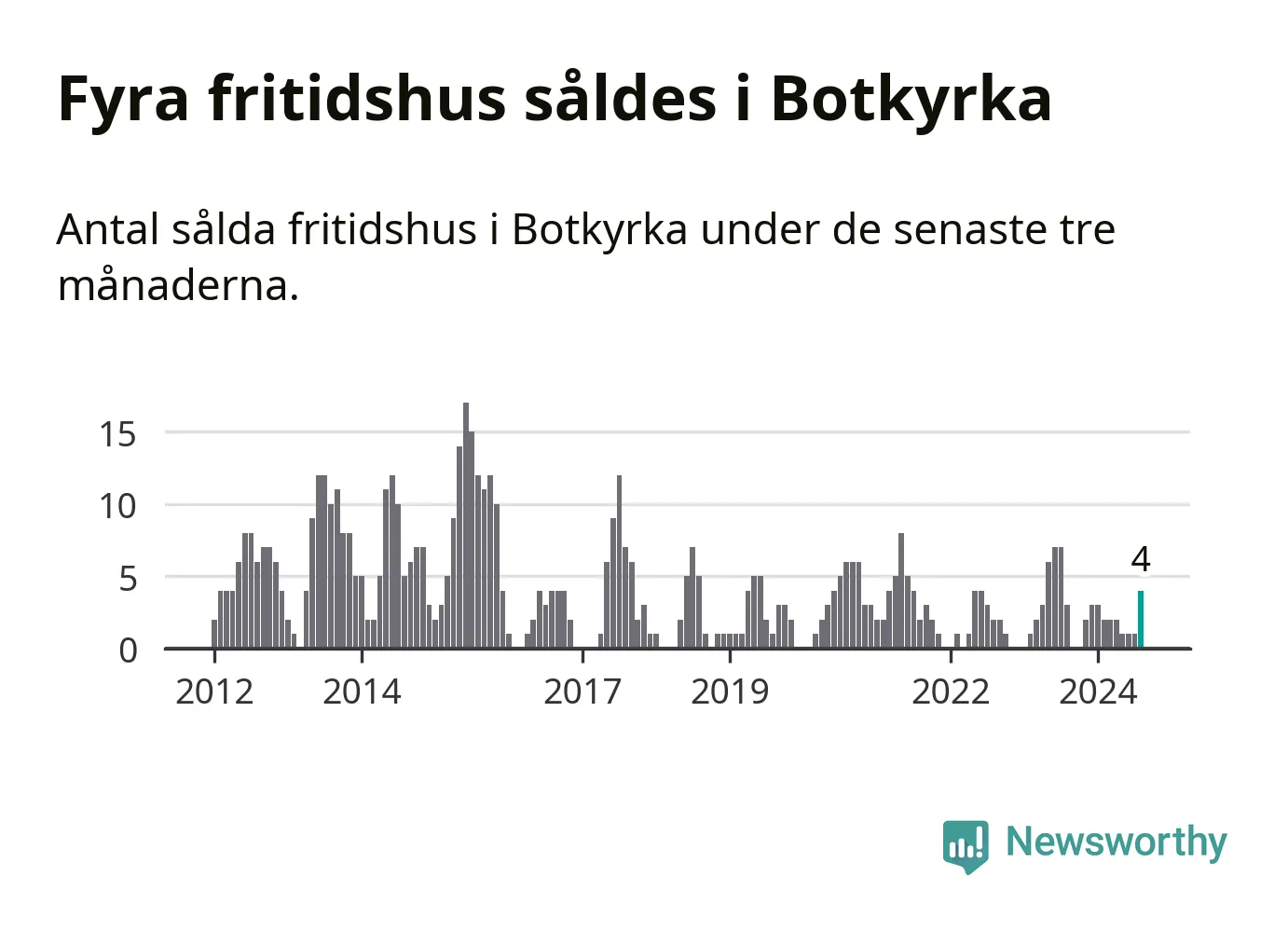 Mellan juni och augusti gjordes sammanlagt fyra affärer med fritidshus i Botkyrka kommun. Det kan jämföras med tre vid motsvarande tid i fjol.