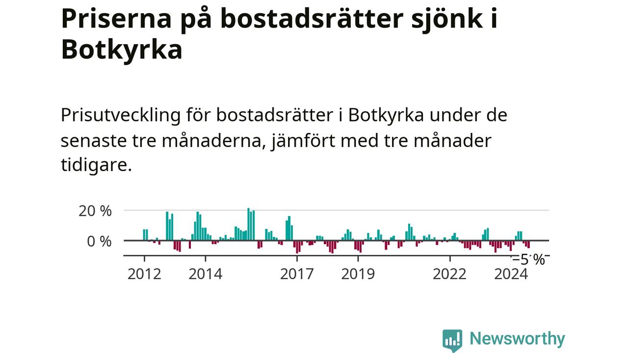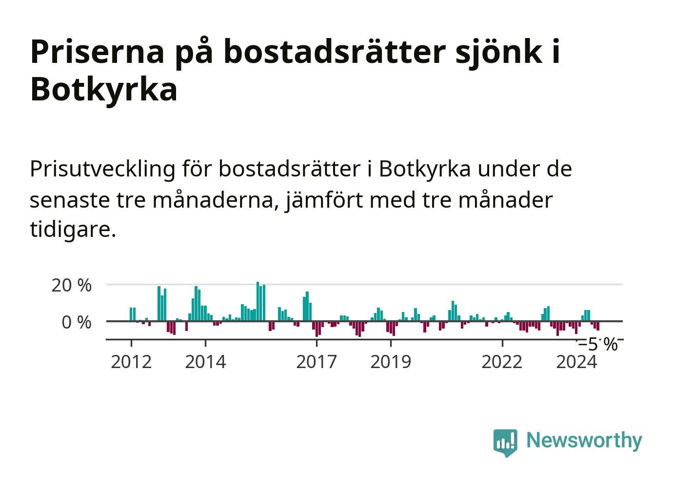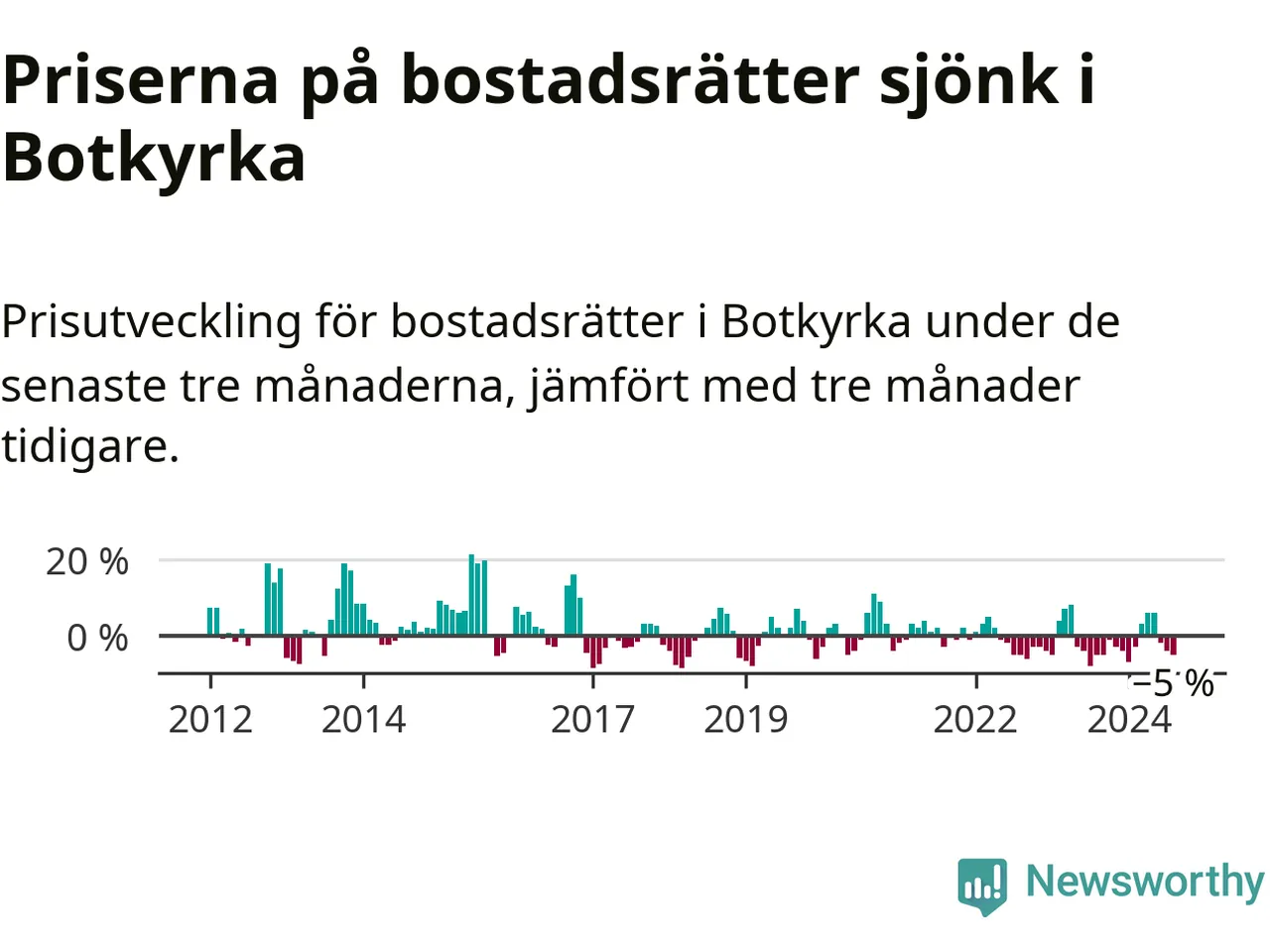 Statistiken visar även på en kännbar prisnedgång i Botkyrka kommun. Medelpriset på försäljningarna av bostadsrätter i kommunen var 5 procent lägre än för tre månader sedan. Även i hela Stockholms län sjunker priserna på bostadsrätter. I hela länet noterades en prisnedgång på 4 procent.