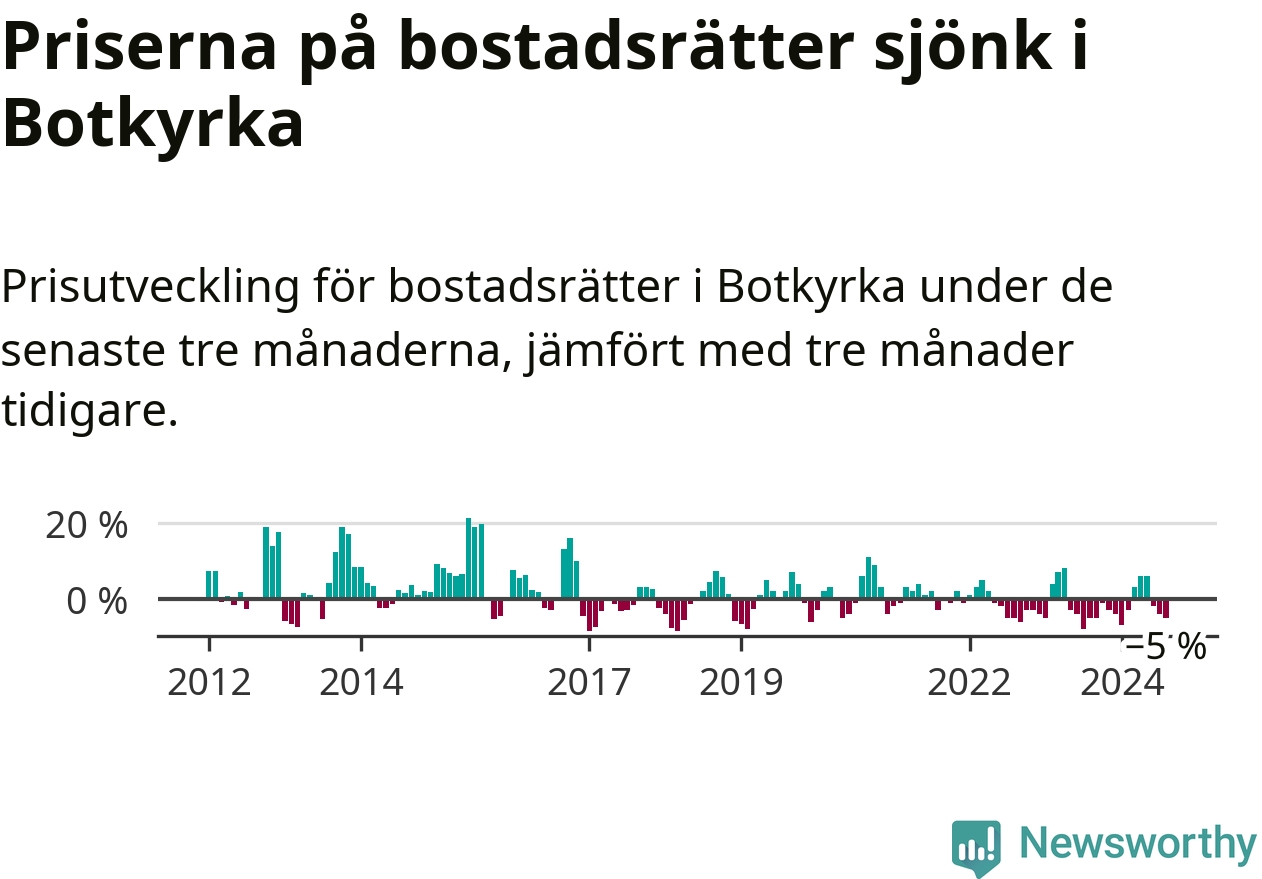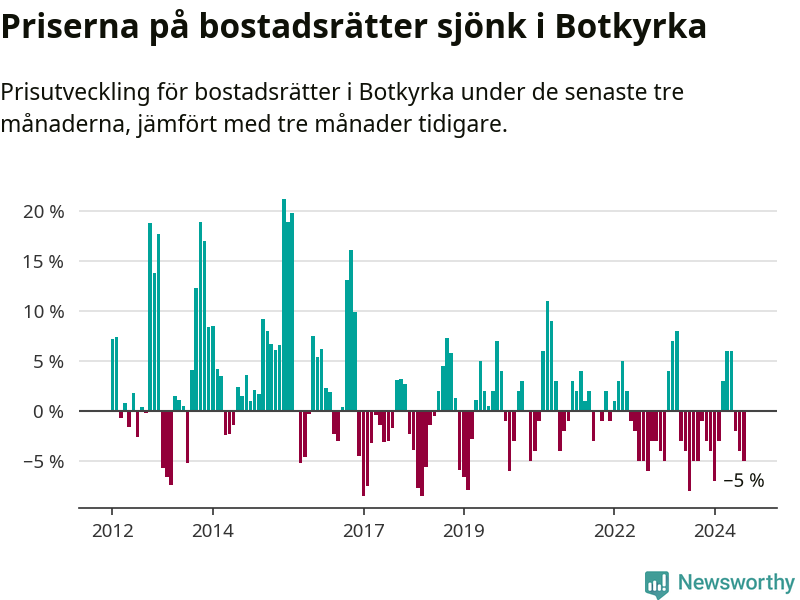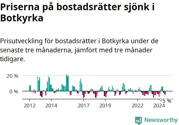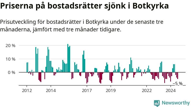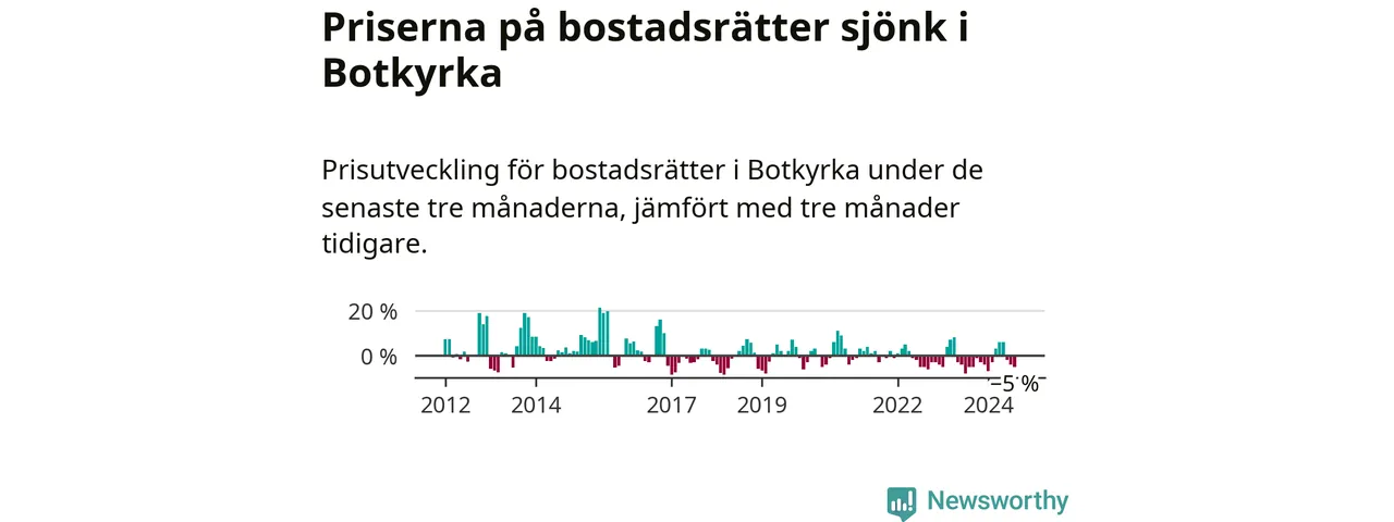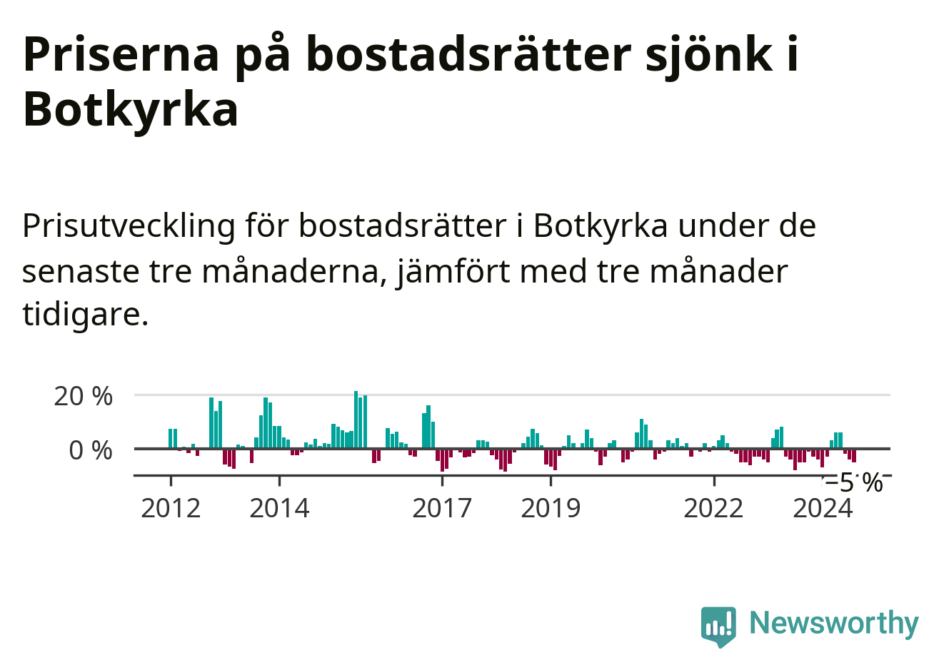 Statistiken visar även på en kännbar prisnedgång i Botkyrka kommun. Medelpriset på försäljningarna av bostadsrätter i kommunen var 5 procent lägre än för tre månader sedan. Även i hela Stockholms län sjunker priserna på bostadsrätter. I hela länet noterades en prisnedgång på 4 procent.
