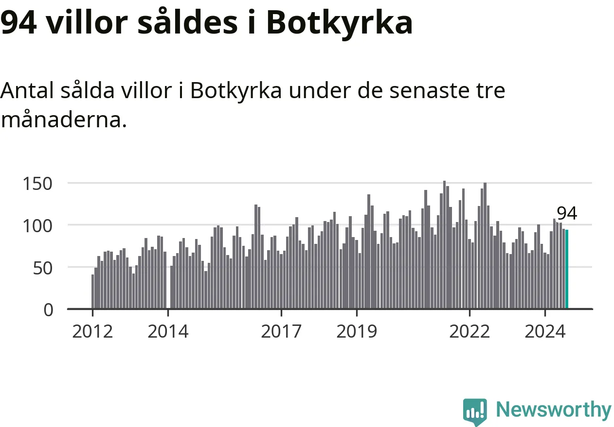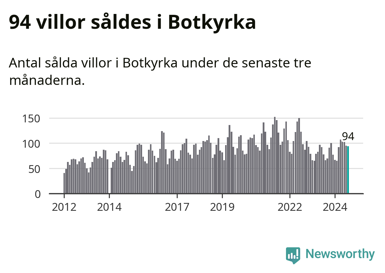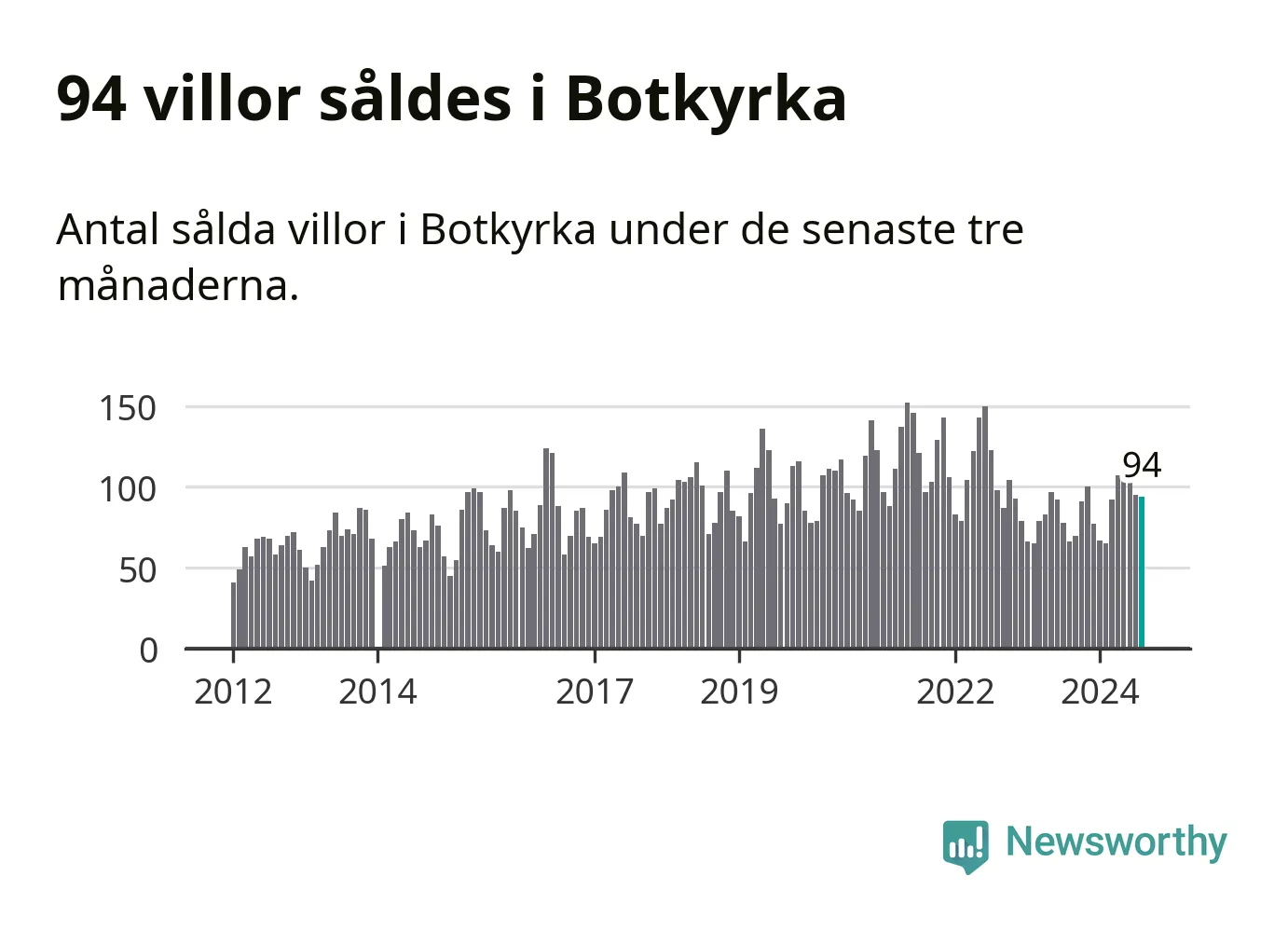 Mellan juni och augusti såldes 94 villor i Botkyrka kommun. Det är relativt många sett till aktiviteten på bostadsmarknaden i kommunen under de senaste tolv månaderna, samt det historiska snittet för den här tiden på året.