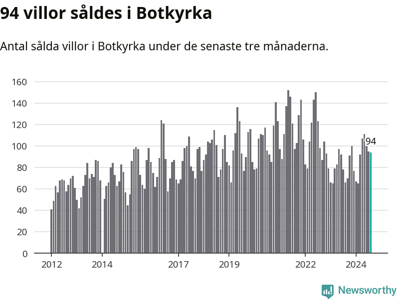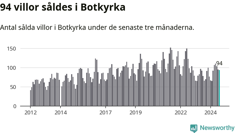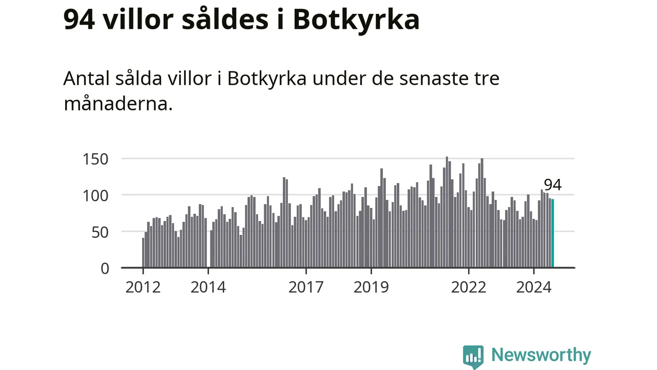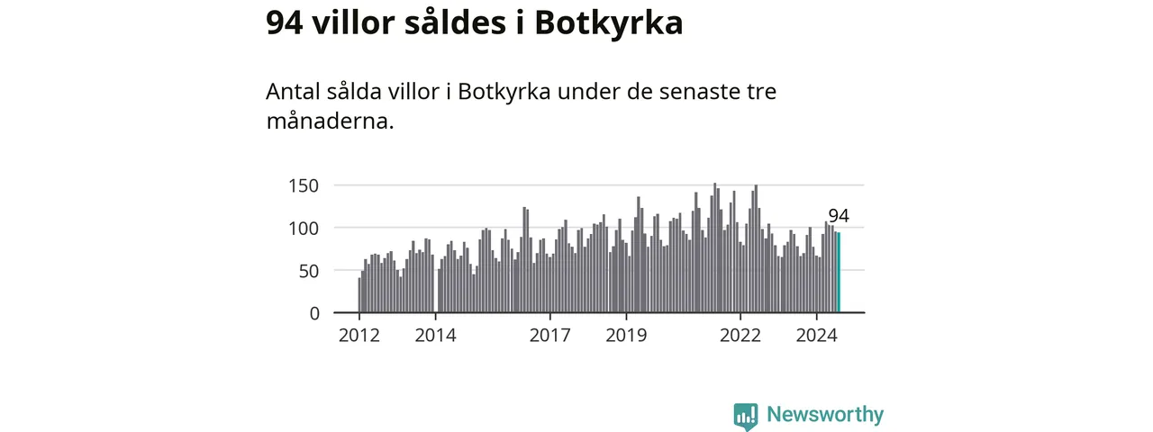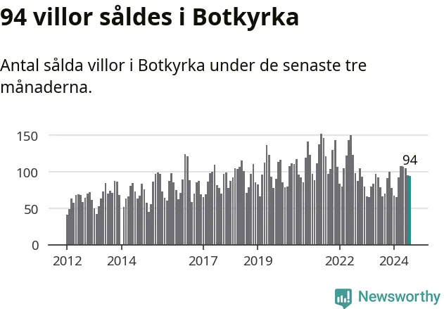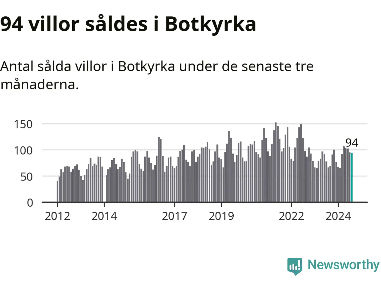 Mellan juni och augusti såldes 94 villor i Botkyrka kommun. Det är relativt många sett till aktiviteten på bostadsmarknaden i kommunen under de senaste tolv månaderna, samt det historiska snittet för den här tiden på året.