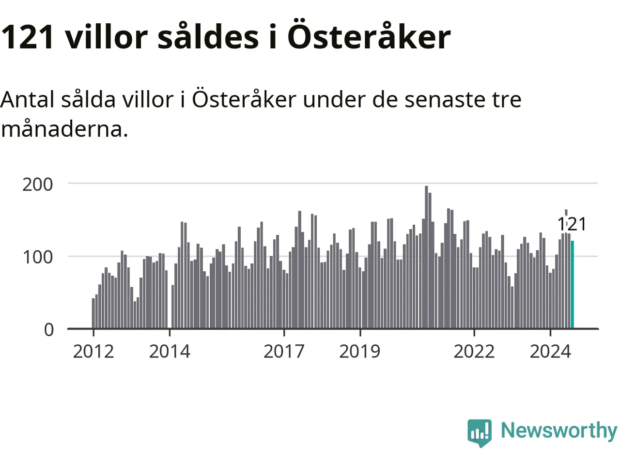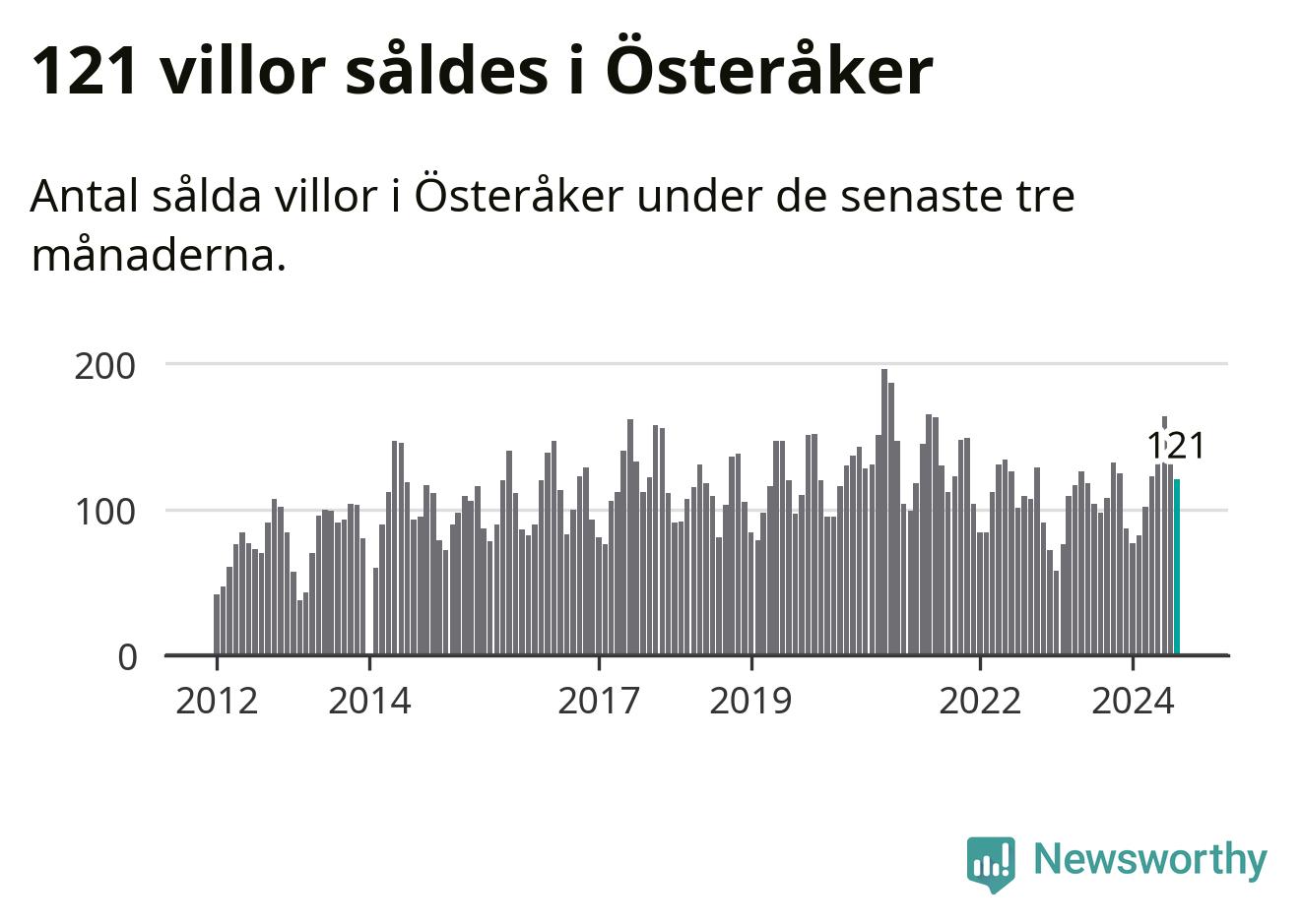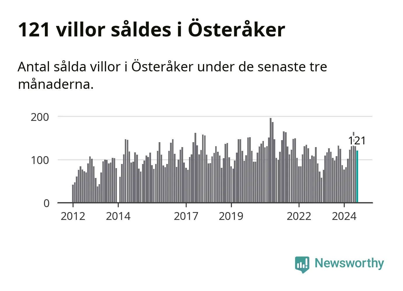 Sammanlagt såldes 121 villor i Österåkers kommun mellan juni och augusti till ett genomsnittligt pris på 5,6 miljoner kronor. I fjol gjordes 98 affärer vid den här tiden på året.