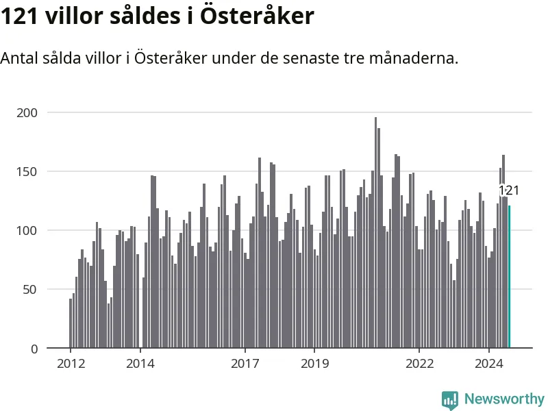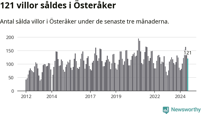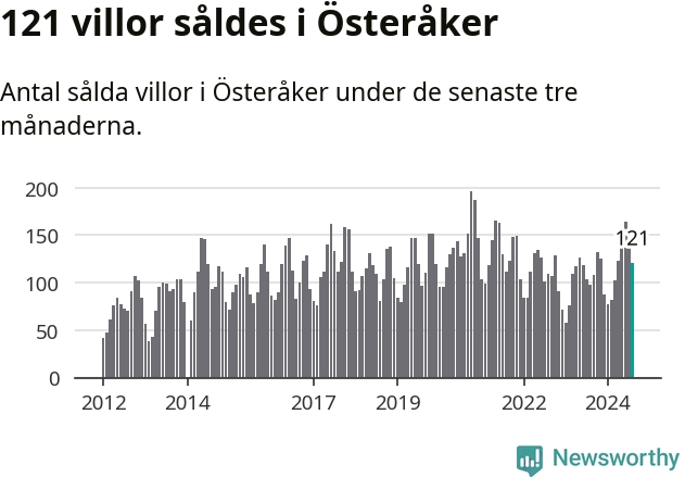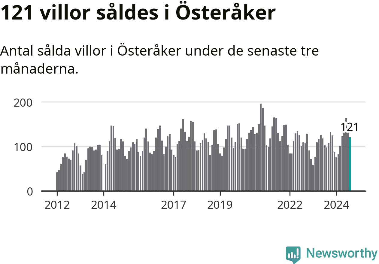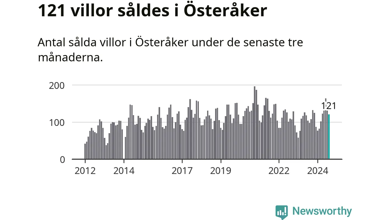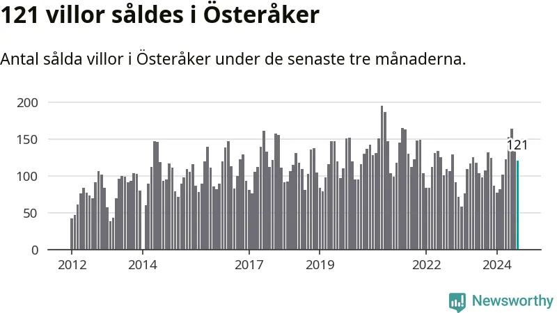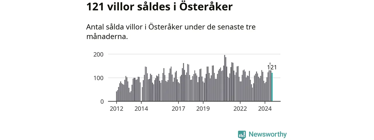 Sammanlagt såldes 121 villor i Österåkers kommun mellan juni och augusti till ett genomsnittligt pris på 5,6 miljoner kronor. I fjol gjordes 98 affärer vid den här tiden på året.