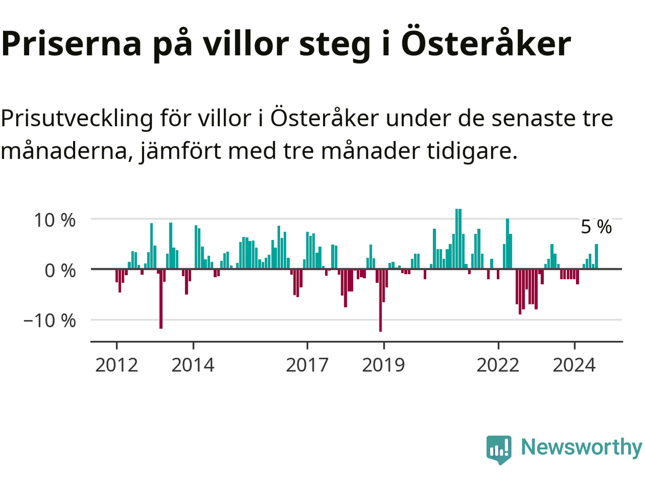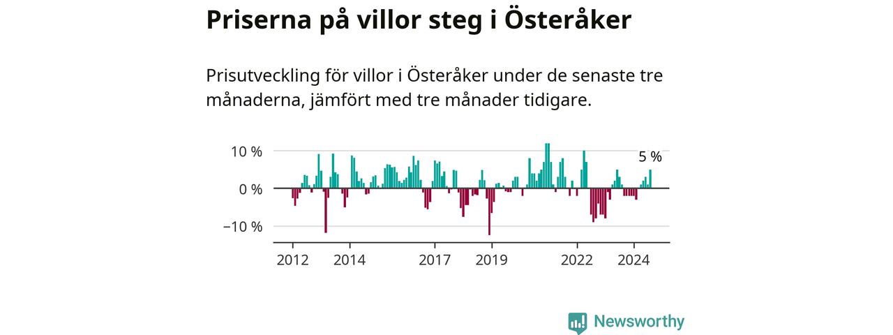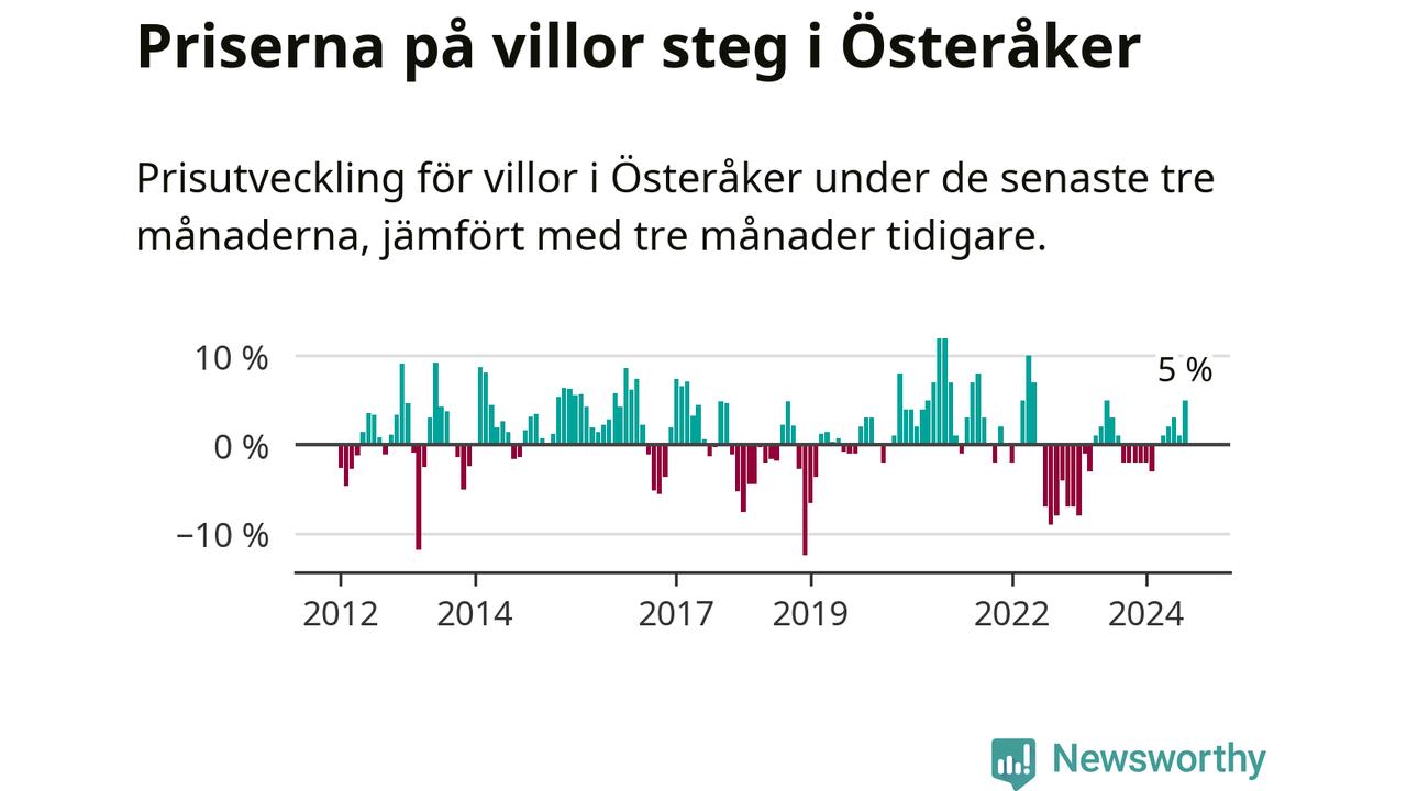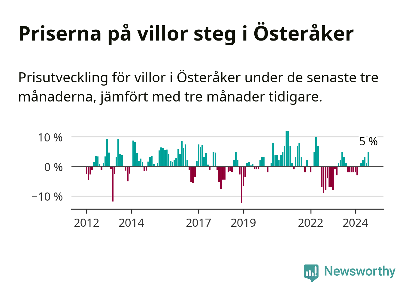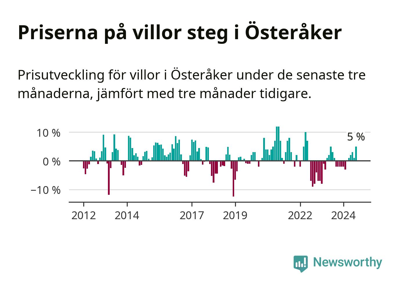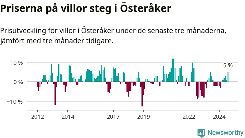 Villapriserna har gått upp i Österåkers kommun. Medelpriset på försäljningarna under de senaste tre månaderna visar på en uppgång med 5 procent.