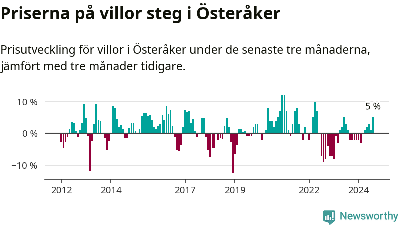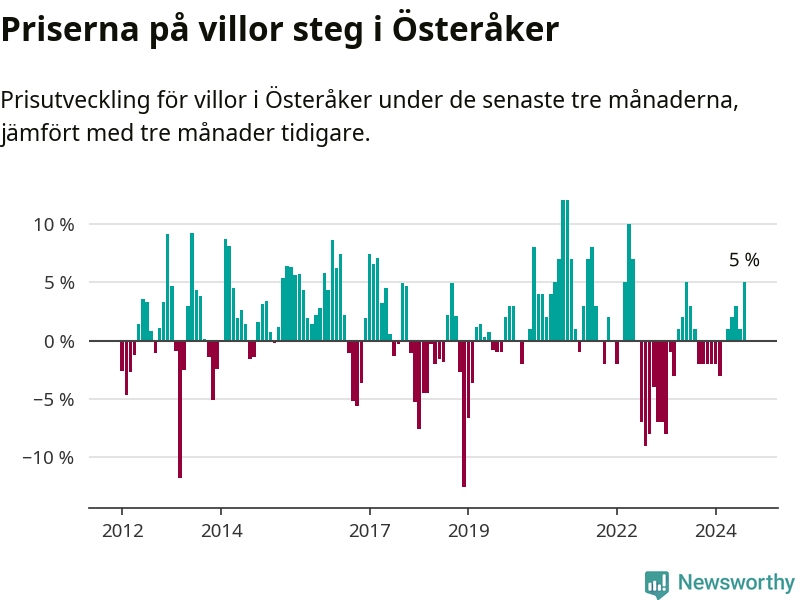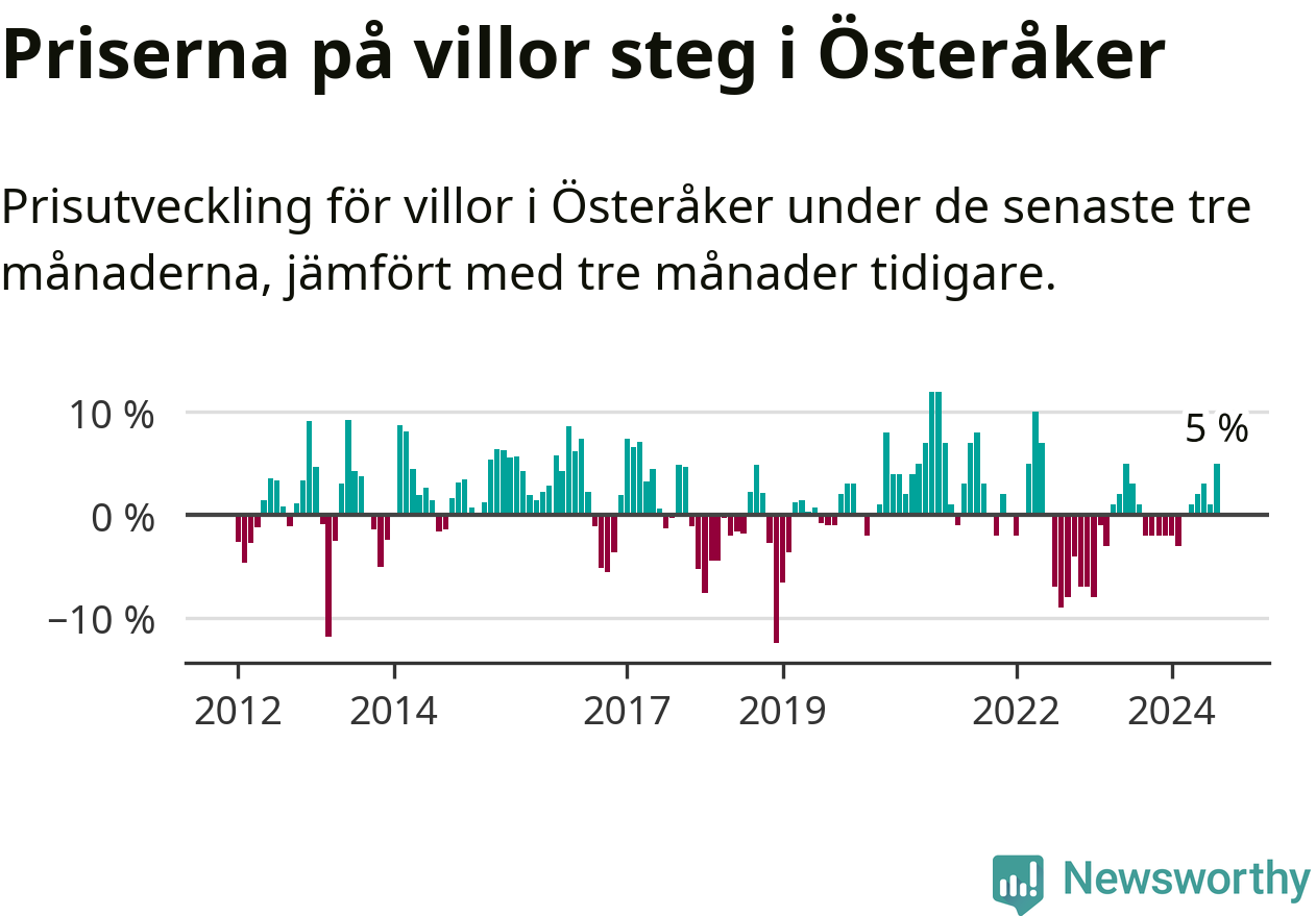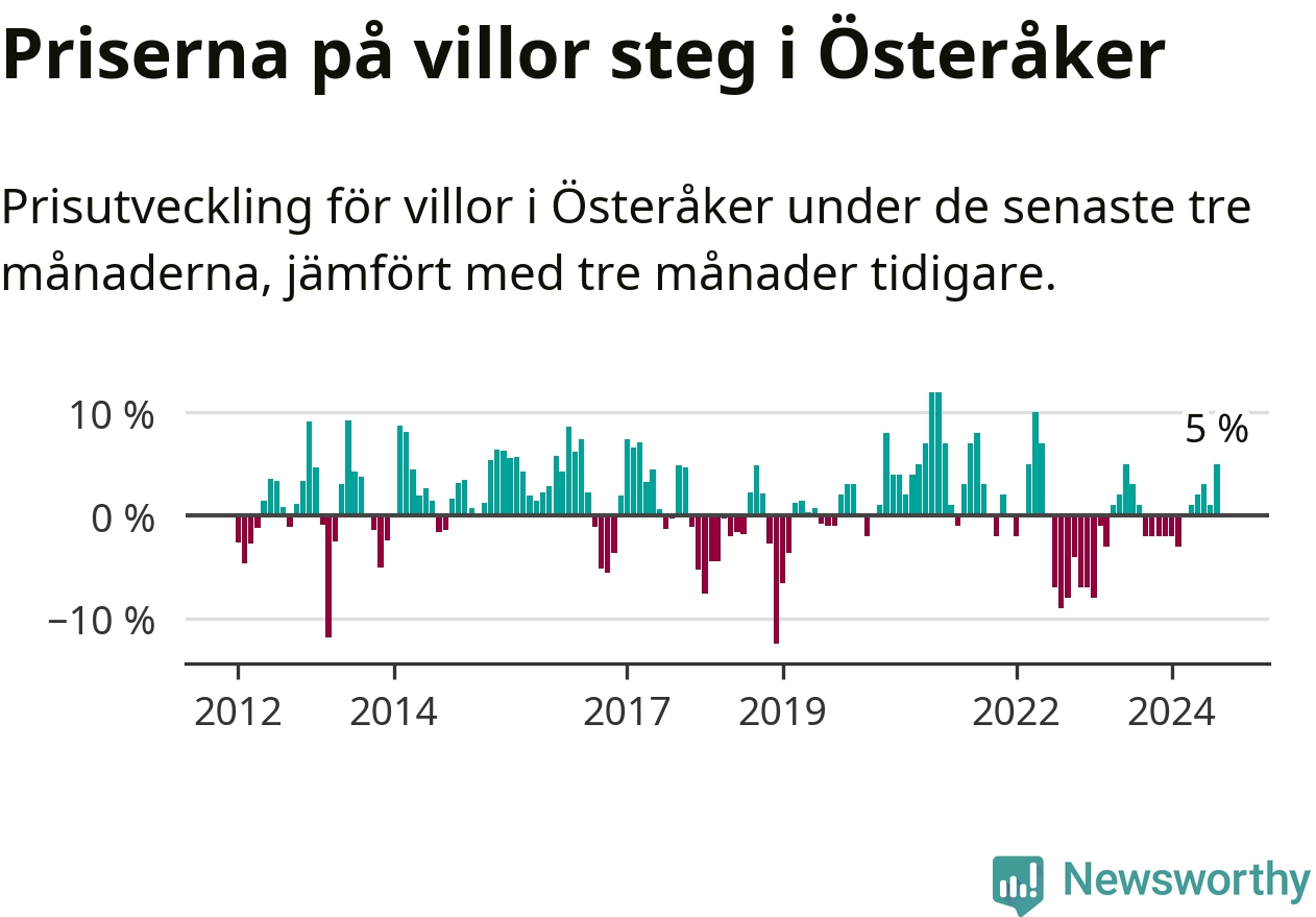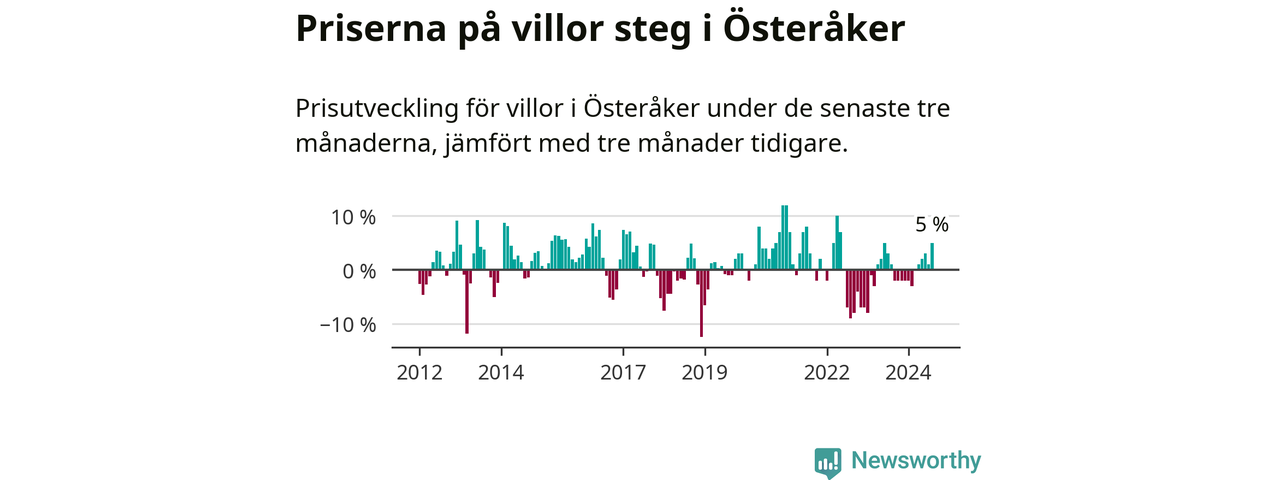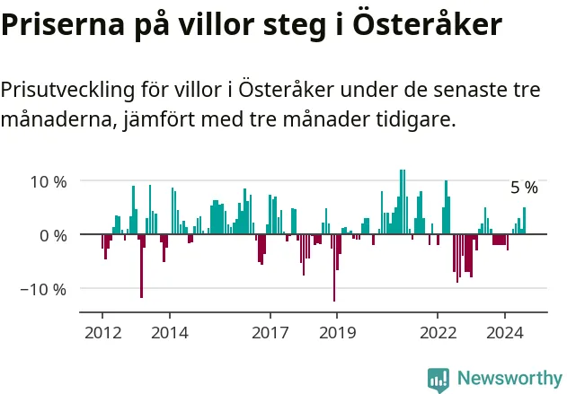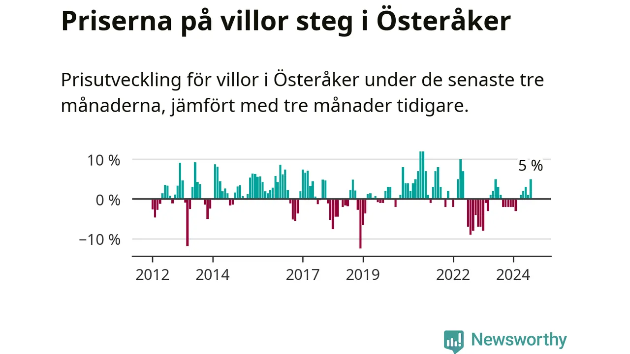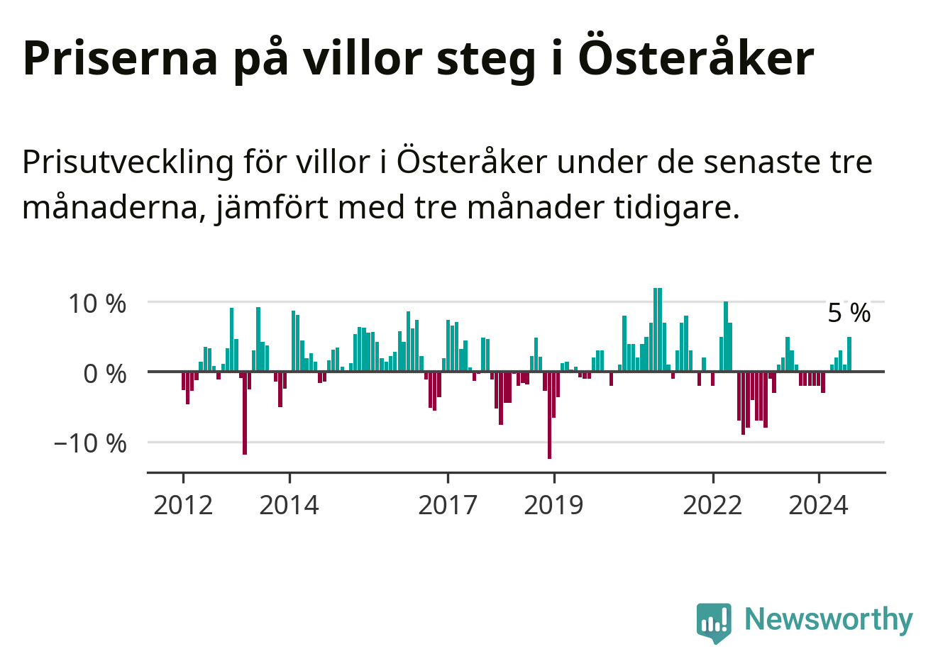 Villapriserna har gått upp i Österåkers kommun. Medelpriset på försäljningarna under de senaste tre månaderna visar på en uppgång med 5 procent.