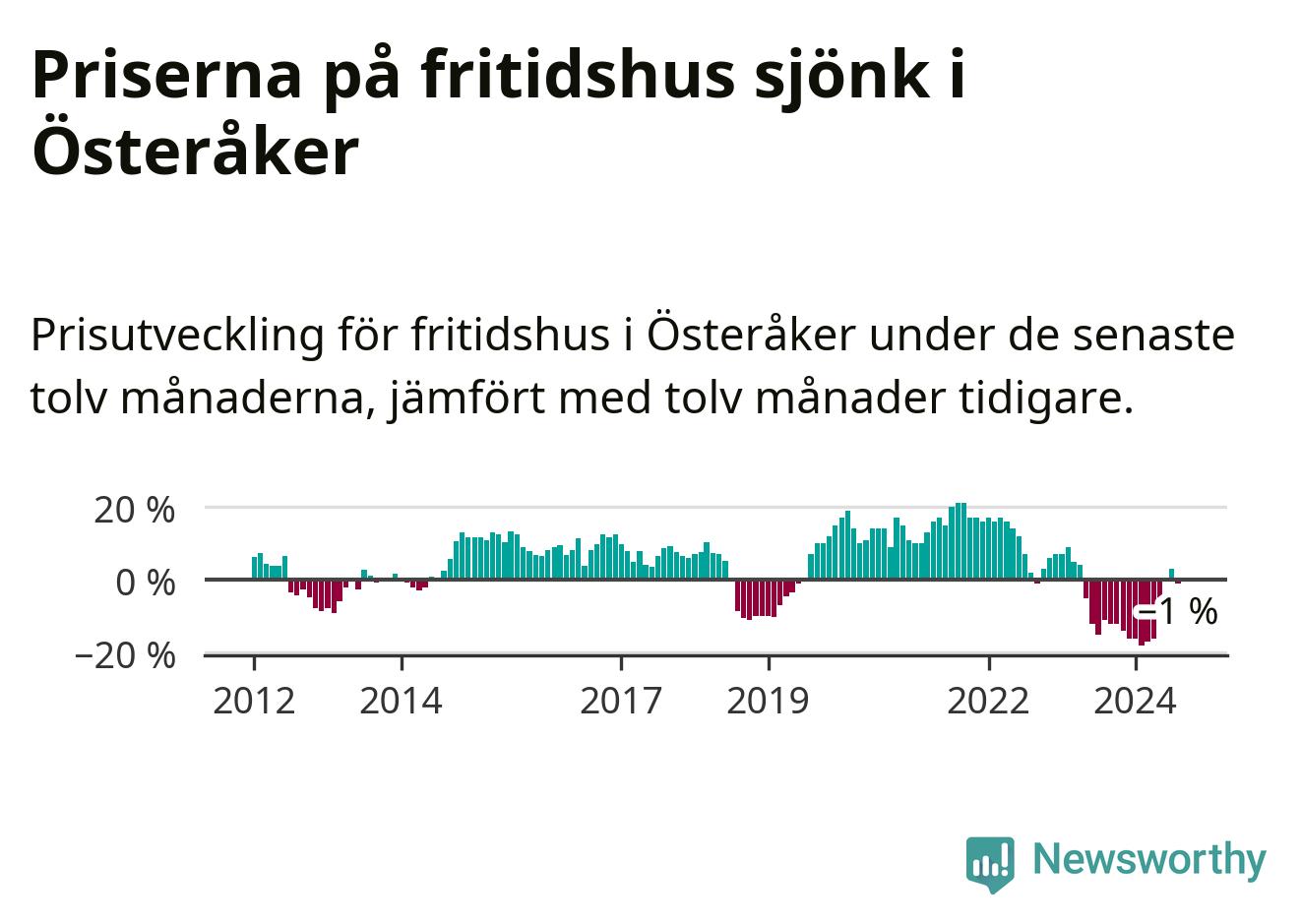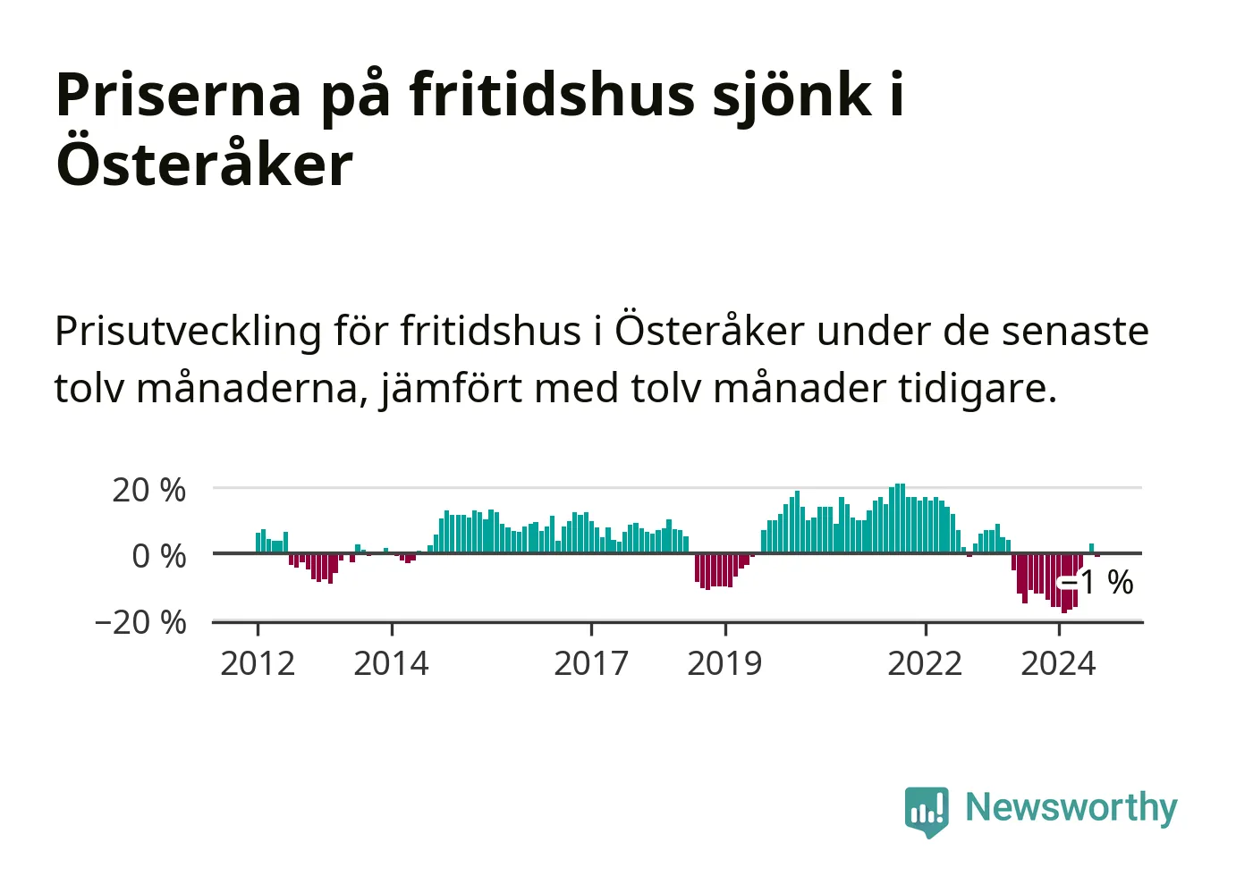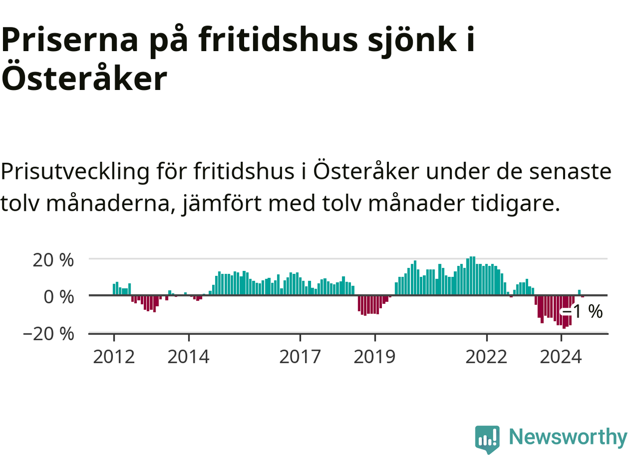 Priserna på fritidshus har gått ner i Österåkers kommun. Medelpriset på försäljningarna under de senaste tolv månaderna visar på en nedgång med 1 procent.