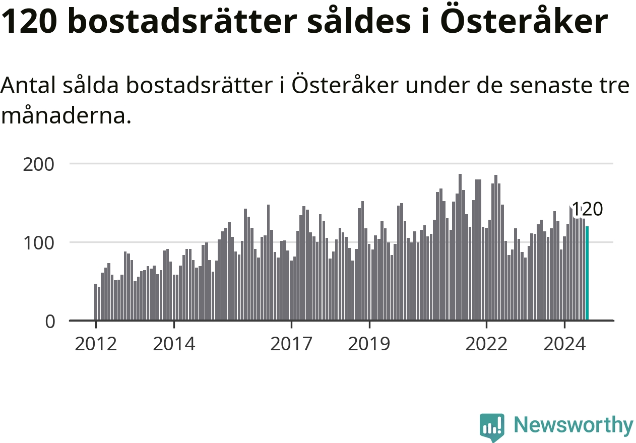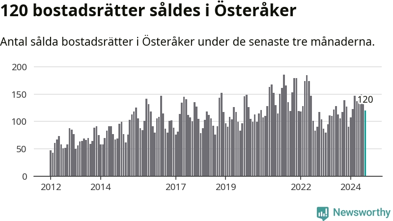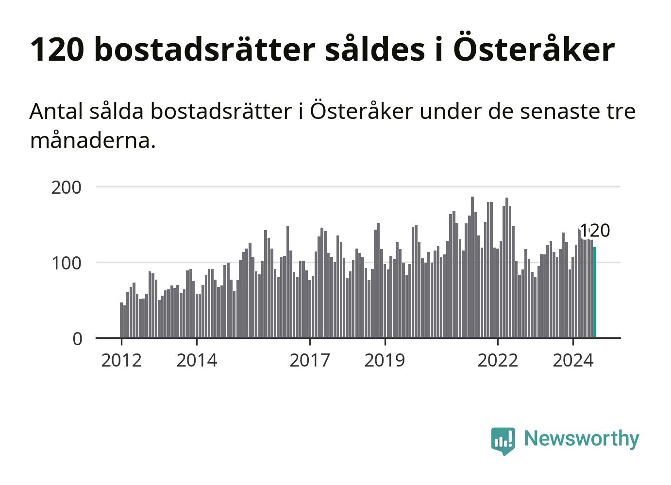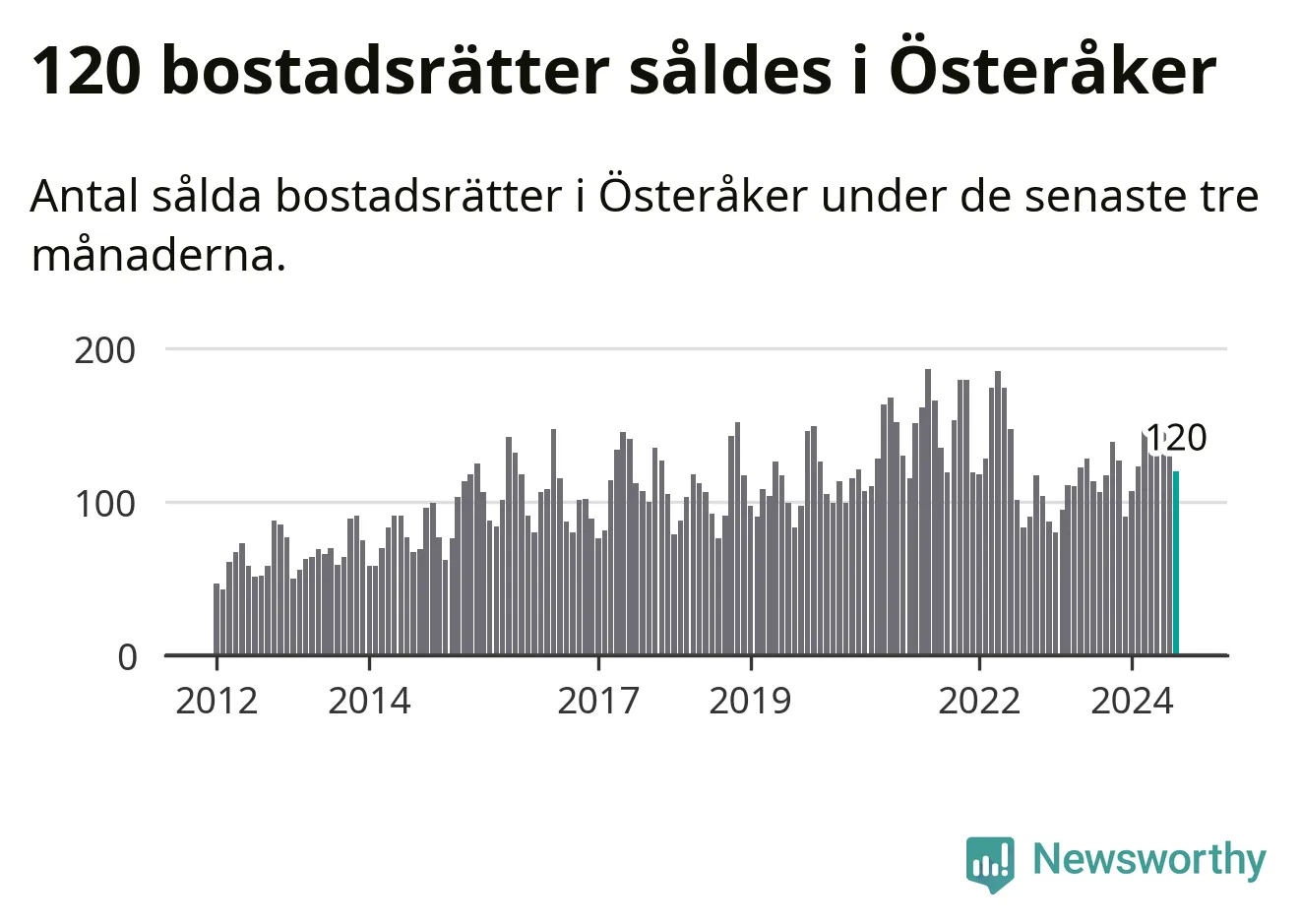 Sammanlagt såldes 120 bostadsrätter i Österåkers kommun mellan juni och augusti till ett genomsnittligt pris på 3,1 miljoner kronor. I fjol gjordes 106 affärer vid den här tiden på året.