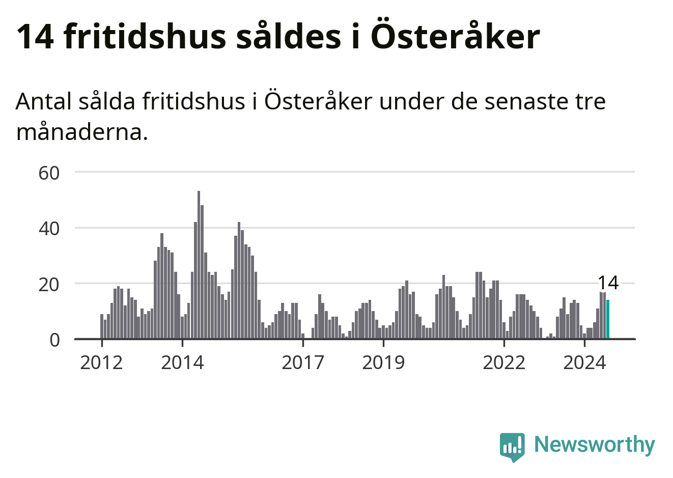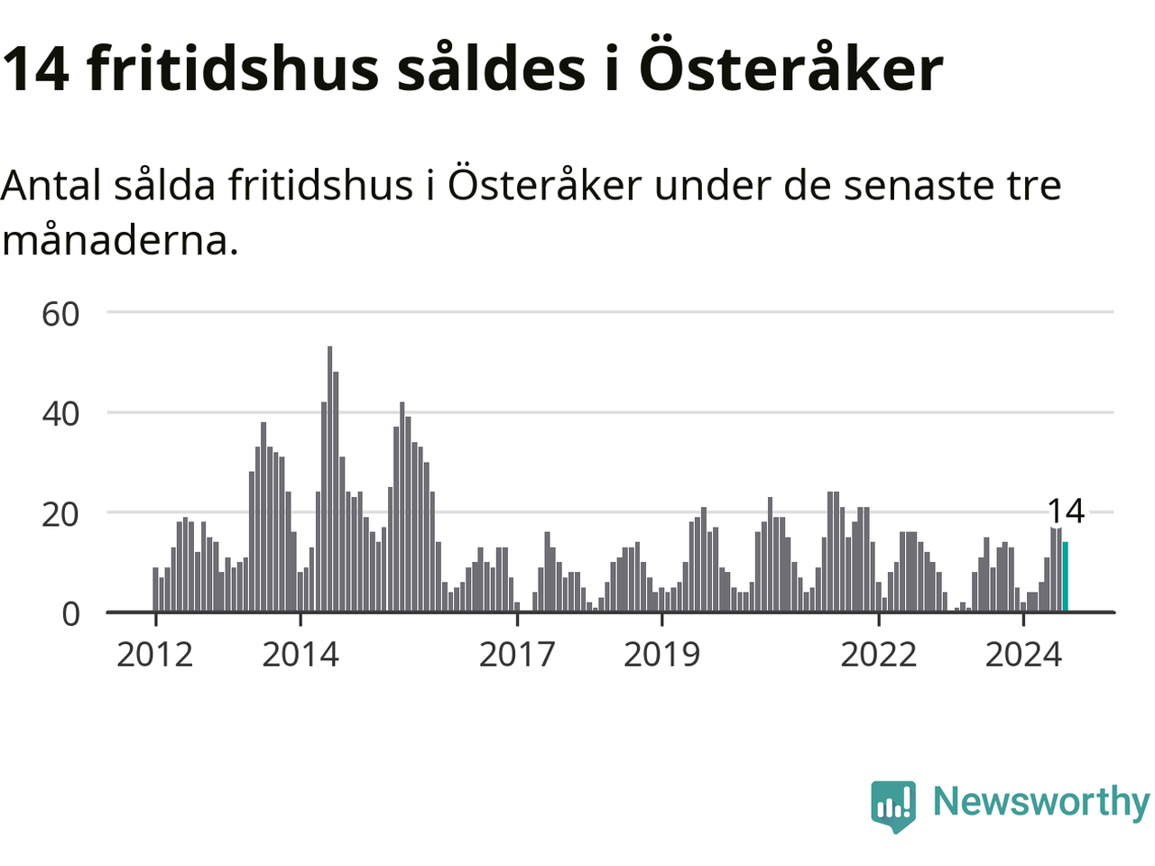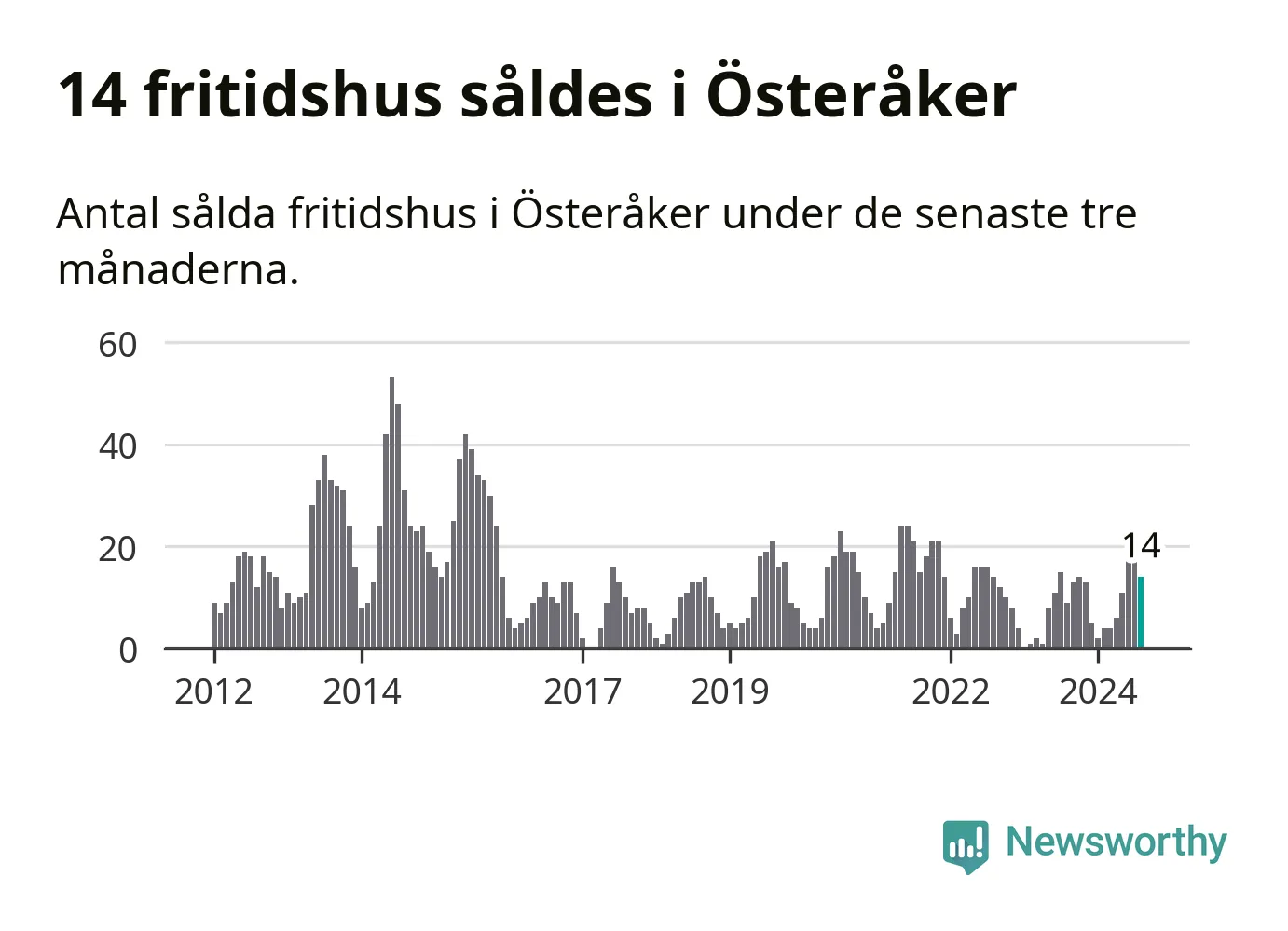 Sammanlagt såldes 14 fritidshus i Österåkers kommun mellan juni och augusti till ett genomsnittligt pris på 3,5 miljoner kronor. I fjol gjordes nio affärer vid den här tiden på året.