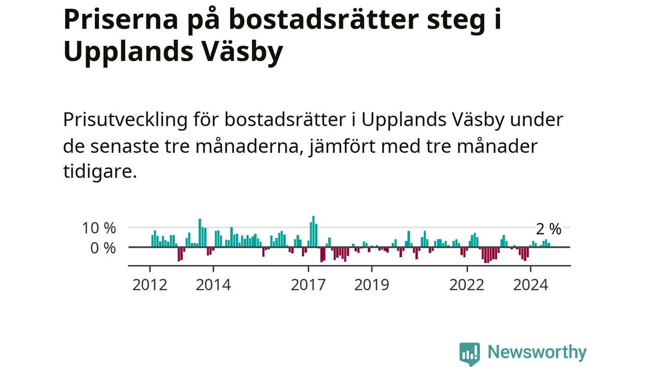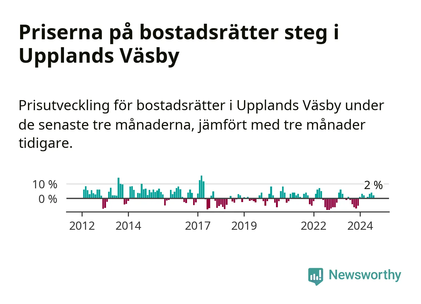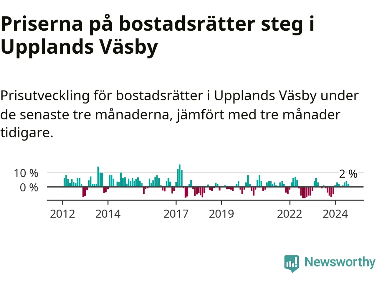 Priserna på bostadsrätter har gått upp i Upplands Väsby kommun. Medelpriset på försäljningarna under de senaste tre månaderna visar på en uppgång med 2 procent.
