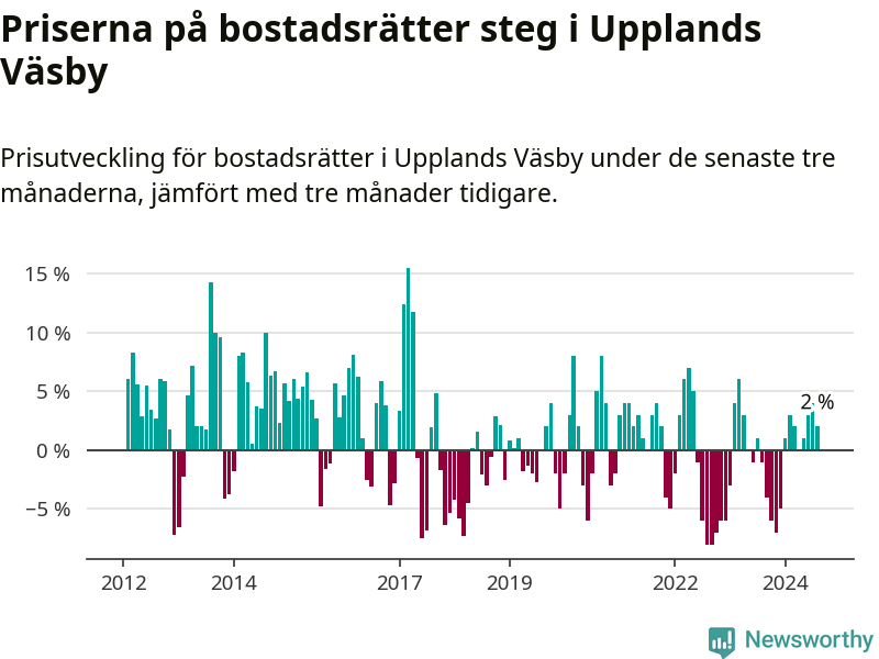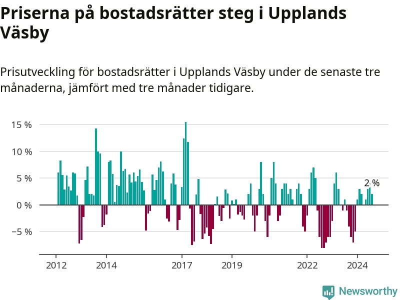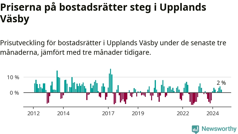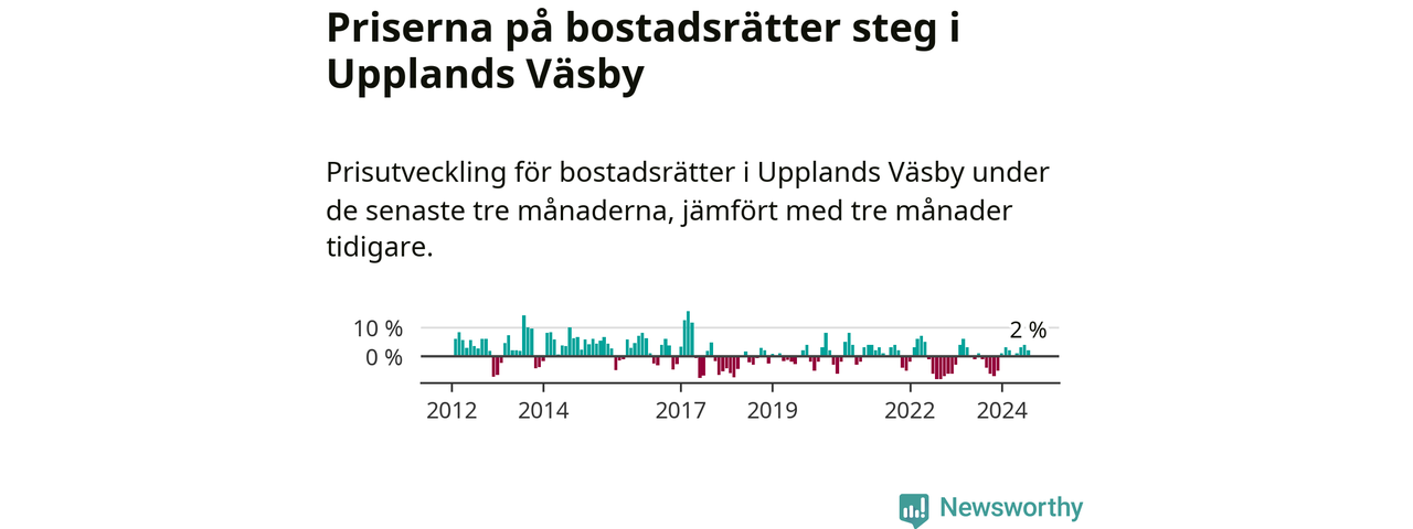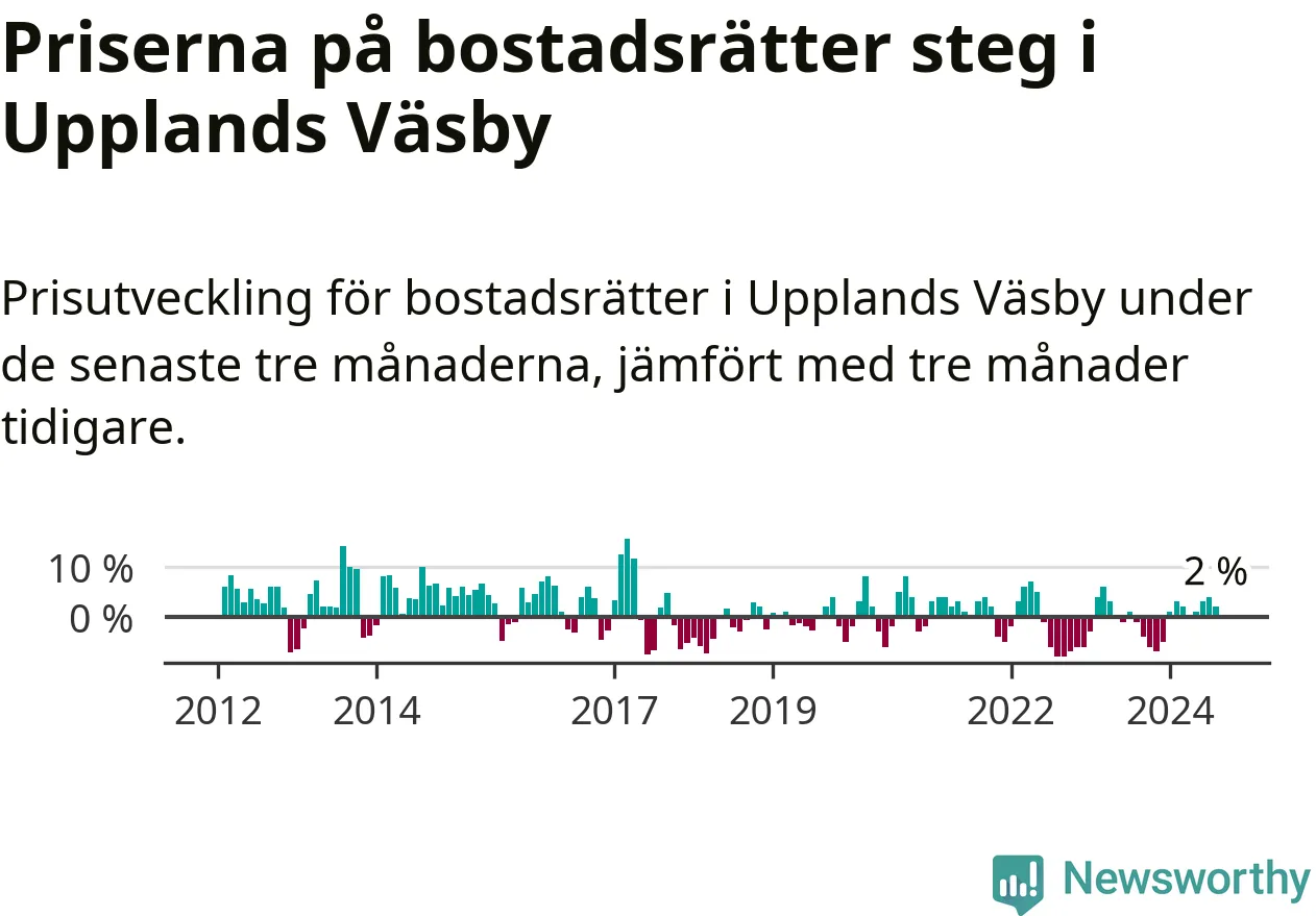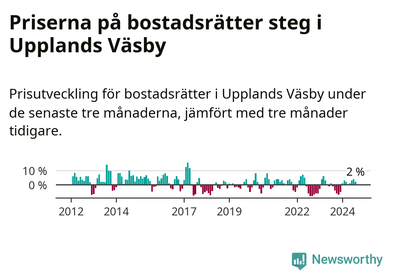 Priserna på bostadsrätter har gått upp i Upplands Väsby kommun. Medelpriset på försäljningarna under de senaste tre månaderna visar på en uppgång med 2 procent.